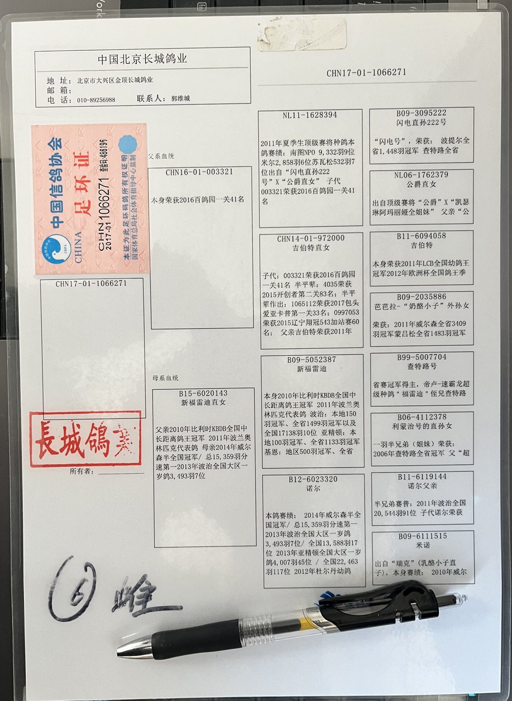 1617812 北京常成国际赛鸽公棚500公里决赛144名 雌 ¥300元 3次