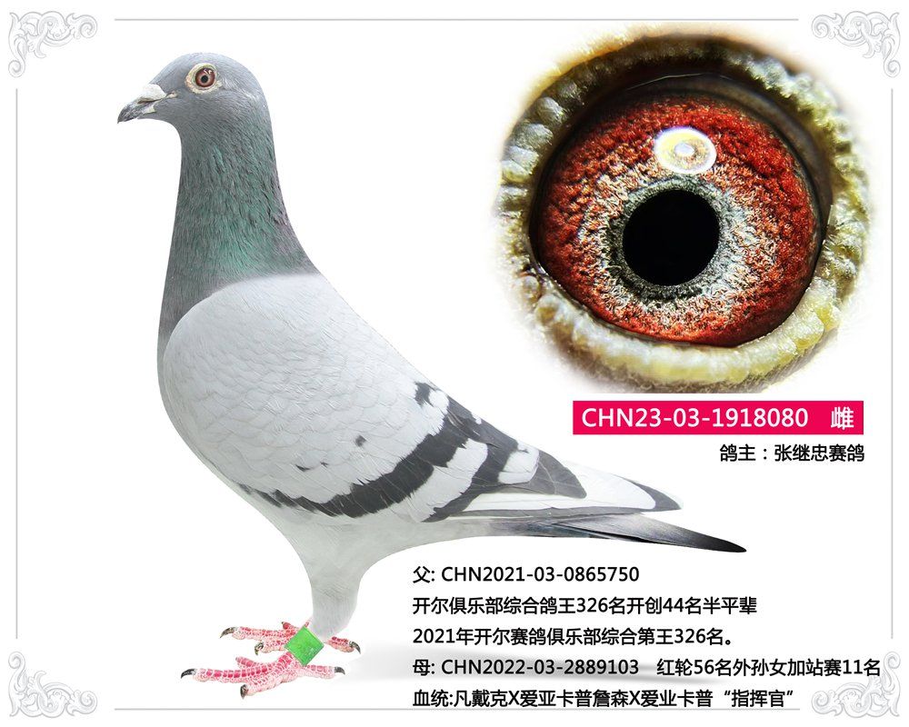 母: CHN2022-03-2889103 红轮56名外孙女加站赛11名 血统:凡戴克X爱亚卡普詹森X爱业卡普“指挥官” 本鸽2022年润祥公棚550公里11名;