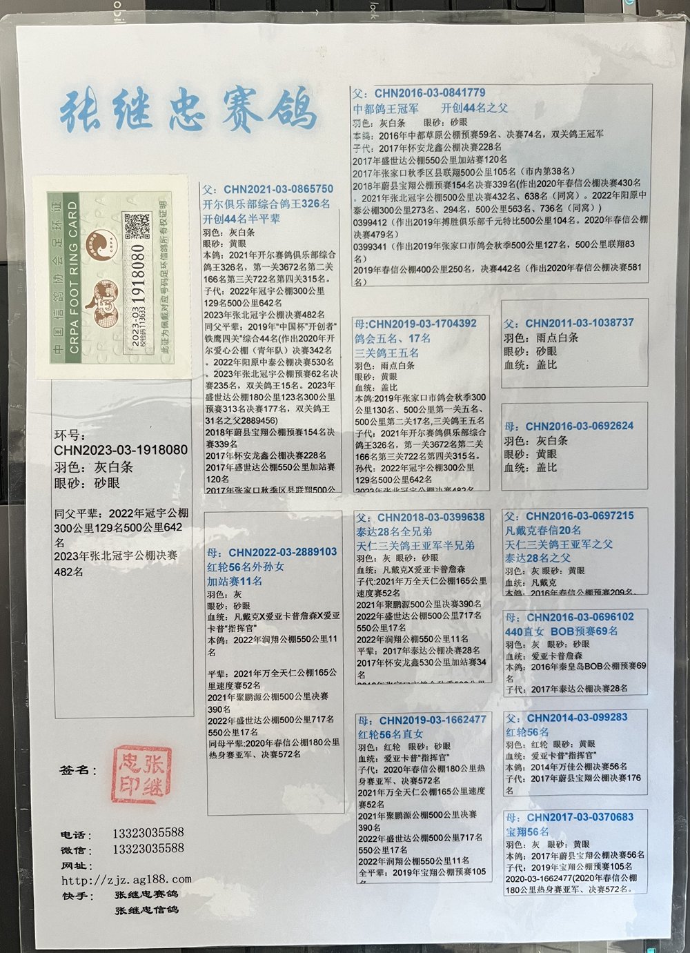 父: CHN2021-03-0865750 开尔俱乐部综合鸽王326名开创44名半平辈 2021年开尔赛鸽俱乐部综合第王326名。第一关3672名;第二关166名;第三关722名;第四关315名。子代: 2022年冠宇公棚300公里129名;500公里642名