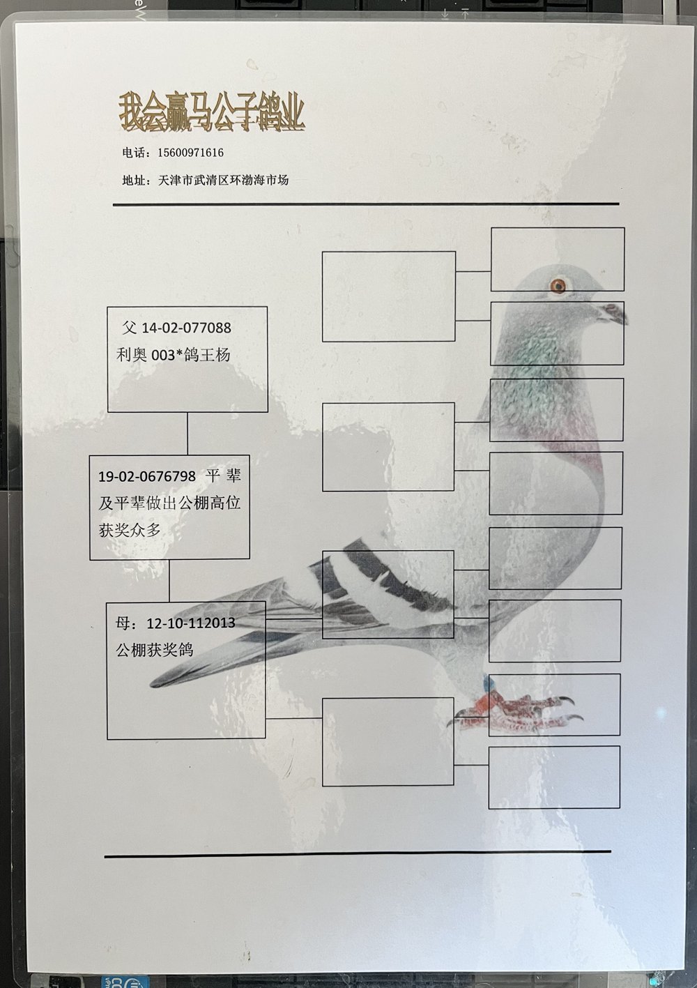 CHN19-02-0676798 雄 平辈做出公棚高位获奖众多 父:14-02-077088 利奥003x鸽王杨 母:12-10-112013 公棚奖鸽;鸽主:我会赢马公子鸽业 "咨询电话: 13601192027 白宇 (微信同号)运输方式:快递60/羽【新疆西藏包括】、长途车100元【不论羽数】、飞机400元"