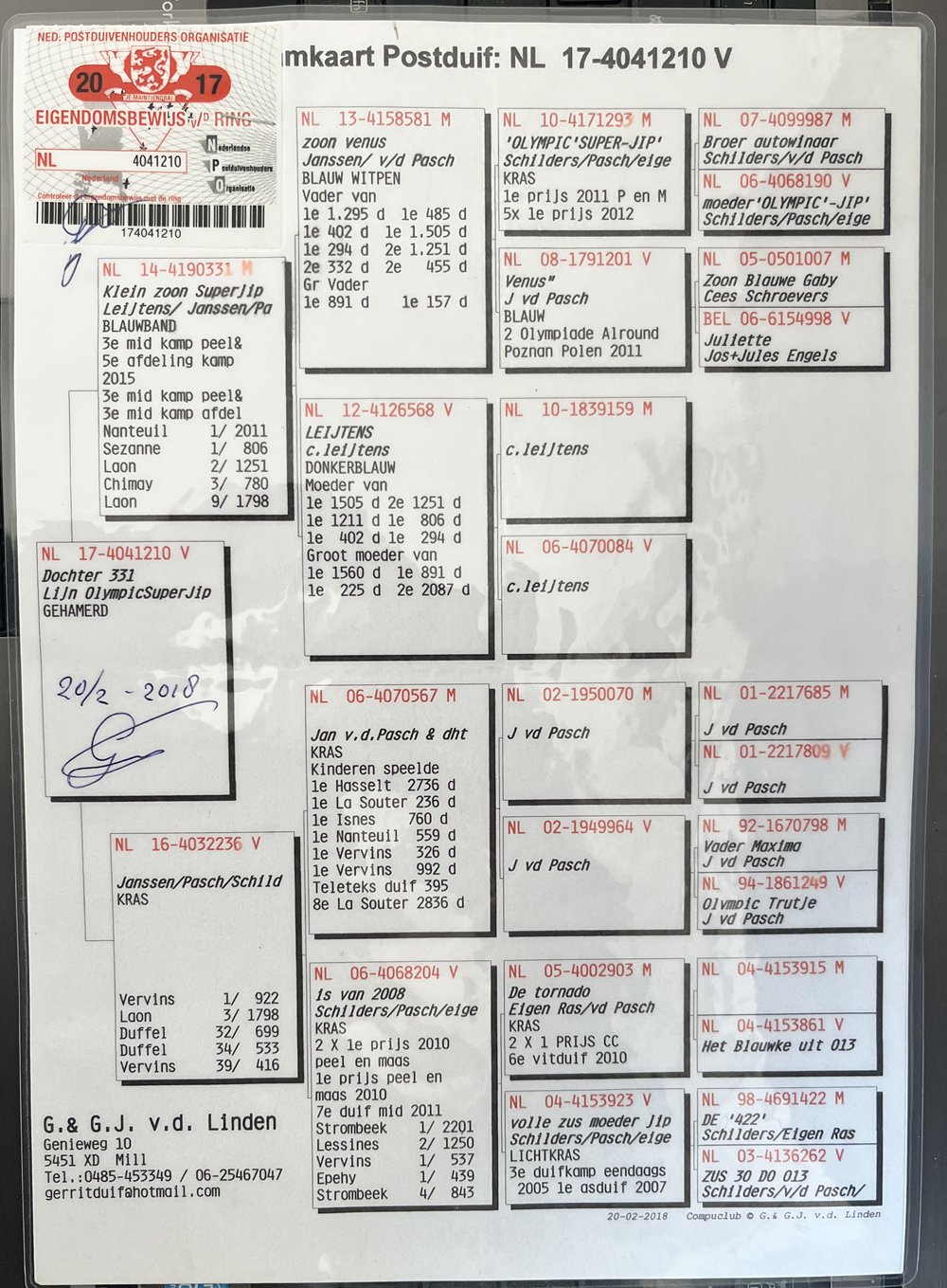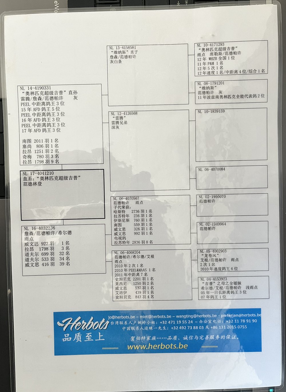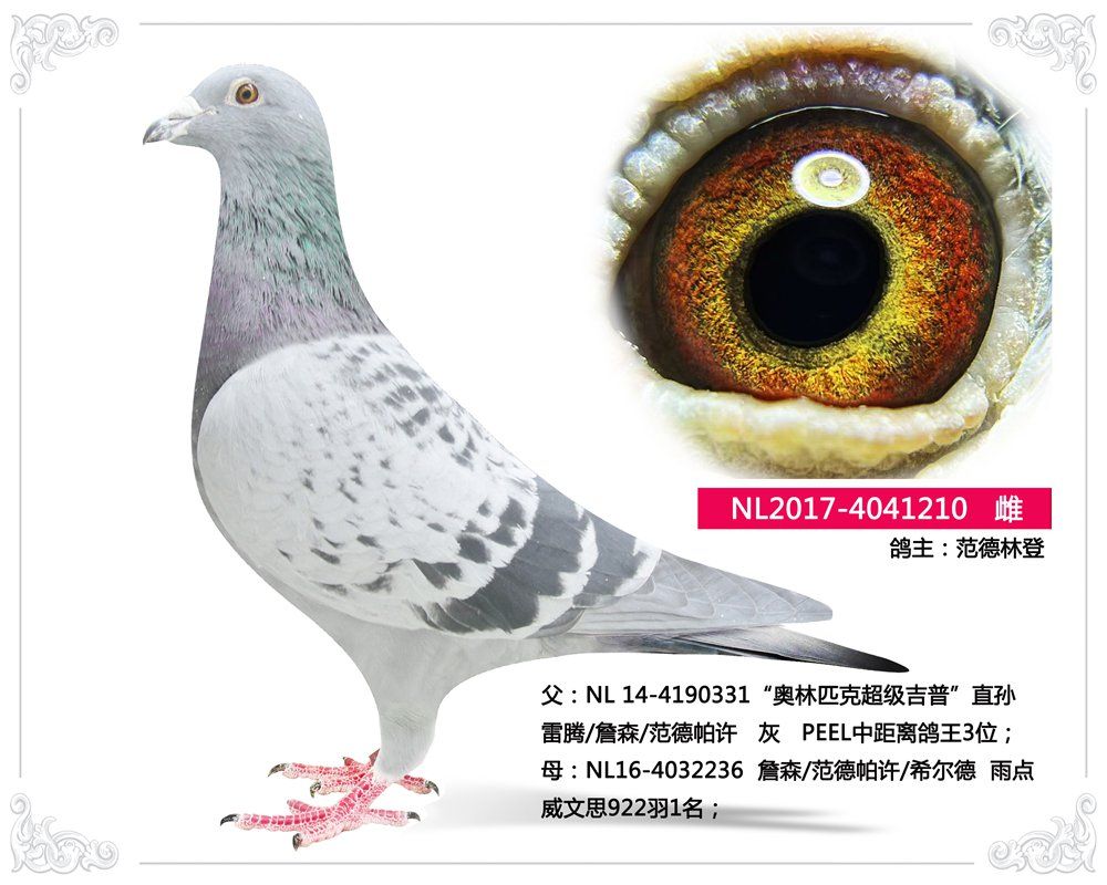 父:NL 14-4190331“奥林匹克超级吉普”直孙雷腾/詹森/范德帕许 灰 PEEL中距离鸽王3位;15年AFD鸽王5位;PEEL中距离鸽王3位;16年AFD鸽王3位;PEEL中距离鸽王3位;17年AFD鸽王3位;南图2011羽1名;塞尚806羽1名;拉昂1251羽2名;奇梅780羽3名;拉昂1798羽9名