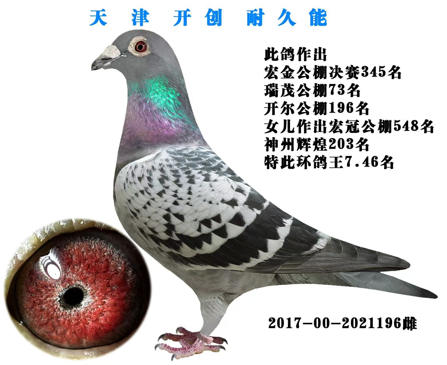 - 当前查看拍卖鸽:天津耐久能开创,镇棚金母,7羽获奖鸽缔造