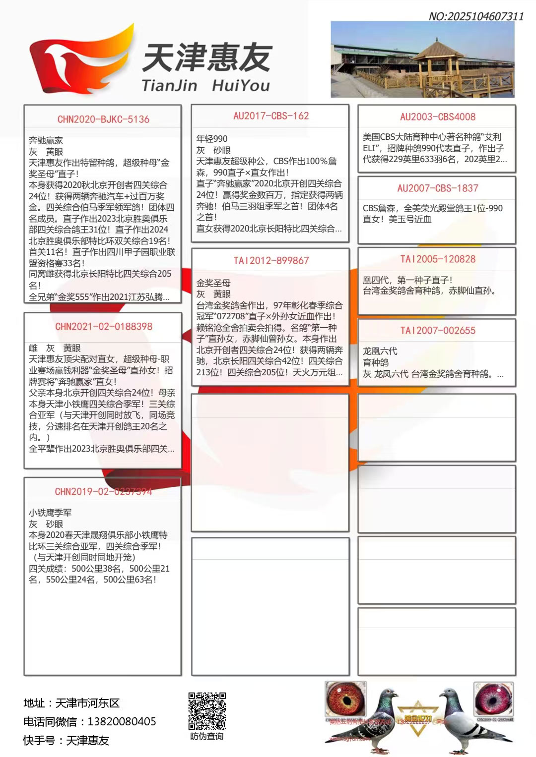 | 1618949 | 卡普黄金对孙代,做出3羽奖鸽401的同窝416 | ¥2000元 | 0次 |