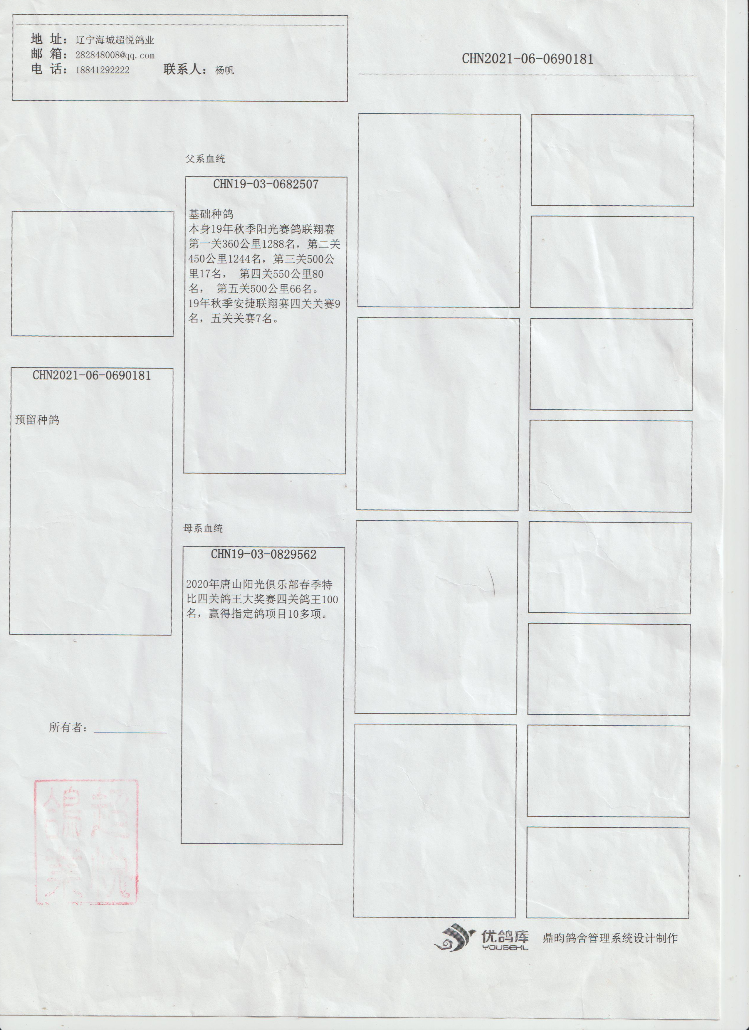 3、注明:请注意看种鸽和血统图片,有的种鸽环卡丢失,有些奖鸽无环卡和奖状和血统,介意请勿出价;