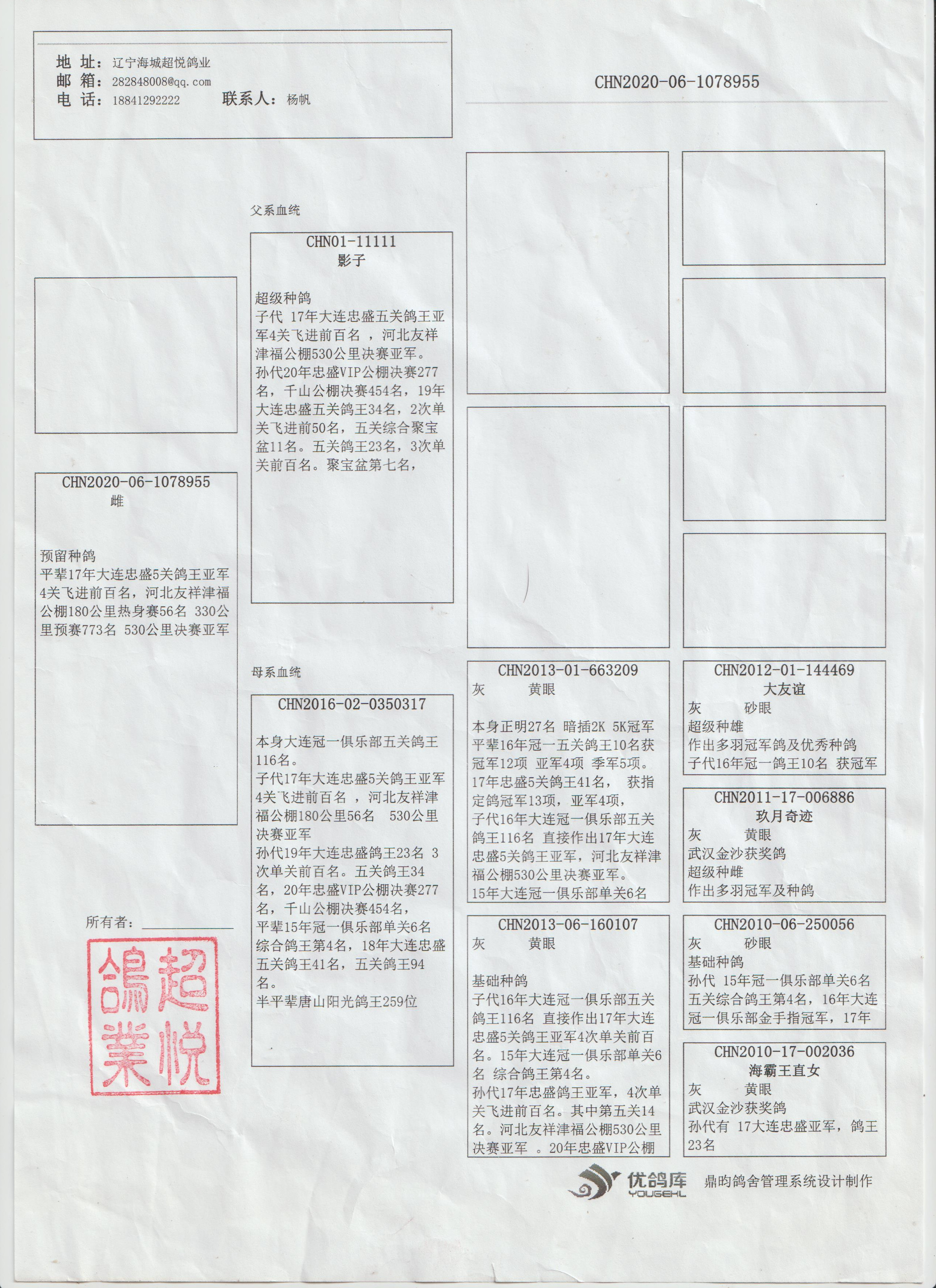 3、注明:请注意看种鸽和血统图片,有的种鸽环卡丢失,有些奖鸽无环卡和奖状和血统,介意请勿出价;
