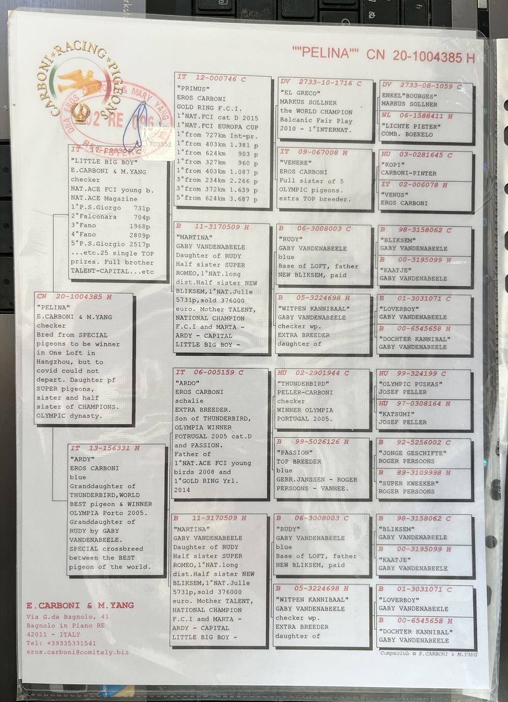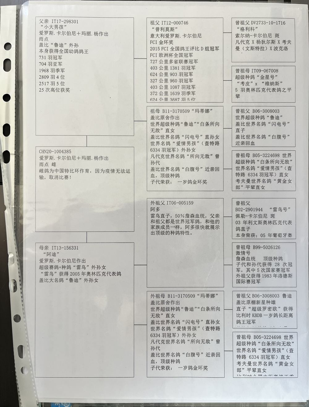 母亲:IT13-156331“阿迪”爱罗斯.卡尔伯尼作出 超级赛鸽+种鸽“雷鸟”外孙女 “雷鸟”获得2005年奥林匹克代表鸽盖比大名鸽“鲁迪”外孙女;