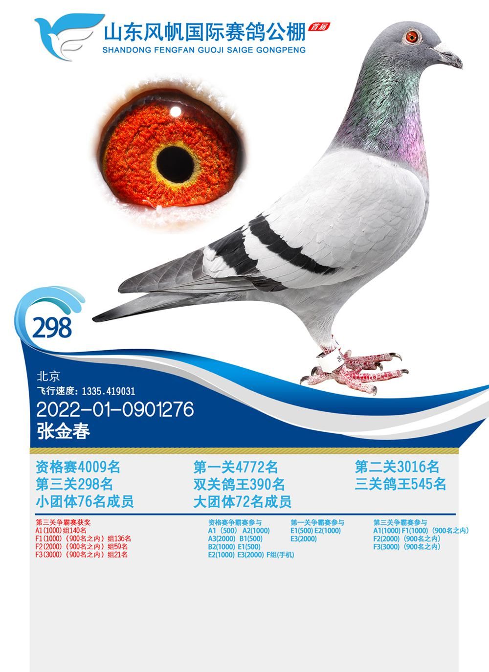 山东风帆国际赛鸽公棚180公里资格赛4009名;参与指定:9000元;
