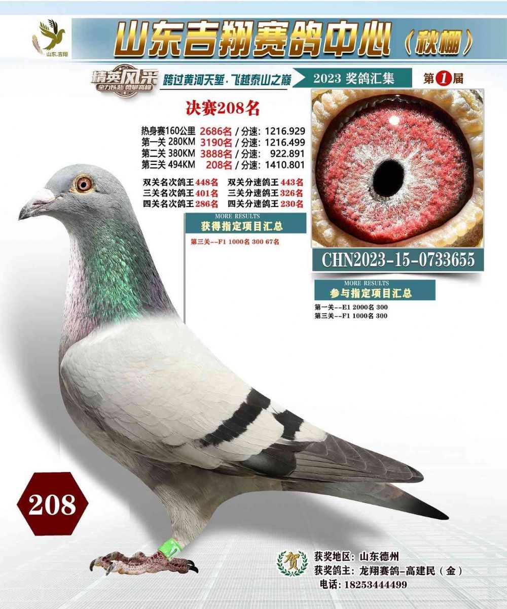 山东吉翔赛鸽文化交流中心秋棚494公里决赛208名;