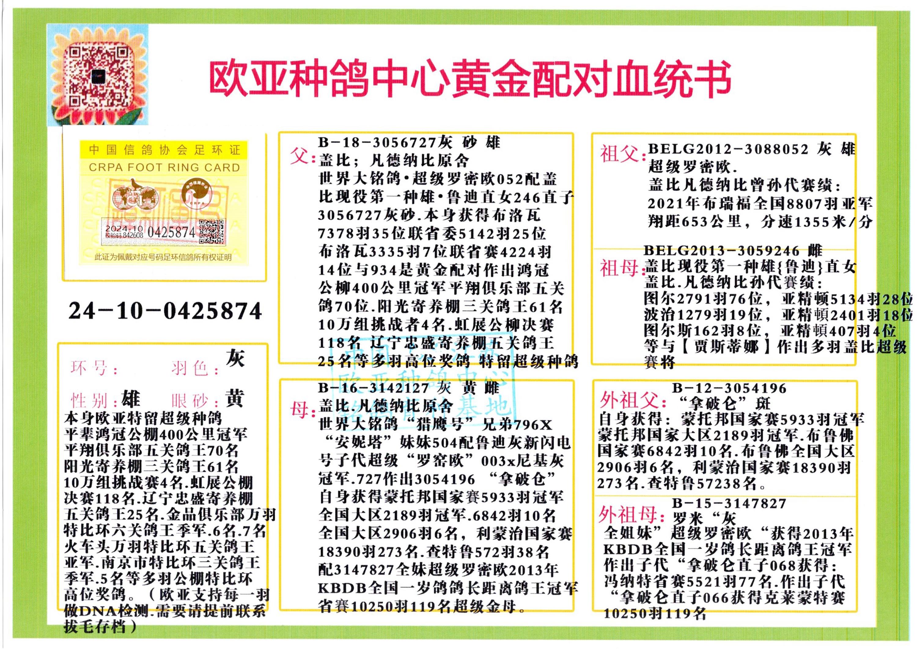 24年秋南京特比环欧亚荣获大团体冠军.小团体冠军551公里大特比13名.14名.16名.19名.20名.21名.24名.26名.27名.28名.42名.52名.54名.57名.65名.66名.68名.70名.71名.72名.74名.76名.80名.82名.83名.84名.85名.86名.90名.92名.110名.116名.121名.122名.128名.131名.158名.161名.164名.165名.166名.172名.174名.177名.182名.195名.196名.201名.205名.208名.210名.216名.253名.269名.275名.276名.294名.296名.299名,,24年秋云南天南铜都公棚决赛415名.天南铜都小棚决赛409名.云南玉活公棚决赛102名.490名.团体32名上笼二羽进二羽,天南铜都大棚506公里决赛445名。热烈祝贺河北省巨鹿县李兰生老师用欧亚泰山号血系连续十一年夺冠军,河北省国家赛冠军.全国季军等多次前十名高位,扬州王军王总用欧亚利奥24年春季获山东翔宇公棚决赛33名盖比53名。南京刘正龙刘总用欧亚盖比获得24年秋山东潍坊国际公棚决赛42名.精英赛30名.三关鸽王71名.决赛86名.加站赛16名.南京市特比环A组鸽王9名.B组鸽王5名.6名.C组鸽王5名.精英赛冠军4名.技能赛A组冠军4名.5名.秦淮区特比环荣获15名.46名.48名.87名。四川西昌徐亮徐总用欧亚利奥获得凉山州聚友决赛177名.第二关亚军双关鸽王19名.三关鸽王105名.云南豪庭公棚决赛603名。热烈祝贺24年四川重庆翔园鸽舍用欧亚泰山号荣获春季400公里冠军.秋季500公里冠军,河北王总用詹森X利奥获得千羽千翔公棚400公里冠军,广东蔡楷焕荣获24年秋爱好者 赛鸽俱乐部三关鸽王季军.一关420公里99名.二关450公里11名.三关520公里32名.单关季军.7名.12名,江西李卫兴荣获贵州红枫公棚8名.共翔俱乐部寄养棚四关综合鸽王30名.一关400公里78名.二关500公里55名.三关520公里37名.四关500公里57名.同父母获公棚18名.雷鸣获得武汉黄浦育翔中心冠军,四川陈文获得四川明鸿俱乐部300公里梦幻2名.3名.4名.9名.10名.13名.14名.15名.31名.34名.40名.41名.42名.43名.69名.71名.72名.73名.74名.94名.95名.97名.98名.99名.419公里决赛荣获总冠军7名.总共归巢9羽,四川徐亮获豪庭决赛603名,山西郑勇获得山西泰鑫公棚决赛255名詹森红狐,热烈祝贺马总获得开尔(飞跃队)决赛9名获奖金1310000万元.第一关52名,天津津福资赛180公里96名.获奖金429543万元,欧亚支持全国鸽友24年秋多人报喜 祝大家取得更好成绩,给欧亚报喜鸽友欧亚决定给每人赠送一羽超级种鸽。欧亚俱乐部特比环多关鸽王成绩:15年秋淮安特比环黑色星期一全会上笼9700多羽,当天无鸽归巢,第二天全会归巢357羽,本舍归巢158羽.前十名八羽.前一百名归巢57羽,16年春季获五关鸽王总冠军,总亚军四名.六名.七名.九名.十名.晶艺俱乐部520公里冠亚季军5名.6名.7名.9名.11名等,火车头冠军.季军6名.8名.9名.10名,16年秋晶艺俱乐部特比环520公里亚军.季军4名.6名.7名.9名,15年春南京白下特比环冠军.亚军.季军6名.7名.8名.9名.10名.指定鸽A B组获得冠军.亚军.季军4名.5名.,17年淮安特比环亚军.4名.5名.7名.8名.10名.六关鸽王总冠军.4名.6名.9名.10名,寄养棚宿迁刘总20羽特比环获冠军.季军.4名.7名.8名.9名等。18年荣获万羽特比环六关鸽王总冠军.总亚军.总季军.6名.8名.十名.单关四羽冠军.二羽亚军.四羽季军.前十名27羽。19年秋万羽特比环六关鸽王总亚军.总季军.5名.8名等,单关二羽冠军.三羽亚军.一羽季军前十名31羽。20年秋淮安市鸽会四关特比环大赛风雨无阻鸽王亚军.鸽王六名,金品俱乐部万羽特比环六关鸽王总冠军,总亚军.四名.五名.六名.七名.八名.十名.前二百名鸽王35羽,单关冠亚季军前十名四十多羽,火车头五关鸽王季军.六名.八名.前二百名鸽王十七羽。20年春荣获淮安五区一市四关鸽王总冠军.亚军.四名.八名.九名。21年秋荣获金品万羽特比环大赛六关鸽王总亚军.总季军.四名.七名.九名.十名.单关冠亚军季军前十名三十多羽。火车头协会鸽王六名.七名.十名.单关前十名十七羽。22年秋荣获鸽王总冠军.总亚军.5名.7名.8名.9名.11名.单关冠亚季军前十名三十多羽,第一关单关前二百名四十多羽,第二关前二百名三十多羽,第三关前二百名四十多羽,第四关前二百名四十多羽,第五关前一百名53羽。23年秋荣获鸽王季军.五名.八名.十名.13名.17名.20名.27名等多羽鸽王.单关前十名二十多羽。公棚.寄养棚部分成绩:16年秋宁夏黄河公棚总冠军电脑戈马力指定通炮冠军,17年送八羽参赛获得鸽王八名进奖四名,支持韩总荣获八名。支持鸽友荣获宁夏中卫公棚决赛总冠军.精英赛冠军,支持18年宁夏黄河公棚决赛冠军詹森X泰山。安徽鼎博寄养棚院内外四关鸽王总冠军.鸽王十七名.三十七名同窝,鸽王39名.42名.58名.67名。18年山东公棚预赛冠军.决赛65名.送八羽进奖五羽.指定获奔驰汽车一辆。支持鸽友获得云南蓝云公棚冠军.盖比X佛卡门。支持鸽友荣获云南银集公棚决赛冠军 詹森427X520血系 速度赛6700羽冠军。17年荣获金马俱乐部寄养棚四关鸽王总冠军.季军.六名.八名.第一关冠军.亚军.季军四名.七名.十一名.金牌教练奖。支持鸽友18年北京费翔公棚预赛九名电脑X桑杰士,支持鸽友荣获陕西威力公棚决赛11名.内蒙古临河寄养棚四关鸽王六名.詹森配泰山,支持河北王总用欧亚詹森427配胡本喜获20年秋开尔青年棚季军。云南东荣公棚16年预赛冠军.决赛77名.17年决赛12名.詹森红狐X泰山,17年平安公棚决赛4名 詹森427。欧亚获得21年金母寄养棚第一关四名.第二关5名.第三关5名.6名.7名.10名.三关鸽王总冠军,四关鸽王14名.十羽鸽王。支持河