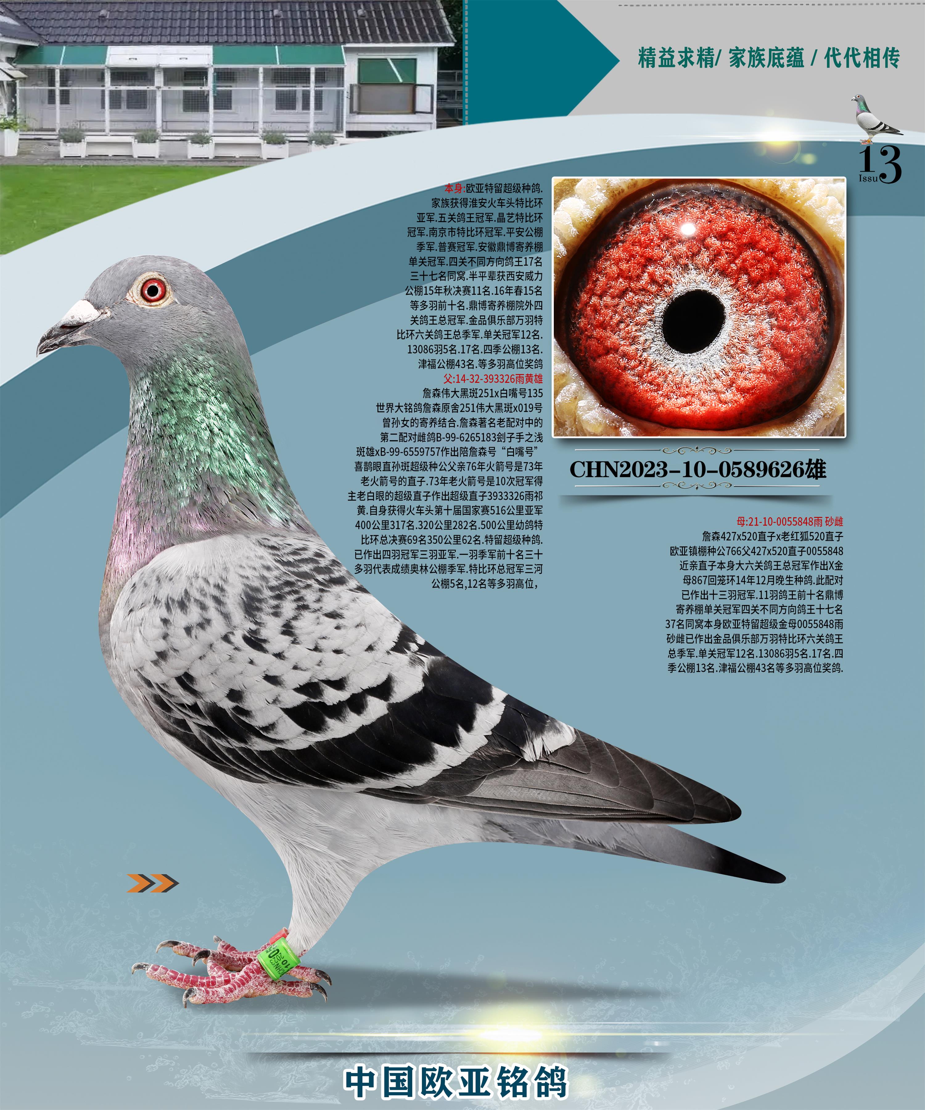 24年秋南京特比环欧亚荣获大团体冠军.小团体冠军551公里大特比13名.14名.16名.19名.20名.21名.24名.26名.27名.28名.42名.52名.54名.57名.65名.66名.68名.70名.71名.72名.74名.76名.80名.82名.83名.84名.85名.86名.90名.92名.110名.116名.121名.122名.128名.131名.158名.161名.164名.165名.166名.172名.174名.177名.182名.195名.196名.201名.205名.208名.210名.216名.253名.269名.275名.276名.294名.296名.299名,,24年秋云南天南铜都公棚决赛415名.天南铜都小棚决赛409名.云南玉活公棚决赛102名.490名.团体32名上笼二羽进二羽,天南铜都大棚506公里决赛445名。热烈祝贺河北省巨鹿县李兰生老师用欧亚泰山号血系连续十一年夺冠军,河北省国家赛冠军.全国季军等多次前十名高位,扬州王军王总用欧亚利奥24年春季获山东翔宇公棚决赛33名盖比53名。南京刘正龙刘总用欧亚盖比获得24年秋山东潍坊国际公棚决赛42名.精英赛30名.三关鸽王71名.决赛86名.加站赛16名.南京市特比环A组鸽王9名.B组鸽王5名.6名.C组鸽王5名.精英赛冠军4名.技能赛A组冠军4名.5名.秦淮区特比环荣获15名.46名.48名.87名。四川西昌徐亮徐总用欧亚利奥获得凉山州聚友决赛177名.第二关亚军双关鸽王19名.三关鸽王105名.云南豪庭公棚决赛603名。热烈祝贺24年四川重庆翔园鸽舍用欧亚泰山号荣获春季400公里冠军.秋季500公里冠军,河北王总用詹森X利奥获得千羽千翔公棚400公里冠军,广东蔡楷焕荣获24年秋爱好者 赛鸽俱乐部三关鸽王季军.一关420公里99名.二关450公里11名.三关520公里32名.单关季军.7名.12名,江西李卫兴荣获贵州红枫公棚8名.共翔俱乐部寄养棚四关综合鸽王30名.一关400公里78名.二关500公里55名.三关520公里37名.四关500公里57名.同父母获公棚18名.雷鸣获得武汉黄浦育翔中心冠军,四川陈文获得四川明鸿俱乐部300公里梦幻2名.3名.4名.9名.10名.13名.14名.15名.31名.34名.40名.41名.42名.43名.69名.71名.72名.73名.74名.94名.95名.97名.98名.99名.419公里决赛荣获总冠军7名.总共归巢9羽,四川徐亮获豪庭决赛603名,山西郑勇获得山西泰鑫公棚决赛255名詹森红狐,热烈祝贺马总获得开尔(飞跃队)决赛9名获奖金1310000万元.第一关52名,天津津福资赛180公里96名.获奖金429543万元,欧亚支持全国鸽友24年秋多人报喜 祝大家取得更好成绩,给欧亚报喜鸽友欧亚决定给每人赠送一羽超级种鸽。欧亚俱乐部特比环多关鸽王成绩:15年秋淮安特比环黑色星期一全会上笼9700多羽,当天无鸽归巢,第二天全会归巢357羽,本舍归巢158羽.前十名八羽.前一百名归巢57羽,16年春季获五关鸽王总冠军,总亚军四名.六名.七名.九名.十名.晶艺俱乐部520公里冠亚季军5名.6名.7名.9名.11名等,火车头冠军.季军6名.8名.9名.10名,16年秋晶艺俱乐部特比环520公里亚军.季军4名.6名.7名.9名,15年春南京白下特比环冠军.亚军.季军6名.7名.8名.9名.10名.指定鸽A B组获得冠军.亚军.季军4名.5名.,17年淮安特比环亚军.4名.5名.7名.8名.10名.六关鸽王总冠军.4名.6名.9名.10名,寄养棚宿迁刘总20羽特比环获冠军.季军.4名.7名.8名.9名等。18年荣获万羽特比环六关鸽王总冠军.总亚军.总季军.6名.8名.十名.单关四羽冠军.二羽亚军.四羽季军.前十名27羽。19年秋万羽特比环六关鸽王总亚军.总季军.5名.8名等,单关二羽冠军.三羽亚军.一羽季军前十名31羽。20年秋淮安市鸽会四关特比环大赛风雨无阻鸽王亚军.鸽王六名,金品俱乐部万羽特比环六关鸽王总冠军,总亚军.四名.五名.六名.七名.八名.十名.前二百名鸽王35羽,单关冠亚季军前十名四十多羽,火车头五关鸽王季军.六名.八名.前二百名鸽王十七羽。20年春荣获淮安五区一市四关鸽王总冠军.亚军.四名.八名.九名。21年秋荣获金品万羽特比环大赛六关鸽王总亚军.总季军.四名.七名.九名.十名.单关冠亚军季军前十名三十多羽。火车头协会鸽王六名.七名.十名.单关前十名十七羽。22年秋荣获鸽王总冠军.总亚军.5名.7名.8名.9名.11名.单关冠亚季军前十名三十多羽,第一关单关前二百名四十多羽,第二关前二百名三十多羽,第三关前二百名四十多羽,第四关前二百名四十多羽,第五关前一百名53羽。23年秋荣获鸽王季军.五名.八名.十名.13名.17名.20名.27名等多羽鸽王.单关前十名二十多羽。公棚.寄养棚部分成绩:16年秋宁夏黄河公棚总冠军电脑戈马力指定通炮冠军,17年送八羽参赛获得鸽王八名进奖四名,支持韩总荣获八名。支持鸽友荣获宁夏中卫公棚决赛总冠军.精英赛冠军,支持18年宁夏黄河公棚决赛冠军詹森X泰山。安徽鼎博寄养棚院内外四关鸽王总冠军.鸽王十七名.三十七名同窝,鸽王39名.42名.58名.67名。18年山东公棚预赛冠军.决赛65名.送八羽进奖五羽.指定获奔驰汽车一辆。支持鸽友获得云南蓝云公棚冠军.盖比X佛卡门。支持鸽友荣获云南银集公棚决赛冠军 詹森427X520血系 速度赛6700羽冠军。17年荣获金马俱乐部寄养棚四关鸽王总冠军.季军.六名.八名.第一关冠军.亚军.季军四名.七名.十一名.金牌教练奖。支持鸽友18年北京费翔公棚预赛九名电脑X桑杰士,支持鸽友荣获陕西威力公棚决赛11名.内蒙古临河寄养棚四关鸽王六名.詹森配泰山,支持河北王总用欧亚詹森427配胡本喜获20年秋开尔青年棚季军。云南东荣公棚16年预赛冠军.决赛77名.17年决赛12名.詹森红狐X泰山,17年平安公棚决赛4名 詹森427。欧亚获得21年金母寄养棚第一关四名.第二关5名.第三关5名.6名.7名.10名.三关鸽王总冠军,四关鸽王14名.十羽鸽王。支持河