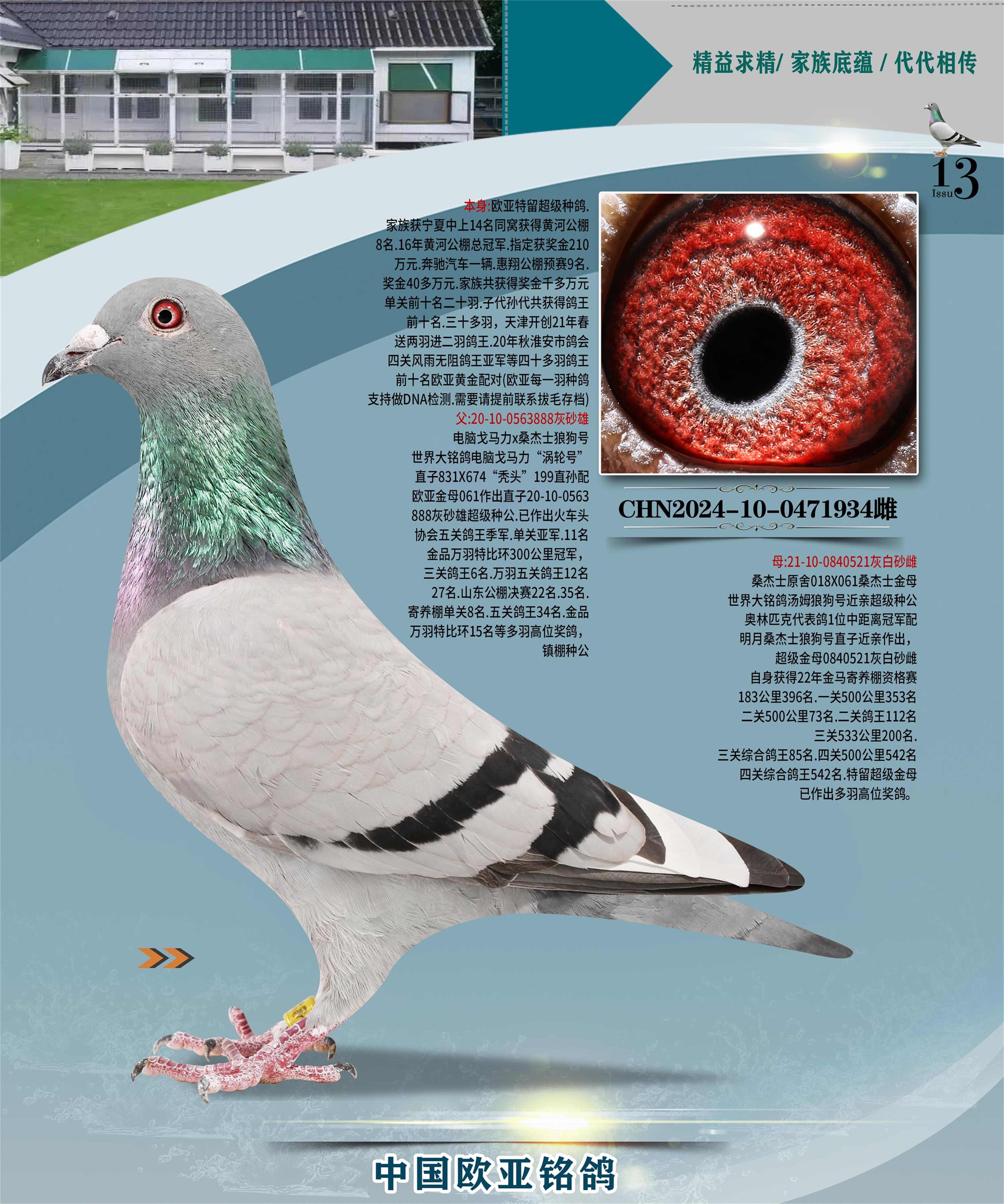 24年秋南京特比环欧亚荣获大团体冠军.小团体冠军551公里大特比13名.14名.16名.19名.20名.21名.24名.26名.27名.28名.42名.52名.54名.57名.65名.66名.68名.70名.71名.72名.74名.76名.80名.82名.83名.84名.85名.86名.90名.92名.110名.116名.121名.122名.128名.131名.158名.161名.164名.165名.166名.172名.174名.177名.182名.195名.196名.201名.205名.208名.210名.216名.253名.269名.275名.276名.294名.296名.299名,,24年秋云南天南铜都公棚决赛415名.天南铜都小棚决赛409名.云南玉活公棚决赛102名.490名.团体32名上笼二羽进二羽,天南铜都大棚506公里决赛445名。热烈祝贺河北省巨鹿县李兰生老师用欧亚泰山号血系连续十一年夺冠军,河北省国家赛冠军.全国季军等多次前十名高位,扬州王军王总用欧亚利奥24年春季获山东翔宇公棚决赛33名盖比53名。南京刘正龙刘总用欧亚盖比获得24年秋山东潍坊国际公棚决赛42名.精英赛30名.三关鸽王71名.决赛86名.加站赛16名.南京市特比环A组鸽王9名.B组鸽王5名.6名.C组鸽王5名.精英赛冠军4名.技能赛A组冠军4名.5名.秦淮区特比环荣获15名.46名.48名.87名。四川西昌徐亮徐总用欧亚利奥获得凉山州聚友决赛177名.第二关亚军双关鸽王19名.三关鸽王105名.云南豪庭公棚决赛603名。热烈祝贺24年四川重庆翔园鸽舍用欧亚泰山号荣获春季400公里冠军.秋季500公里冠军,河北王总用詹森X利奥获得千羽千翔公棚400公里冠军,广东蔡楷焕荣获24年秋爱好者 赛鸽俱乐部三关鸽王季军.一关420公里99名.二关450公里11名.三关520公里32名.单关季军.7名.12名,江西李卫兴荣获贵州红枫公棚8名.共翔俱乐部寄养棚四关综合鸽王30名.一关400公里78名.二关500公里55名.三关520公里37名.四关500公里57名.同父母获公棚18名.雷鸣获得武汉黄浦育翔中心冠军,四川陈文获得四川明鸿俱乐部300公里梦幻2名.3名.4名.9名.10名.13名.14名.15名.31名.34名.40名.41名.42名.43名.69名.71名.72名.73名.74名.94名.95名.97名.98名.99名.419公里决赛荣获总冠军7名.总共归巢9羽,四川徐亮获豪庭决赛603名,山西郑勇获得山西泰鑫公棚决赛255名詹森红狐,热烈祝贺马总获得开尔(飞跃队)决赛9名获奖金1310000万元.第一关52名,天津津福资赛180公里96名.获奖金429543万元,欧亚支持全国鸽友24年秋多人报喜 祝大家取得更好成绩,给欧亚报喜鸽友欧亚决定给每人赠送一羽超级种鸽。欧亚俱乐部特比环多关鸽王成绩:15年秋淮安特比环黑色星期一全会上笼9700多羽,当天无鸽归巢,第二天全会归巢357羽,本舍归巢158羽.前十名八羽.前一百名归巢57羽,16年春季获五关鸽王总冠军,总亚军四名.六名.七名.九名.十名.晶艺俱乐部520公里冠亚季军5名.6名.7名.9名.11名等,火车头冠军.季军6名.8名.9名.10名,16年秋晶艺俱乐部特比环520公里亚军.季军4名.6名.7名.9名,15年春南京白下特比环冠军.亚军.季军6名.7名.8名.9名.10名.指定鸽A B组获得冠军.亚军.季军4名.5名.,17年淮安特比环亚军.4名.5名.7名.8名.10名.六关鸽王总冠军.4名.6名.9名.10名,寄养棚宿迁刘总20羽特比环获冠军.季军.4名.7名.8名.9名等。18年荣获万羽特比环六关鸽王总冠军.总亚军.总季军.6名.8名.十名.单关四羽冠军.二羽亚军.四羽季军.前十名27羽。19年秋万羽特比环六关鸽王总亚军.总季军.5名.8名等,单关二羽冠军.三羽亚军.一羽季军前十名31羽。20年秋淮安市鸽会四关特比环大赛风雨无阻鸽王亚军.鸽王六名,金品俱乐部万羽特比环六关鸽王总冠军,总亚军.四名.五名.六名.七名.八名.十名.前二百名鸽王35羽,单关冠亚季军前十名四十多羽,火车头五关鸽王季军.六名.八名.前二百名鸽王十七羽。20年春荣获淮安五区一市四关鸽王总冠军.亚军.四名.八名.九名。21年秋荣获金品万羽特比环大赛六关鸽王总亚军.总季军.四名.七名.九名.十名.单关冠亚军季军前十名三十多羽。火车头协会鸽王六名.七名.十名.单关前十名十七羽。22年秋荣获鸽王总冠军.总亚军.5名.7名.8名.9名.11名.单关冠亚季军前十名三十多羽,第一关单关前二百名四十多羽,第二关前二百名三十多羽,第三关前二百名四十多羽,第四关前二百名四十多羽,第五关前一百名53羽。23年秋荣获鸽王季军.五名.八名.十名.13名.17名.20名.27名等多羽鸽王.单关前十名二十多羽。公棚.寄养棚部分成绩:16年秋宁夏黄河公棚总冠军电脑戈马力指定通炮冠军,17年送八羽参赛获得鸽王八名进奖四名,支持韩总荣获八名。支持鸽友荣获宁夏中卫公棚决赛总冠军.精英赛冠军,支持18年宁夏黄河公棚决赛冠军詹森X泰山。安徽鼎博寄养棚院内外四关鸽王总冠军.鸽王十七名.三十七名同窝,鸽王39名.42名.58名.67名。18年山东公棚预赛冠军.决赛65名.送八羽进奖五羽.指定获奔驰汽车一辆。支持鸽友获得云南蓝云公棚冠军.盖比X佛卡门。支持鸽友荣获云南银集公棚决赛冠军 詹森427X520血系 速度赛6700羽冠军。17年荣获金马俱乐部寄养棚四关鸽王总冠军.季军.六名.八名.第一关冠军.亚军.季军四名.七名.十一名.金牌教练奖。支持鸽友18年北京费翔公棚预赛九名电脑X桑杰士,支持鸽友荣获陕西威力公棚决赛11名.内蒙古临河寄养棚四关鸽王六名.詹森配泰山,支持河北王总用欧亚詹森427配胡本喜获20年秋开尔青年棚季军。云南东荣公棚16年预赛冠军.决赛77名.17年决赛12名.詹森红狐X泰山,17年平安公棚决赛4名 詹森427。欧亚获得21年金母寄养棚第一关四名.第二关5名.第三关5名.6名.7名.10名.三关鸽王总冠军,四关鸽王14名.十羽鸽王。支持河