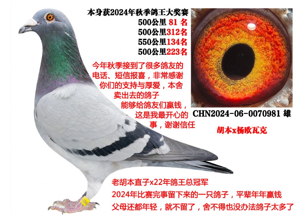 胡本x杨欧瓦克,打比赛要有几路鸽子去比赛,这个配对方式就是针对恶劣天气赛事的配对,500公里第一关非常难打,当天归巢率不足四分之一的情况下,飞了81名优秀赛绩。