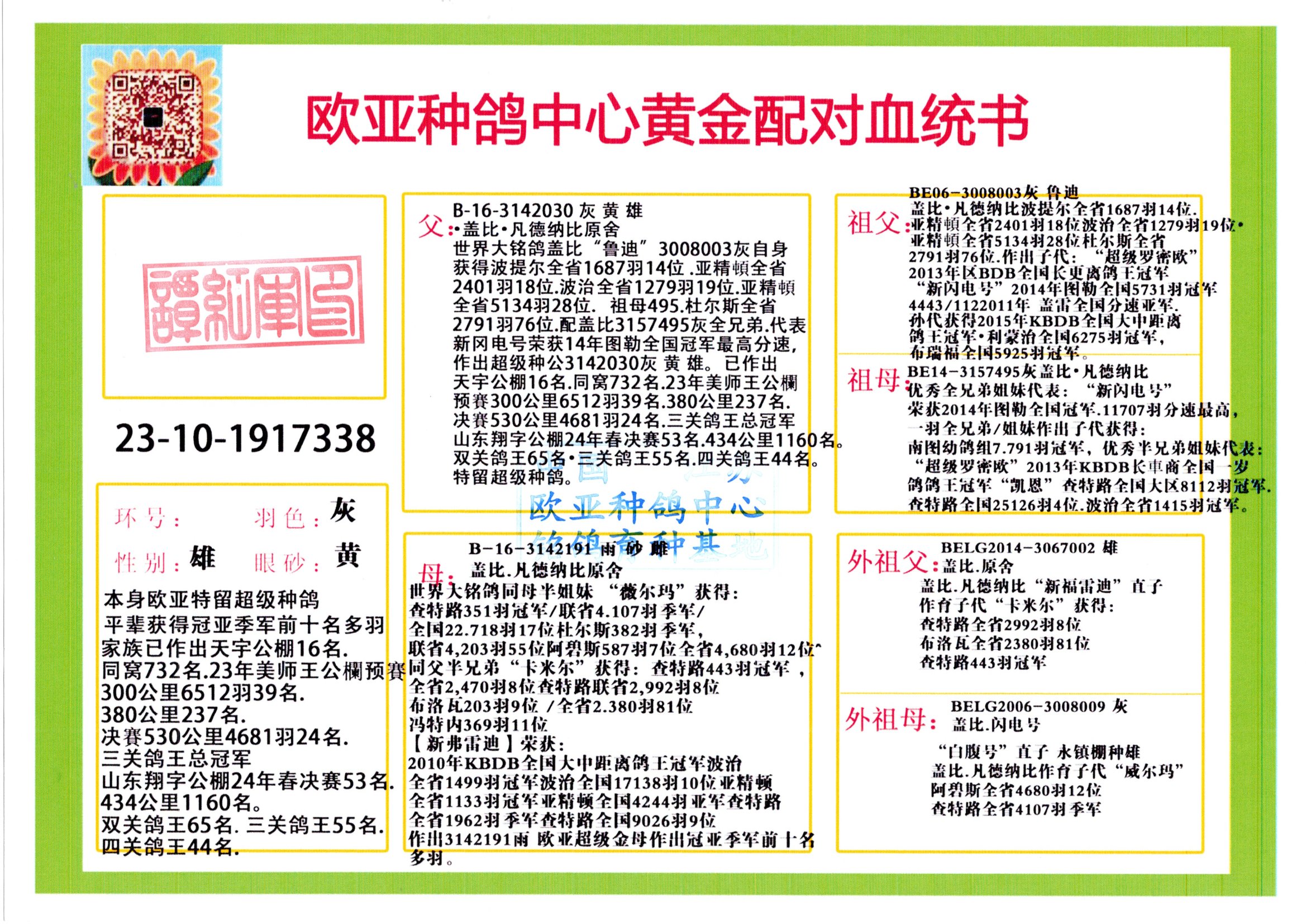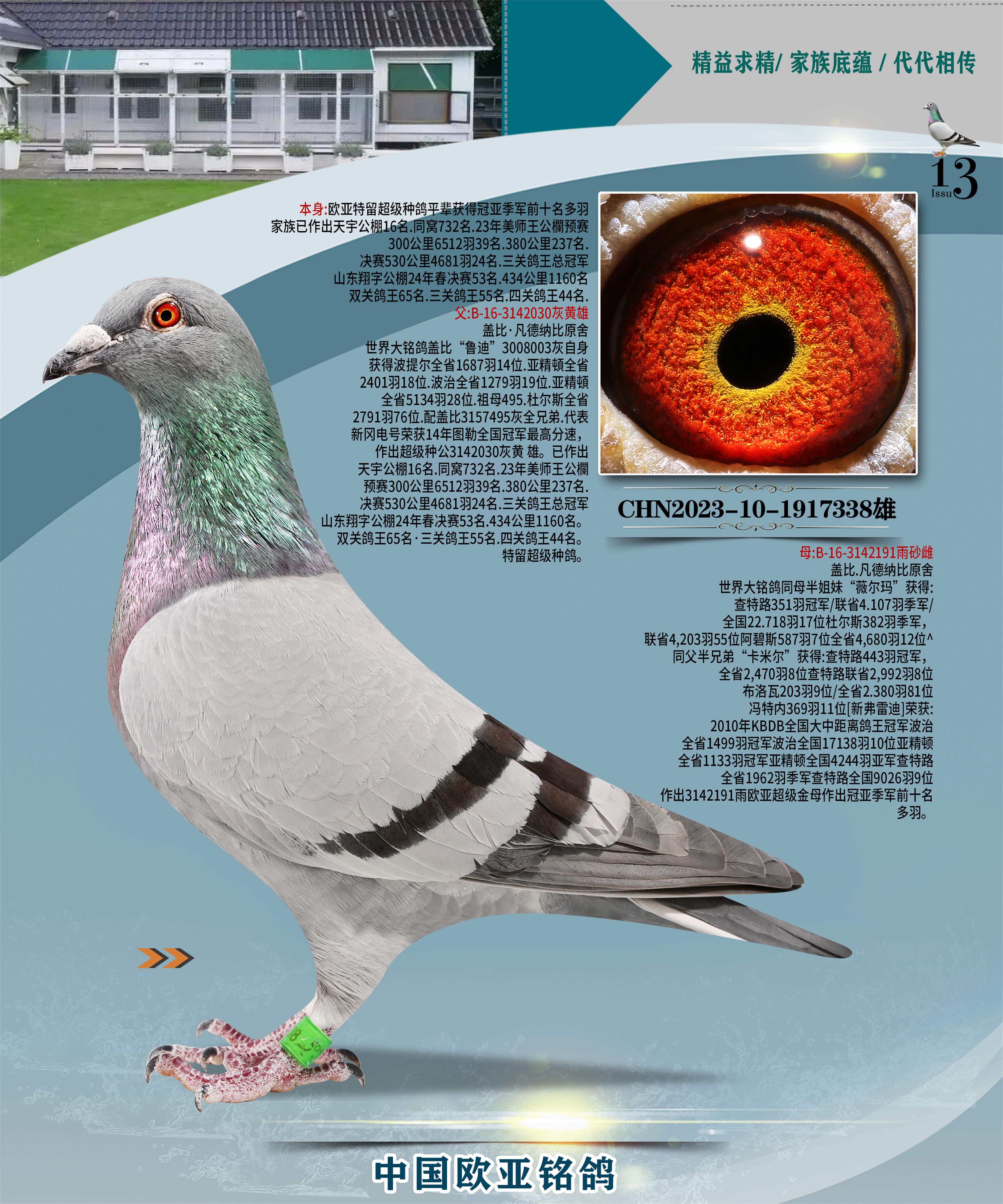 24年秋南京特比环欧亚荣获大团体冠军.小团体冠军551公里大特比13名.14名.16名.19名.20名.21名.24名.26名.27名.28名.42名.52名.54名.57名.65名.66名.68名.70名.71名.72名.74名.76名.80名.82名.83名.84名.85名.86名.90名.92名.110名.116名.121名.122名.128名.131名.158名.161名.164名.165名.166名.172名.174名.177名.182名.195名.196名.201名.205名.208名.210名.216名.253名.269名.275名.276名.294名.296名.299名,,24年秋云南天南铜都公棚决赛415名.天南铜都小棚决赛409名.云南玉活公棚决赛102名.490名.团体32名上笼二羽进二羽,天南铜都大棚506公里决赛445名。热烈祝贺河北省巨鹿县李兰生老师用欧亚泰山号血系连续十一年夺冠军,河北省国家赛冠军.全国季军等多次前十名高位,扬州王军王总用欧亚利奥24年春季获山东翔宇公棚决赛33名盖比53名。南京刘正龙刘总用欧亚盖比获得24年秋山东潍坊国际公棚决赛42名.精英赛30名.三关鸽王71名.决赛86名.加站赛16名.南京市特比环A组鸽王9名.B组鸽王5名.6名.C组鸽王5名.精英赛冠军4名.技能赛A组冠军4名.5名.秦淮区特比环荣获15名.46名.48名.87名。四川西昌徐亮徐总用欧亚利奥获得凉山州聚友决赛177名.第二关亚军双关鸽王19名.三关鸽王105名.云南豪庭公棚决赛603名。热烈祝贺24年四川重庆翔园鸽舍用欧亚泰山号荣获春季400公里冠军.秋季500公里冠军,河北王总用詹森X利奥获得千羽千翔公棚400公里冠军,广东蔡楷焕荣获24年秋爱好者 赛鸽俱乐部三关鸽王季军.一关420公里99名.二关450公里11名.三关520公里32名.单关季军.7名.12名,江西李卫兴荣获贵州红枫公棚8名.共翔俱乐部寄养棚四关综合鸽王30名.一关400公里78名.二关500公里55名.三关520公里37名.四关500公里57名.同父母获公棚18名.雷鸣获得武汉黄浦育翔中心冠军,四川陈文获得四川明鸿俱乐部300公里梦幻2名.3名.4名.9名.10名.13名.14名.15名.31名.34名.40名.41名.42名.43名.69名.71名.72名.73名.74名.94名.95名.97名.98名.99名.419公里决赛荣获总冠军7名.总共归巢9羽,四川徐亮获豪庭决赛603名,山西郑勇获得山西泰鑫公棚决赛255名詹森红狐,热烈祝贺马总获得开尔(飞跃队)决赛9名获奖金1310000万元.第一关52名,天津津福资赛180公里96名.获奖金429543万元,欧亚支持全国鸽友24年秋多人报喜 祝大家取得更好成绩,给欧亚报喜鸽友欧亚决定给每人赠送一羽超级种鸽。欧亚俱乐部特比环多关鸽王成绩:15年秋淮安特比环黑色星期一全会上笼9700多羽,当天无鸽归巢,第二天全会归巢357羽,本舍归巢158羽.前十名八羽.前一百名归巢57羽,16年春季获五关鸽王总冠军,总亚军四名.六名.七名.九名.十名.晶艺俱乐部520公里冠亚季军5名.6名.7名.9名.11名等,火车头冠军.季军6名.8名.9名.10名,16年秋晶艺俱乐部特比环520公里亚军.季军4名.6名.7名.9名,15年春南京白下特比环冠军.亚军.季军6名.7名.8名.9名.10名.指定鸽A B组获得冠军.亚军.季军4名.5名.,17年淮安特比环亚军.4名.5名.7名.8名.10名.六关鸽王总冠军.4名.6名.9名.10名,寄养棚宿迁刘总20羽特比环获冠军.季军.4名.7名.8名.9名等。18年荣获万羽特比环六关鸽王总冠军.总亚军.总季军.6名.8名.十名.单关四羽冠军.二羽亚军.四羽季军.前十名27羽。19年秋万羽特比环六关鸽王总亚军.总季军.5名.8名等,单关二羽冠军.三羽亚军.一羽季军前十名31羽。20年秋淮安市鸽会四关特比环大赛风雨无阻鸽王亚军.鸽王六名,金品俱乐部万羽特比环六关鸽王总冠军,总亚军.四名.五名.六名.七名.八名.十名.前二百名鸽王35羽,单关冠亚季军前十名四十多羽,火车头五关鸽王季军.六名.八名.前二百名鸽王十七羽。20年春荣获淮安五区一市四关鸽王总冠军.亚军.四名.八名.九名。21年秋荣获金品万羽特比环大赛六关鸽王总亚军.总季军.四名.七名.九名.十名.单关冠亚军季军前十名三十多羽。火车头协会鸽王六名.七名.十名.单关前十名十七羽。22年秋荣获鸽王总冠军.总亚军.5名.7名.8名.9名.11名.单关冠亚季军前十名三十多羽,第一关单关前二百名四十多羽,第二关前二百名三十多羽,第三关前二百名四十多羽,第四关前二百名四十多羽,第五关前一百名53羽。23年秋荣获鸽王季军.五名.八名.十名.13名.17名.20名.27名等多羽鸽王.单关前十名二十多羽。公棚.寄养棚部分成绩:16年秋宁夏黄河公棚总冠军电脑戈马力指定通炮冠军,17年送八羽参赛获得鸽王八名进奖四名,支持韩总荣获八名。支持鸽友荣获宁夏中卫公棚决赛总冠军.精英赛冠军,支持18年宁夏黄河公棚决赛冠军詹森X泰山。安徽鼎博寄养棚院内外四关鸽王总冠军.鸽王十七名.三十七名同窝,鸽王39名.42名.58名.67名。18年山东公棚预赛冠军.决赛65名.送八羽进奖五羽.指定获奔驰汽车一辆。支持鸽友获得云南蓝云公棚冠军.盖比X佛卡门。支持鸽友荣获云南银集公棚决赛冠军 詹森427X520血系 速度赛6700羽冠军。17年荣获金马俱乐部寄养棚四关鸽王总冠军.季军.六名.八名.第一关冠军.亚军.季军四名.七名.十一名.金牌教练奖。支持鸽友18年北京费翔公棚预赛九名电脑X桑杰士,支持鸽友荣获陕西威力公棚决赛11名.内蒙古临河寄养棚四关鸽王六名.詹森配泰山,支持河北王总用欧亚詹森427配胡本喜获20年秋开尔青年棚季军。云南东荣公棚16年预赛冠军.决赛77名.17年决赛12名.詹森红狐X泰山,17年平安公棚决赛4名 詹森427。欧亚获得21年金母寄养棚第一关四名.第二关5名.第三关5名.6名.7名.10名.三关鸽王总冠军,四关鸽王14名.十羽鸽王。支持河