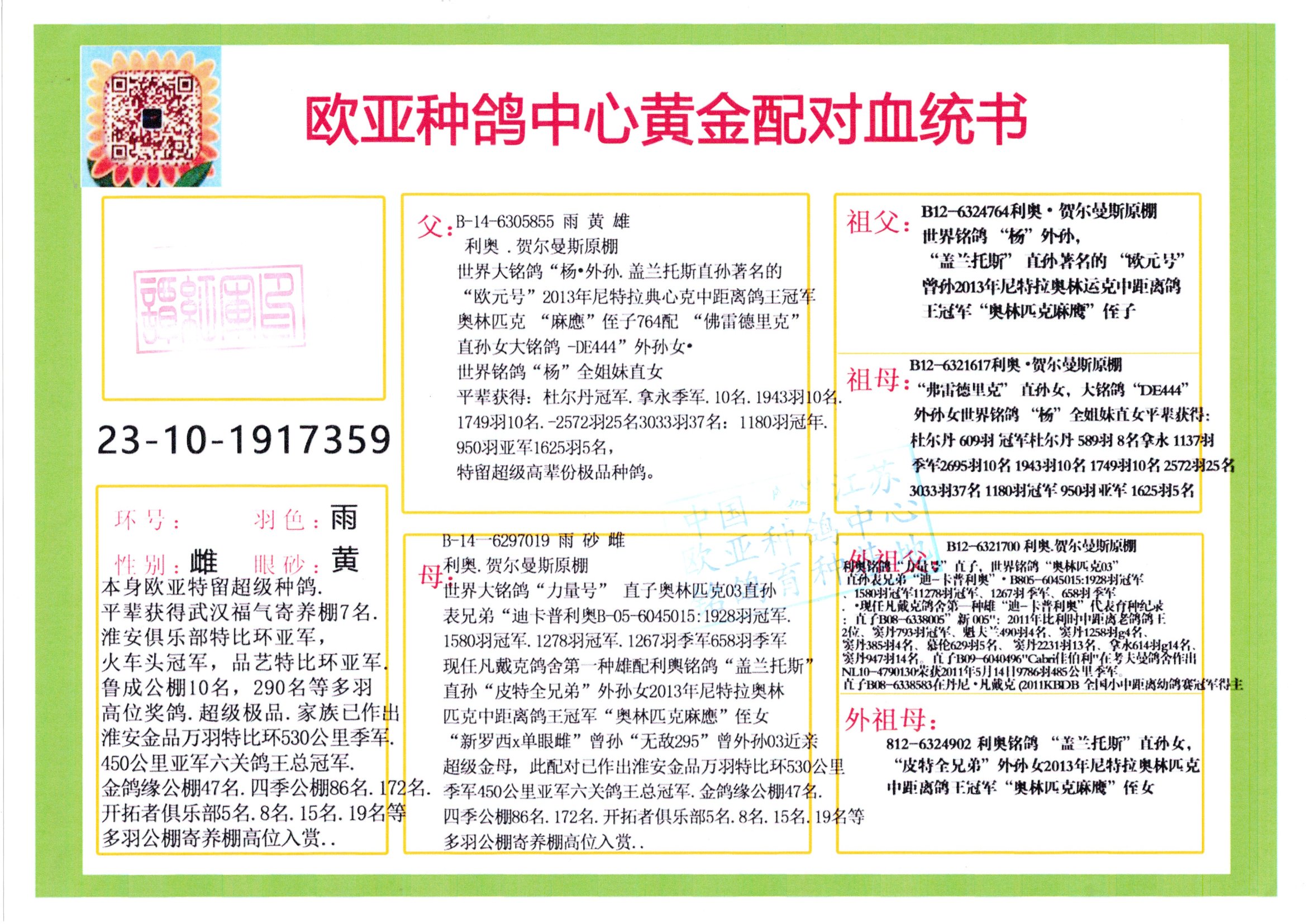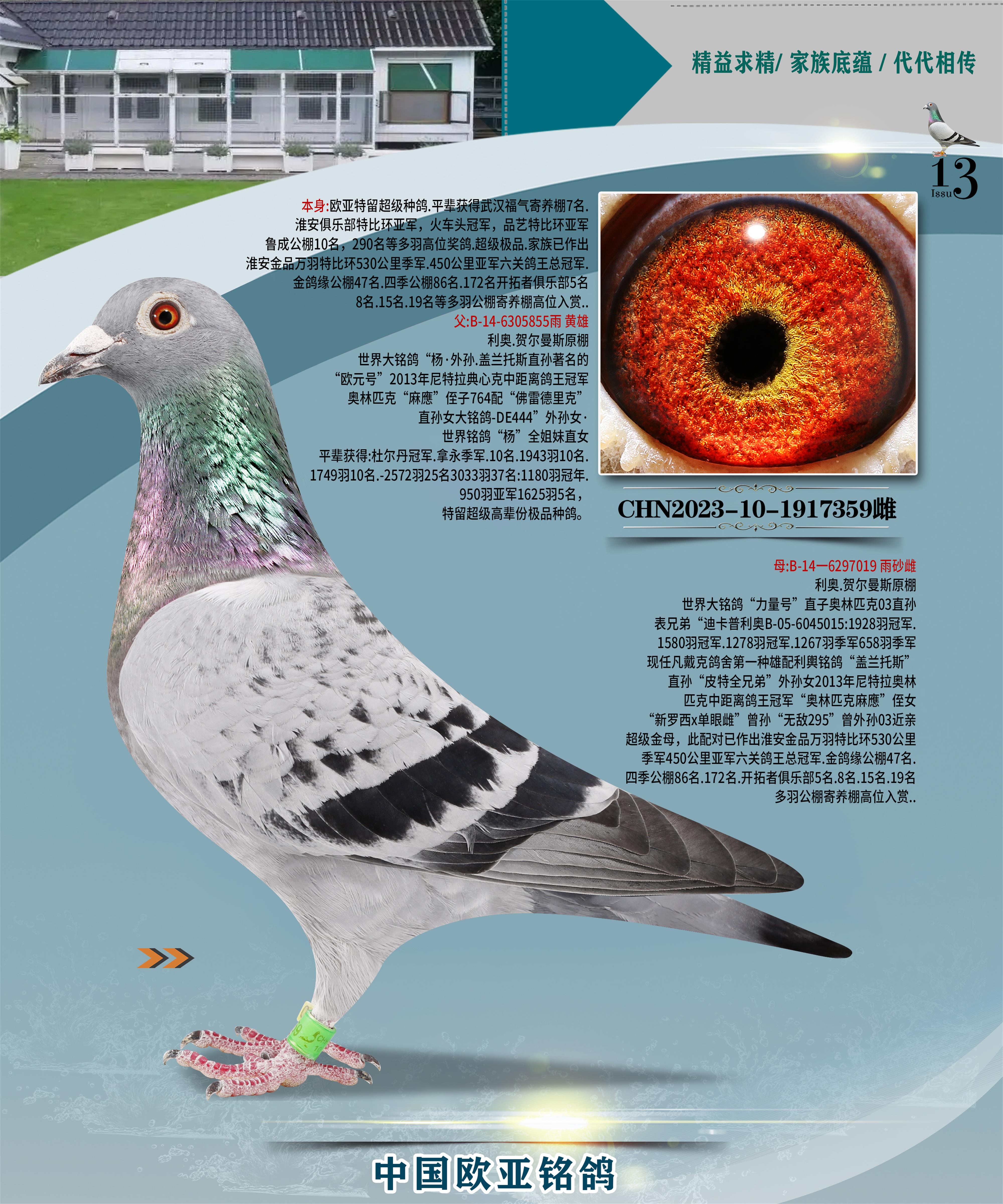 24年秋南京特比环欧亚荣获大团体冠军.小团体冠军551公里大特比13名.14名.16名.19名.20名.21名.24名.26名.27名.28名.42名.52名.54名.57名.65名.66名.68名.70名.71名.72名.74名.76名.80名.82名.83名.84名.85名.86名.90名.92名.110名.116名.121名.122名.128名.131名.158名.161名.164名.165名.166名.172名.174名.177名.182名.195名.196名.201名.205名.208名.210名.216名.253名.269名.275名.276名.294名.296名.299名,,24年秋云南天南铜都公棚决赛415名.天南铜都小棚决赛409名.云南玉活公棚决赛102名.490名.团体32名上笼二羽进二羽,天南铜都大棚506公里决赛445名。热烈祝贺河北省巨鹿县李兰生老师用欧亚泰山号血系连续十一年夺冠军,河北省国家赛冠军.全国季军等多次前十名高位,扬州王军王总用欧亚利奥24年春季获山东翔宇公棚决赛33名盖比53名。南京刘正龙刘总用欧亚盖比获得24年秋山东潍坊国际公棚决赛42名.精英赛30名.三关鸽王71名.决赛86名.加站赛16名.南京市特比环A组鸽王9名.B组鸽王5名.6名.C组鸽王5名.精英赛冠军4名.技能赛A组冠军4名.5名.秦淮区特比环荣获15名.46名.48名.87名。四川西昌徐亮徐总用欧亚利奥获得凉山州聚友决赛177名.第二关亚军双关鸽王19名.三关鸽王105名.云南豪庭公棚决赛603名。热烈祝贺24年四川重庆翔园鸽舍用欧亚泰山号荣获春季400公里冠军.秋季500公里冠军,河北王总用詹森X利奥获得千羽千翔公棚400公里冠军,广东蔡楷焕荣获24年秋爱好者 赛鸽俱乐部三关鸽王季军.一关420公里99名.二关450公里11名.三关520公里32名.单关季军.7名.12名,江西李卫兴荣获贵州红枫公棚8名.共翔俱乐部寄养棚四关综合鸽王30名.一关400公里78名.二关500公里55名.三关520公里37名.四关500公里57名.同父母获公棚18名.雷鸣获得武汉黄浦育翔中心冠军,四川陈文获得四川明鸿俱乐部300公里梦幻2名.3名.4名.9名.10名.13名.14名.15名.31名.34名.40名.41名.42名.43名.69名.71名.72名.73名.74名.94名.95名.97名.98名.99名.419公里决赛荣获总冠军7名.总共归巢9羽,四川徐亮获豪庭决赛603名,山西郑勇获得山西泰鑫公棚决赛255名詹森红狐,热烈祝贺马总获得开尔(飞跃队)决赛9名获奖金1310000万元.第一关52名,天津津福资赛180公里96名.获奖金429543万元,欧亚支持全国鸽友24年秋多人报喜 祝大家取得更好成绩,给欧亚报喜鸽友欧亚决定给每人赠送一羽超级种鸽。欧亚俱乐部特比环多关鸽王成绩:15年秋淮安特比环黑色星期一全会上笼9700多羽,当天无鸽归巢,第二天全会归巢357羽,本舍归巢158羽.前十名八羽.前一百名归巢57羽,16年春季获五关鸽王总冠军,总亚军四名.六名.七名.九名.十名.晶艺俱乐部520公里冠亚季军5名.6名.7名.9名.11名等,火车头冠军.季军6名.8名.9名.10名,16年秋晶艺俱乐部特比环520公里亚军.季军4名.6名.7名.9名,15年春南京白下特比环冠军.亚军.季军6名.7名.8名.9名.10名.指定鸽A B组获得冠军.亚军.季军4名.5名.,17年淮安特比环亚军.4名.5名.7名.8名.10名.六关鸽王总冠军.4名.6名.9名.10名,寄养棚宿迁刘总20羽特比环获冠军.季军.4名.7名.8名.9名等。18年荣获万羽特比环六关鸽王总冠军.总亚军.总季军.6名.8名.十名.单关四羽冠军.二羽亚军.四羽季军.前十名27羽。19年秋万羽特比环六关鸽王总亚军.总季军.5名.8名等,单关二羽冠军.三羽亚军.一羽季军前十名31羽。20年秋淮安市鸽会四关特比环大赛风雨无阻鸽王亚军.鸽王六名,金品俱乐部万羽特比环六关鸽王总冠军,总亚军.四名.五名.六名.七名.八名.十名.前二百名鸽王35羽,单关冠亚季军前十名四十多羽,火车头五关鸽王季军.六名.八名.前二百名鸽王十七羽。20年春荣获淮安五区一市四关鸽王总冠军.亚军.四名.八名.九名。21年秋荣获金品万羽特比环大赛六关鸽王总亚军.总季军.四名.七名.九名.十名.单关冠亚军季军前十名三十多羽。火车头协会鸽王六名.七名.十名.单关前十名十七羽。22年秋荣获鸽王总冠军.总亚军.5名.7名.8名.9名.11名.单关冠亚季军前十名三十多羽,第一关单关前二百名四十多羽,第二关前二百名三十多羽,第三关前二百名四十多羽,第四关前二百名四十多羽,第五关前一百名53羽。23年秋荣获鸽王季军.五名.八名.十名.13名.17名.20名.27名等多羽鸽王.单关前十名二十多羽。公棚.寄养棚部分成绩:16年秋宁夏黄河公棚总冠军电脑戈马力指定通炮冠军,17年送八羽参赛获得鸽王八名进奖四名,支持韩总荣获八名。支持鸽友荣获宁夏中卫公棚决赛总冠军.精英赛冠军,支持18年宁夏黄河公棚决赛冠军詹森X泰山。安徽鼎博寄养棚院内外四关鸽王总冠军.鸽王十七名.三十七名同窝,鸽王39名.42名.58名.67名。18年山东公棚预赛冠军.决赛65名.送八羽进奖五羽.指定获奔驰汽车一辆。支持鸽友获得云南蓝云公棚冠军.盖比X佛卡门。支持鸽友荣获云南银集公棚决赛冠军 詹森427X520血系 速度赛6700羽冠军。17年荣获金马俱乐部寄养棚四关鸽王总冠军.季军.六名.八名.第一关冠军.亚军.季军四名.七名.十一名.金牌教练奖。支持鸽友18年北京费翔公棚预赛九名电脑X桑杰士,支持鸽友荣获陕西威力公棚决赛11名.内蒙古临河寄养棚四关鸽王六名.詹森配泰山,支持河北王总用欧亚詹森427配胡本喜获20年秋开尔青年棚季军。云南东荣公棚16年预赛冠军.决赛77名.17年决赛12名.詹森红狐X泰山,17年平安公棚决赛4名 詹森427。欧亚获得21年金母寄养棚第一关四名.第二关5名.第三关5名.6名.7名.10名.三关鸽王总冠军,四关鸽王14名.十羽鸽王。支