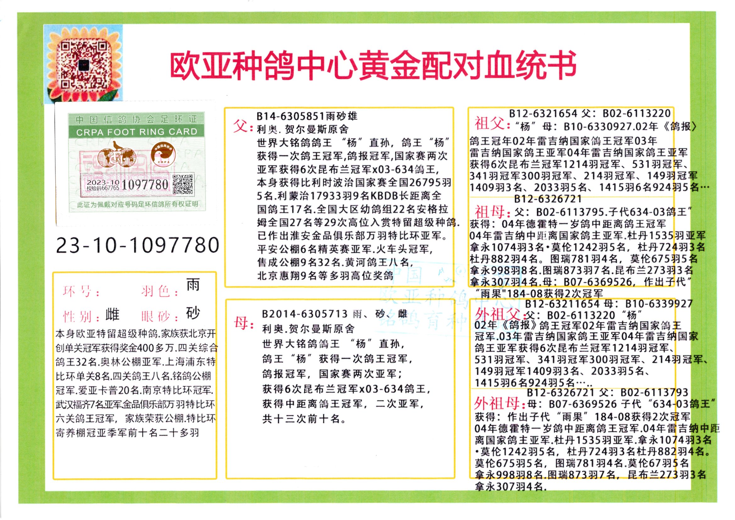 24年秋南京特比环欧亚荣获大团体冠军.小团体冠军551公里大特比13名.14名.16名.19名.20名.21名.24名.26名.27名.28名.42名.52名.54名.57名.65名.66名.68名.70名.71名.72名.74名.76名.80名.82名.83名.84名.85名.86名.90名.92名.110名.116名.121名.122名.128名.131名.158名.161名.164名.165名.166名.172名.174名.177名.182名.195名.196名.201名.205名.208名.210名.216名.253名.269名.275名.276名.294名.296名.299名,,24年秋云南天南铜都公棚决赛415名.天南铜都小棚决赛409名.云南玉活公棚决赛102名.490名.团体32名上笼二羽进二羽,天南铜都大棚506公里决赛445名。热烈祝贺河北省巨鹿县李兰生老师用欧亚泰山号血系连续十一年夺冠军,河北省国家赛冠军.全国季军等多次前十名高位,扬州王军王总用欧亚利奥24年春季获山东翔宇公棚决赛33名盖比53名。南京刘正龙刘总用欧亚盖比获得24年秋山东潍坊国际公棚决赛42名.精英赛30名.三关鸽王71名.决赛86名.加站赛16名.南京市特比环A组鸽王9名.B组鸽王5名.6名.C组鸽王5名.精英赛冠军4名.技能赛A组冠军4名.5名.秦淮区特比环荣获15名.46名.48名.87名。四川西昌徐亮徐总用欧亚利奥获得凉山州聚友决赛177名.第二关亚军双关鸽王19名.三关鸽王105名.云南豪庭公棚决赛603名。热烈祝贺24年四川重庆翔园鸽舍用欧亚泰山号荣获春季400公里冠军.秋季500公里冠军,河北王总用詹森X利奥获得千羽千翔公棚400公里冠军,广东蔡楷焕荣获24年秋爱好者 赛鸽俱乐部三关鸽王季军.一关420公里99名.二关450公里11名.三关520公里32名.单关季军.7名.12名,江西李卫兴荣获贵州红枫公棚8名.共翔俱乐部寄养棚四关综合鸽王30名.一关400公里78名.二关500公里55名.三关520公里37名.四关500公里57名.同父母获公棚18名.雷鸣获得武汉黄浦育翔中心冠军,四川陈文获得四川明鸿俱乐部300公里梦幻2名.3名.4名.9名.10名.13名.14名.15名.31名.34名.40名.41名.42名.43名.69名.71名.72名.73名.74名.94名.95名.97名.98名.99名.419公里决赛荣获总冠军7名.总共归巢9羽,四川徐亮获豪庭决赛603名,山西郑勇获得山西泰鑫公棚决赛255名詹森红狐,热烈祝贺马总获得开尔(飞跃队)决赛9名获奖金1310000万元.第一关52名,天津津福资赛180公里96名.获奖金429543万元,欧亚支持全国鸽友24年秋多人报喜 祝大家取得更好成绩,给欧亚报喜鸽友欧亚决定给每人赠送一羽超级种鸽。欧亚俱乐部特比环多关鸽王成绩:15年秋淮安特比环黑色星期一全会上笼9700多羽,当天无鸽归巢,第二天全会归巢357羽,本舍归巢158羽.前十名八羽.前一百名归巢57羽,16年春季获五关鸽王总冠军,总亚军四名.六名.七名.九名.十名.晶艺俱乐部520公里冠亚季军5名.6名.7名.9名.11名等,火车头冠军.季军6名.8名.9名.10名,16年秋晶艺俱乐部特比环520公里亚军.季军4名.6名.7名.9名,15年春南京白下特比环冠军.亚军.季军6名.7名.8名.9名.10名.指定鸽A B组获得冠军.亚军.季军4名.5名.,17年淮安特比环亚军.4名.5名.7名.8名.10名.六关鸽王总冠军.4名.6名.9名.10名,寄养棚宿迁刘总20羽特比环获冠军.季军.4名.7名.8名.9名等。18年荣获万羽特比环六关鸽王总冠军.总亚军.总季军.6名.8名.十名.单关四羽冠军.二羽亚军.四羽季军.前十名27羽。19年秋万羽特比环六关鸽王总亚军.总季军.5名.8名等,单关二羽冠军.三羽亚军.一羽季军前十名31羽。20年秋淮安市鸽会四关特比环大赛风雨无阻鸽王亚军.鸽王六名,金品俱乐部万羽特比环六关鸽王总冠军,总亚军.四名.五名.六名.七名.八名.十名.前二百名鸽王35羽,单关冠亚季军前十名四十多羽,火车头五关鸽王季军.六名.八名.前二百名鸽王十七羽。20年春荣获淮安五区一市四关鸽王总冠军.亚军.四名.八名.九名。21年秋荣获金品万羽特比环大赛六关鸽王总亚军.总季军.四名.七名.九名.十名.单关冠亚军季军前十名三十多羽。火车头协会鸽王六名.七名.十名.单关前十名十七羽。22年秋荣获鸽王总冠军.总亚军.5名.7名.8名.9名.11名.单关冠亚季军前十名三十多羽,第一关单关前二百名四十多羽,第二关前二百名三十多羽,第三关前二百名四十多羽,第四关前二百名四十多羽,第五关前一百名53羽。23年秋荣获鸽王季军.五名.八名.十名.13名.17名.20名.27名等多羽鸽王.单关前十名二十多羽。公棚.寄养棚部分成绩:16年秋宁夏黄河公棚总冠军电脑戈马力指定通炮冠军,17年送八羽参赛获得鸽王八名进奖四名,支持韩总荣获八名。支持鸽友荣获宁夏中卫公棚决赛总冠军.精英赛冠军,支持18年宁夏黄河公棚决赛冠军詹森X泰山。安徽鼎博寄养棚院内外四关鸽王总冠军.鸽王十七名.三十七名同窝,鸽王39名.42名.58名.67名。18年山东公棚预赛冠军.决赛65名.送八羽进奖五羽.指定获奔驰汽车一辆。支持鸽友获得云南蓝云公棚冠军.盖比X佛卡门。支持鸽友荣获云南银集公棚决赛冠军 詹森427X520血系 速度赛6700羽冠军。17年荣获金马俱乐部寄养棚四关鸽王总冠军.季军.六名.八名.第一关冠军.亚军.季军四名.七名.十一名.金牌教练奖。支持鸽友18年北京费翔公棚预赛九名电脑X桑杰士,支持鸽友荣获陕西威力公棚决赛11名.内蒙古临河寄养棚四关鸽王六名.詹森配泰山,支持河北王总用欧亚詹森427配胡本喜获20年秋开尔青年棚季军。云南东荣公棚16年预赛冠军.决赛77名.17年决赛12名.詹森红狐X泰山,17年平安公棚决赛4名 詹森427。欧亚获得21年金母寄养棚第一关四名.第二关5名.第三关5名.6名.7名.10名.三关鸽王总冠军,四关鸽王14名.十羽鸽王。支持河