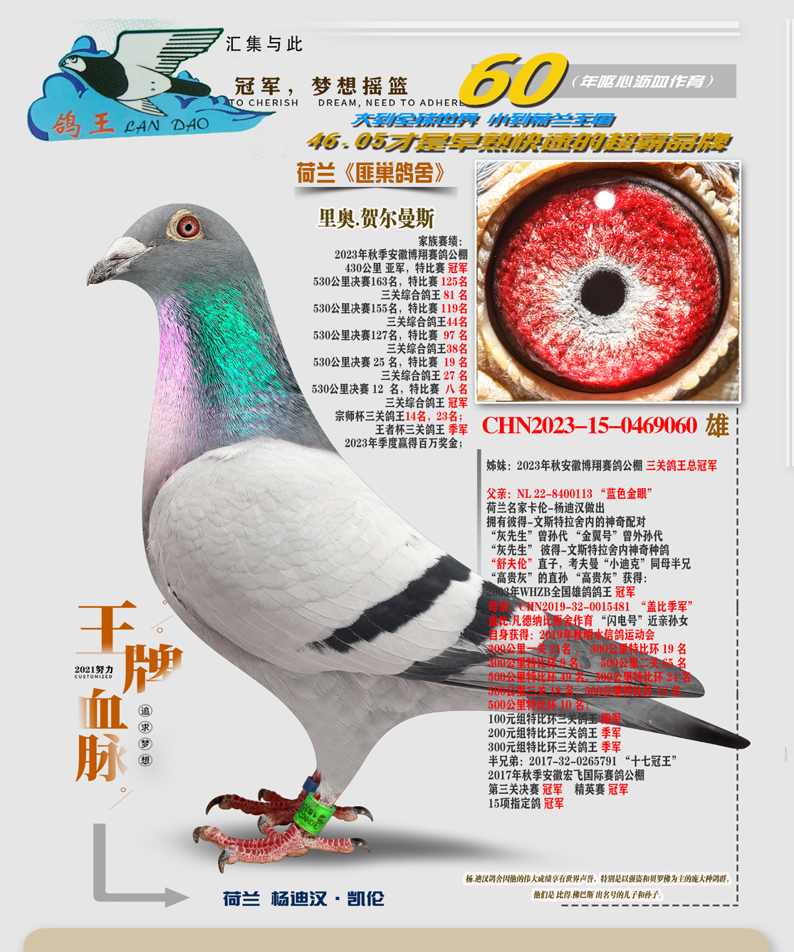 购得你家003血统鸽子今年在临河市1800特比环勇夺三关鸽王二十五名暗指二千五千共获奖金二十多万。地方大奖赛鸽王亚军四名十七名等谢谢刘总输出的好种鸽,鸽好人更好,祝刘总冠军多多,金钱多多。