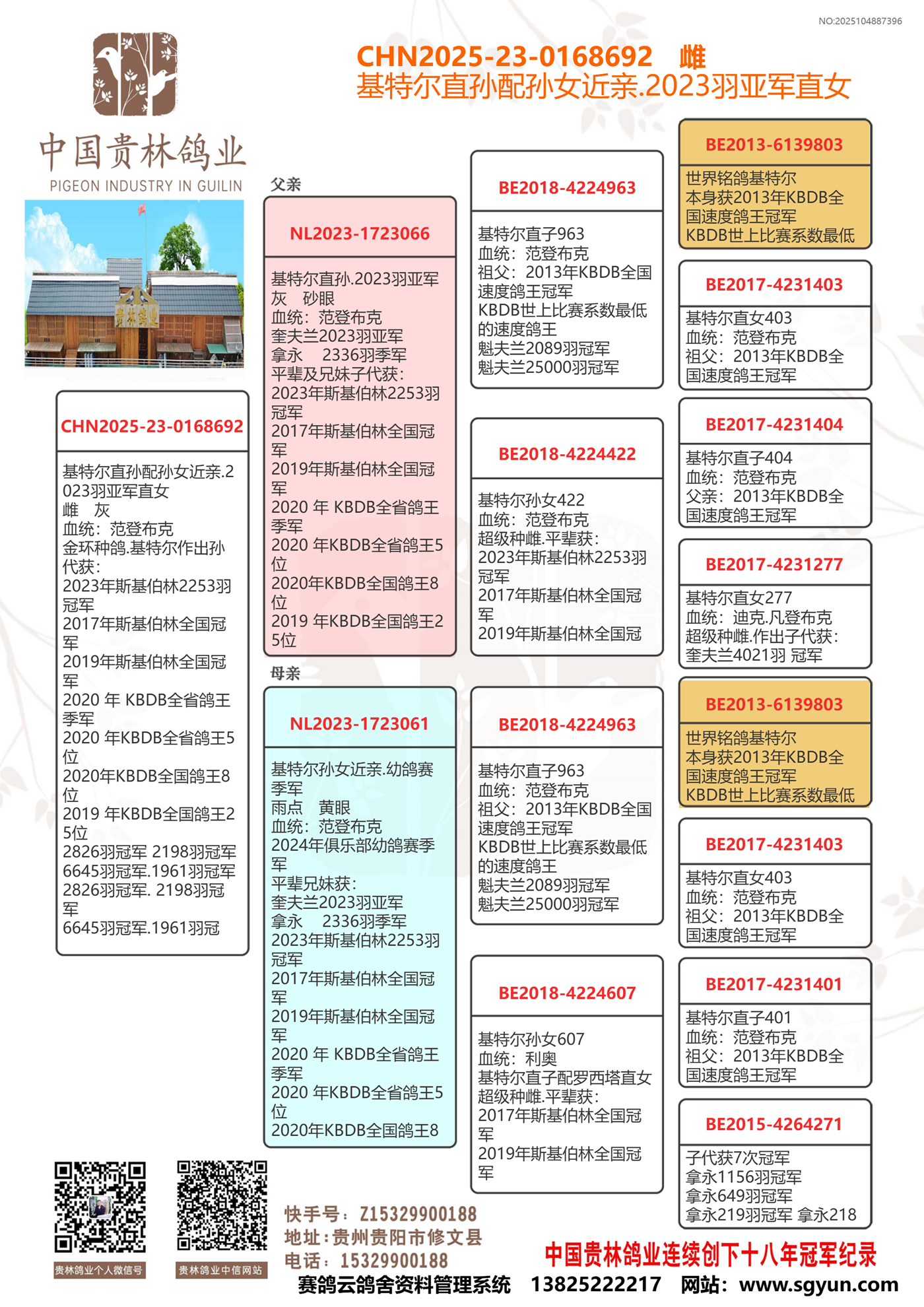 | 1623817 | 基特尔006直孙配基特尔006孙女近亲. 3585羽亚军直子 | ¥1000元 | 0次 |