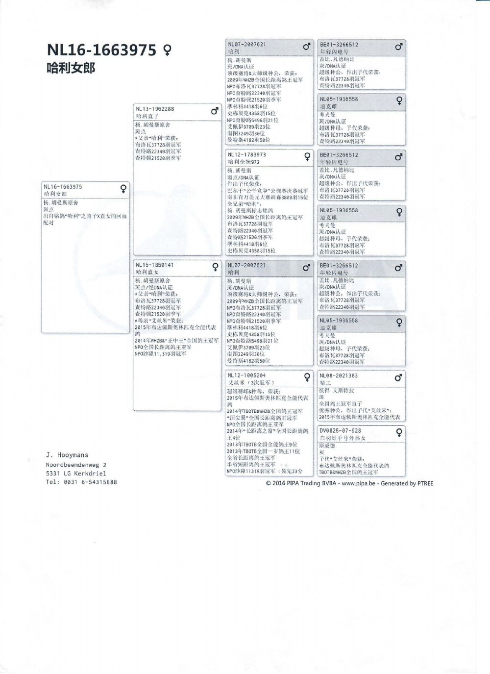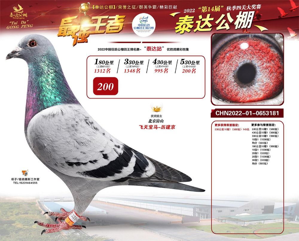 22-01-0653181;父亲:开尔公棚的成绩鸽;母亲:杨胡曼斯原舍 哈利孙代