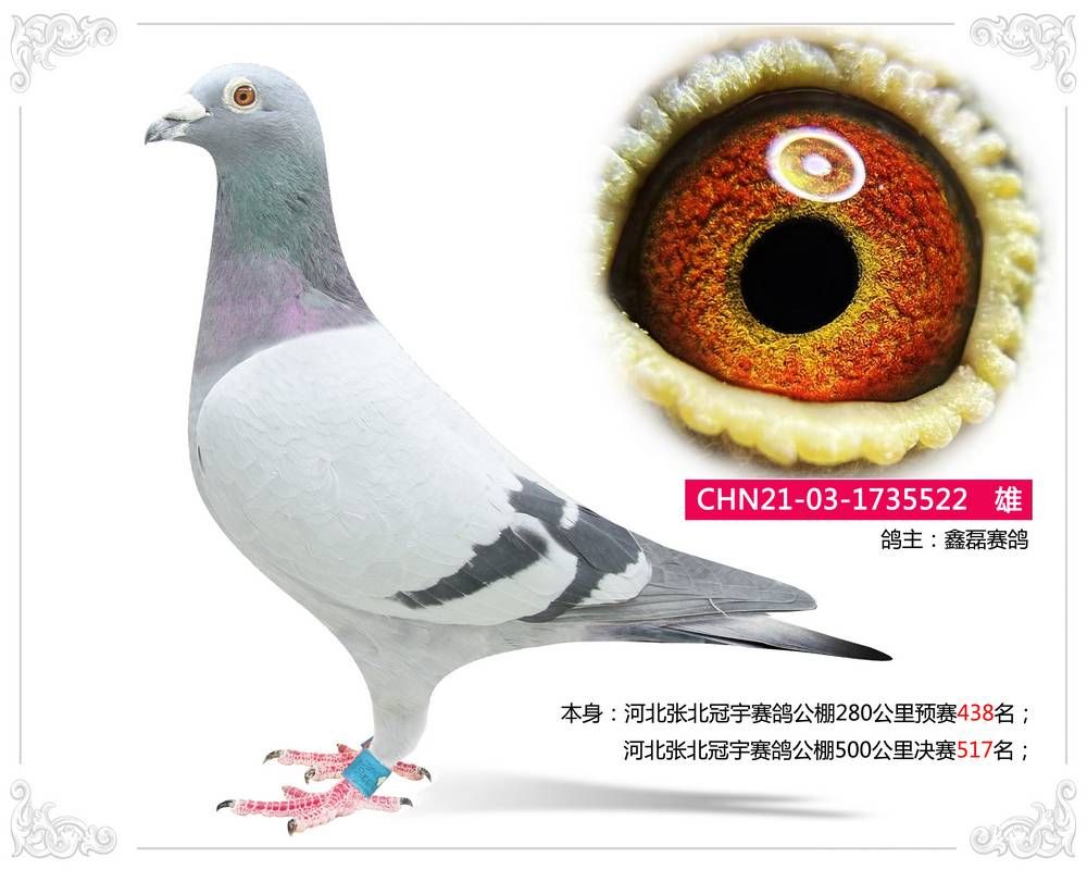 CHN21-03-1735522 雄 本身:河北张北冠宇赛鸽公棚280公里预赛438名;河北张北冠宇赛鸽公棚500公里决赛517名;鸽主:鑫磊赛鸽 "咨询电话: 13601192027 白宇 (微信同号)运输方式:快递60/羽【新疆西藏不包括】、长途车100元【不论羽数】、飞机400元 注:新疆最近发不了!!!!!勿拍!!!"