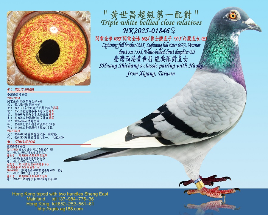 廣東順德鴿友馮有堅先生使翔蓋比白腹號鴿系勇奪三關總冠軍、關關指冠軍、站站指冠軍