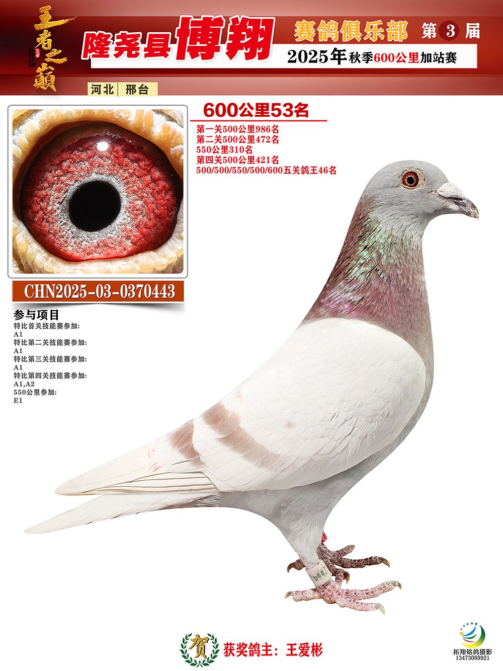 ⑤偏远地区的鸽友请在拍鸽前先联系拍卖方确认是否可以发鸽,联系电话:李先生13833936000