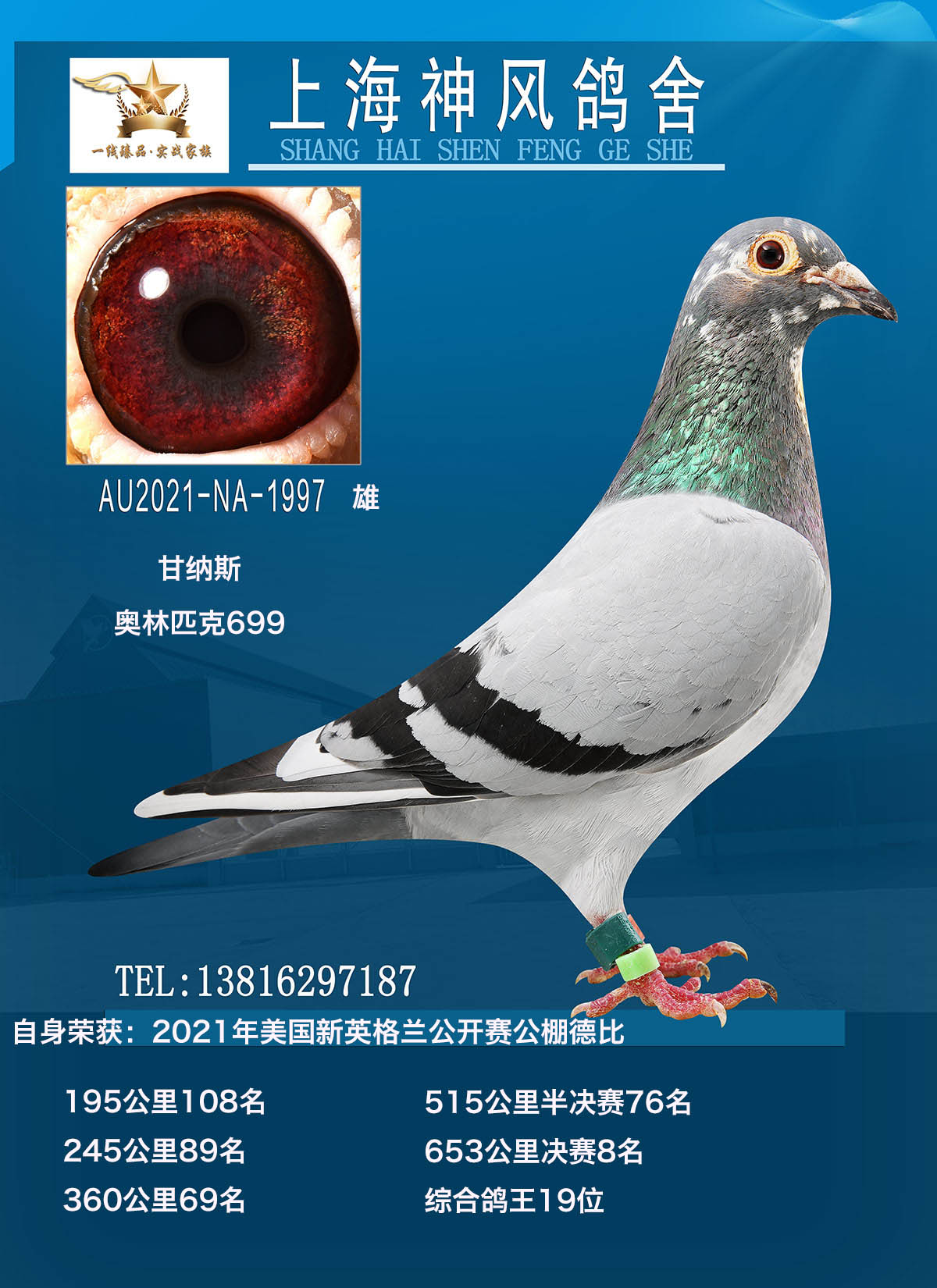 本身获得2021年美国新英格兰德比公棚195公里108名!245公里89名!360公里69名!515公里半决赛76名!决赛653公里8名!五关鸽王19名!