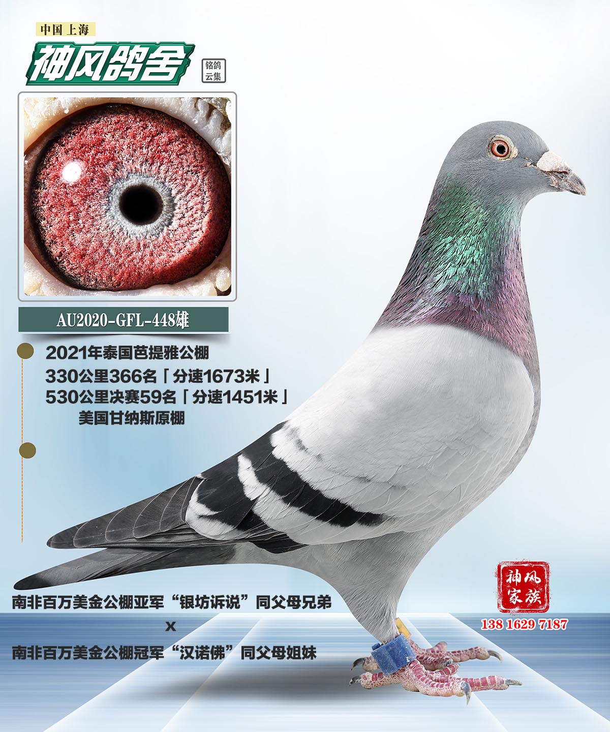 祖父:AU205-GFL-80甘纳斯三大种鸽“银纺诉说”同父母兄弟。银纺诉说获得2013年南非百万美金公棚决赛亚军!