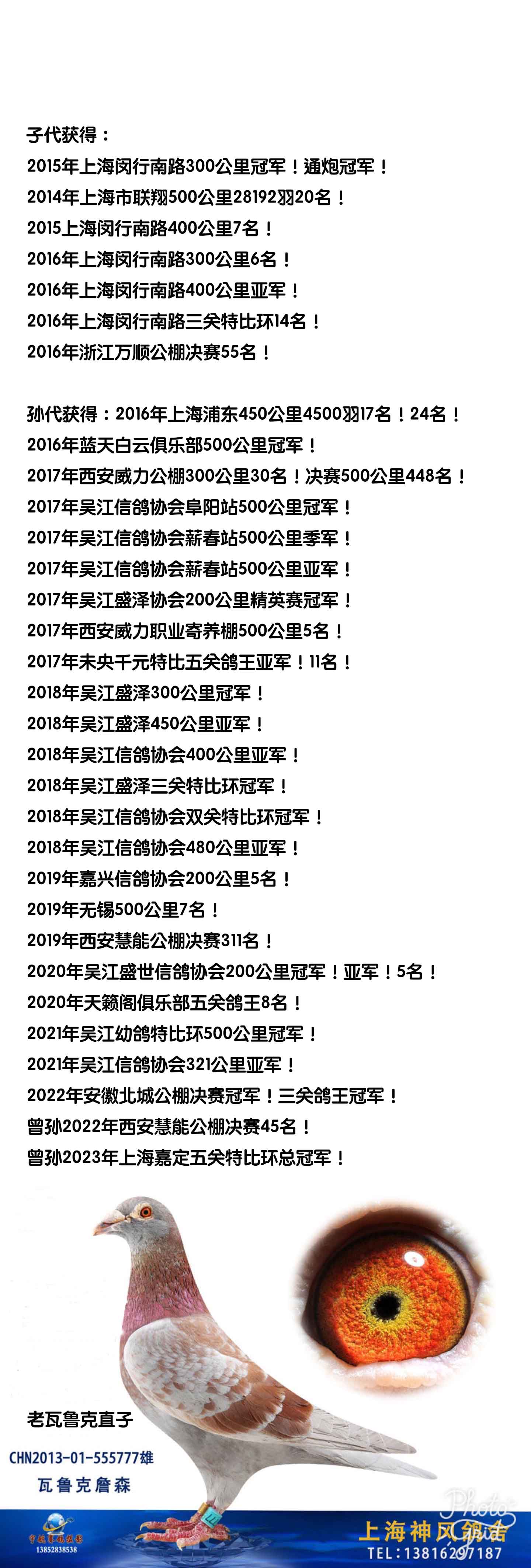 外祖父:老瓦鲁克AU2005-FPC-158美国瓦鲁克詹森!顶级种鸽本身美国三关赛总冠军。作出子代南非百万美金公棚决赛32名。54名。美国600公里冠军。800公里冠军。