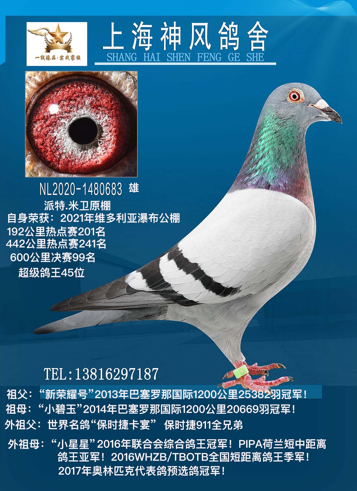 自身荣获2021年维多利亚瀑布公棚192公里热点赛201名!442公里热点赛241名!600公里决赛99名!超级鸽王45名!