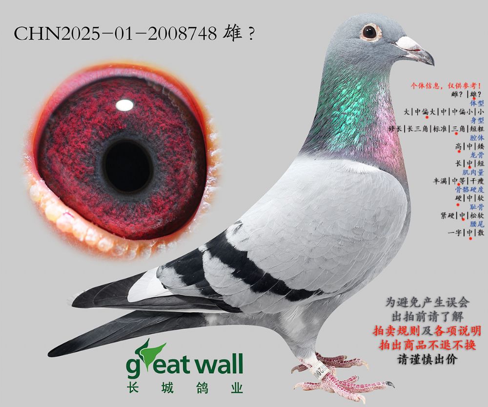 因拍卖鸽均是未做育过的种鸽或幼鸽,图内所标雌雄仅供参考,实际性别已实物为准。