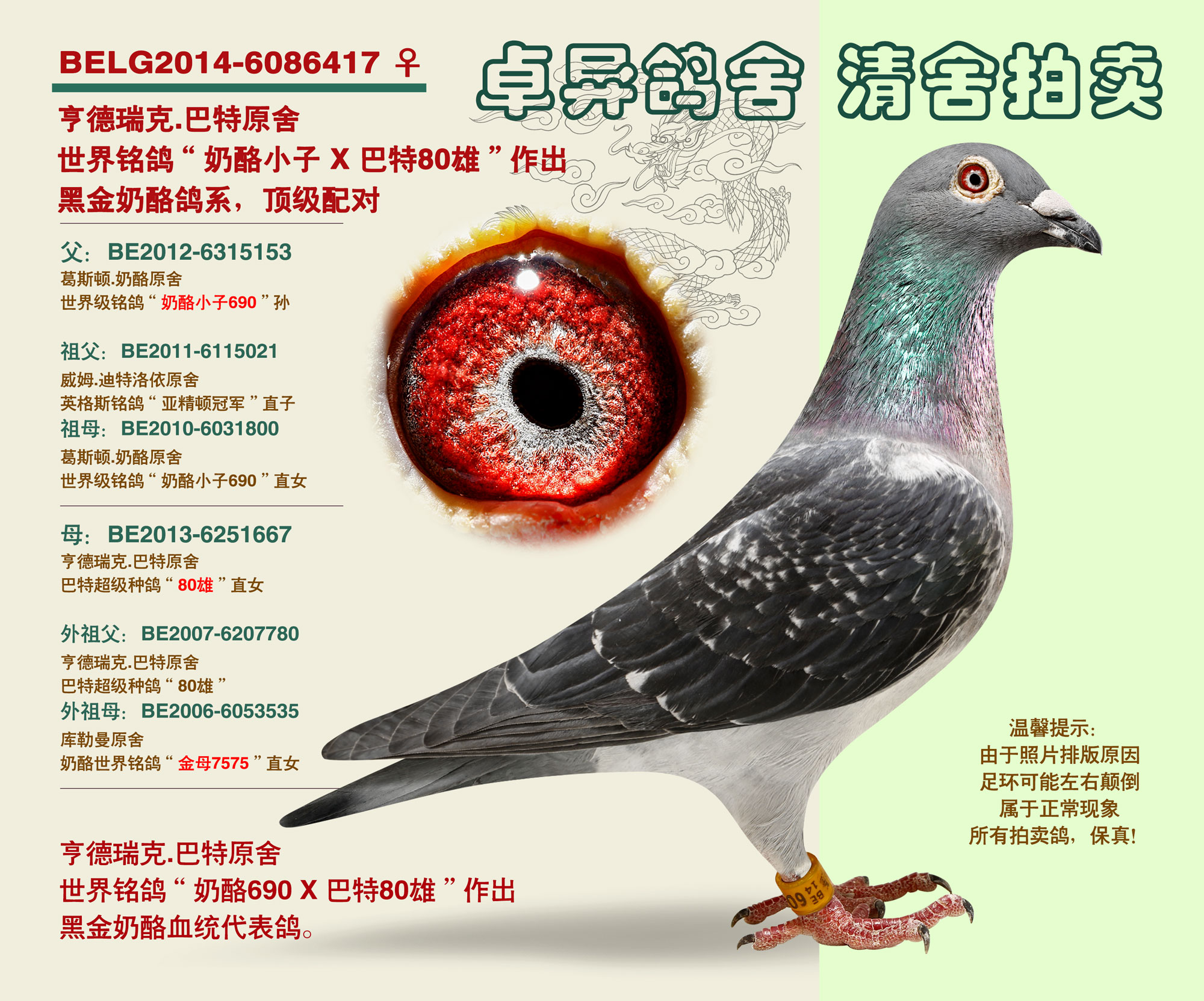 辽宁卓异鸽舍,清舍拍卖,鸽主今年已退休,准备移居海南养老,退出鸽界,舍内诸多世界级超级铭鸽,更是顶级种鸽,斥巨资引进,清舍拍卖,一羽不留,全部在中信网平台,周六(27号)周日(28号)结拍,公平竞拍,共81羽种赛鸽,过后再无,