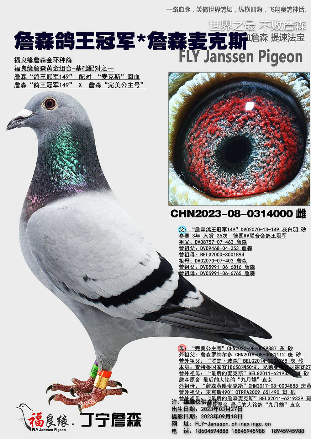 外祖父:“詹森鸽王冠军149”DV02070-13-149 灰白羽 砂