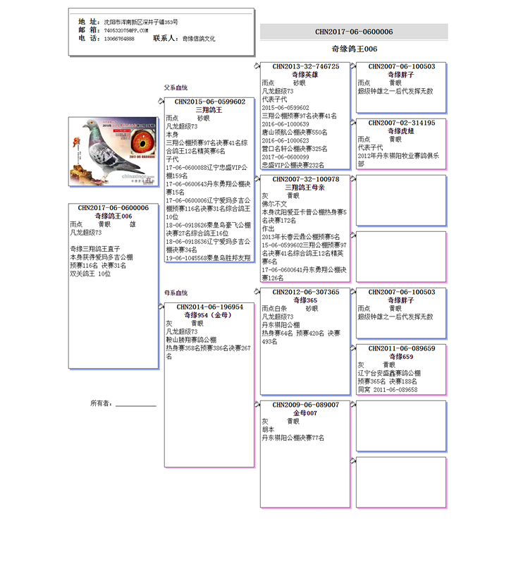3、注明:请注意看种鸽和血统图片,有的种鸽环卡丢失,有些奖鸽无环卡和奖状和血统,介意请勿出价;