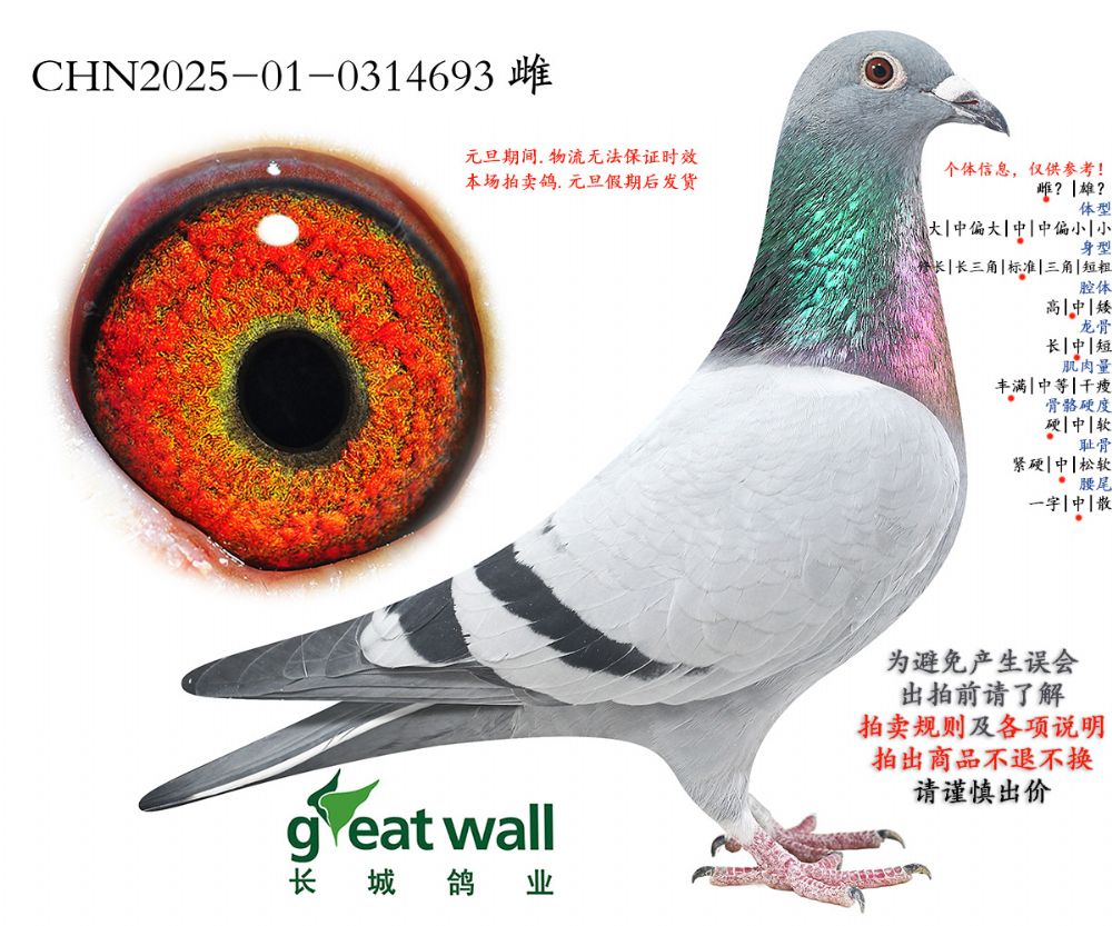 因拍卖鸽均是未做育过的种鸽或幼鸽,图内所标雌雄仅供参考,实际性别已实物为准。