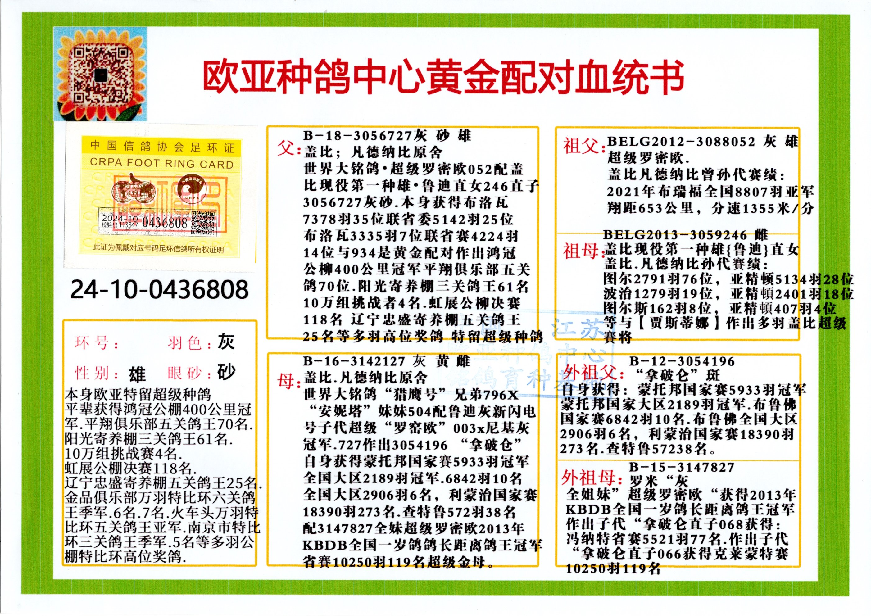 24年秋南京特比环欧亚荣获大团体冠军.小团体冠军551公里大特比13名.14名.16名.19名.20名.21名.24名.26名.27名.28名.42名.52名.54名.57名.65名.66名.68名.70名.71名.72名.74名.76名.80名.82名.83名.84名.85名.86名.90名.92名.110名.116名.121名.122名.128名.131名.158名.161名.164名.165名.166名.172名.174名.177名.182名.195名.196名.201名.205名.208名.210名.216名.253名.269名.275名.276名.294名.296名.299名,,24年秋云南天南铜都公棚决赛415名.天南铜都小棚决赛409名.云南玉活公棚决赛102名.490名.团体32名上笼二羽进二羽,天南铜都大棚506公里决赛445名。热烈祝贺河北省巨鹿县李兰生老师用欧亚泰山号血系连续十一年夺冠军,河北省国家赛冠军.全国季军等多次前十名高位,扬州王军王总用欧亚利奥24年春季获山东翔宇公棚决赛33名盖比53名。南京刘正龙刘总用欧亚盖比获得24年秋山东潍坊国际公棚决赛42名.精英赛30名.三关鸽王71名.决赛86名.加站赛16名.南京市特比环A组鸽王9名.B组鸽王5名.6名.C组鸽王5名.精英赛冠军4名.技能赛A组冠军4名.5名.秦淮区特比环荣获15名.46名.48名.87名。四川西昌徐亮徐总用欧亚利奥获得凉山州聚友决赛177名.第二关亚军双关鸽王19名.三关鸽王105名.云南豪庭公棚决赛603名。热烈祝贺24年四川重庆翔园鸽舍用欧亚泰山号荣获春季400公里冠军.秋季500公里冠军,河北王总用詹森X利奥获得千羽千翔公棚400公里冠军,广东蔡楷焕荣获24年秋爱好者 赛鸽俱乐部三关鸽王季军.一关420公里99名.二关450公里11名.三关520公里32名.单关季军.7名.12名,江西李卫兴荣获贵州红枫公棚8名.共翔俱乐部寄养棚四关综合鸽王30名.一关400公里78名.二关500公里55名.三关520公里37名.四关500公里57名.同父母获公棚18名.雷鸣获得武汉黄浦育翔中心冠军,四川陈文获得四川明鸿俱乐部300公里梦幻2名.3名.4名.9名.10名.13名.14名.15名.31名.34名.40名.41名.42名.43名.69名.71名.72名.73名.74名.94名.95名.97名.98名.99名.419公里决赛荣获总冠军7名.总共归巢9羽,四川徐亮获豪庭决赛603名,山西郑勇获得山西泰鑫公棚决赛255名詹森红狐,热烈祝贺马总获得开尔(飞跃队)决赛9名获奖金1310000万元.第一关52名,天津津福资赛180公里96名.获奖金429543万元,欧亚支持全国鸽友24年秋多人报喜 祝大家取得更好成绩,给欧亚报喜鸽友欧亚决定给每人赠送一羽超级种鸽。欧亚俱乐部特比环多关鸽王成绩:15年秋淮安特比环黑色星期一全会上笼9700多羽,当天无鸽归巢,第二天全会归巢357羽,本舍归巢158羽.前十名八羽.前一百名归巢57羽,16年春季获五关鸽王总冠军,总亚军四名.六名.七名.九名.十名.晶艺俱乐部520公里冠亚季军5名.6名.7名.9名.11名等,火车头冠军.季军6名.8名.9名.10名,16年秋晶艺俱乐部特比环520公里亚军.季军4名.6名.7名.9名,15年春南京白下特比环冠军.亚军.季军6名.7名.8名.9名.10名.指定鸽A B组获得冠军.亚军.季军4名.5名.,17年淮安特比环亚军.4名.5名.7名.8名.10名.六关鸽王总冠军.4名.6名.9名.10名,寄养棚宿迁刘总20羽特比环获冠军.季军.4名.7名.8名.9名等。18年荣获万羽特比环六关鸽王总冠军.总亚军.总季军.6名.8名.十名.单关四羽冠军.二羽亚军.四羽季军.前十名27羽。19年秋万羽特比环六关鸽王总亚军.总季军.5名.8名等,单关二羽冠军.三羽亚军.一羽季军前十名31羽。20年秋淮安市鸽会四关特比环大赛风雨无阻鸽王亚军.鸽王六名,金品俱乐部万羽特比环六关鸽王总冠军,总亚军.四名.五名.六名.七名.八名.十名.前二百名鸽王35羽,单关冠亚季军前十名四十多羽,火车头五关鸽王季军.六名.八名.前二百名鸽王十七羽。20年春荣获淮安五区一市四关鸽王总冠军.亚军.四名.八名.九名。21年秋荣获金品万羽特比环大赛六关鸽王总亚军.总季军.四名.七名.九名.十名.单关冠亚军季军前十名三十多羽。火车头协会鸽王六名.七名.十名.单关前十名十七羽。22年秋荣获鸽王总冠军.总亚军.5名.7名.8名.9名.11名.单关冠亚季军前十名三十多羽,第一关单关前二百名四十多羽,第二关前二百名三十多羽,第三关前二百名四十多羽,第四关前二百名四十多羽,第五关前一百名53羽。23年秋荣获鸽王季军.五名.八名.十名.13名.17名.20名.27名等多羽鸽王.单关前十名二十多羽。公棚.寄养棚部分成绩:16年秋宁夏黄河公棚总冠军电脑戈马力指定通炮冠军,17年送八羽参赛获得鸽王八名进奖四名,支持韩总荣获八名。支持鸽友荣获宁夏中卫公棚决赛总冠军.精英赛冠军,支持18年宁夏黄河公棚决赛冠军詹森X泰山。安徽鼎博寄养棚院内外四关鸽王总冠军.鸽王十七名.三十七名同窝,鸽王39名.42名.58名.67名。18年山东公棚预赛冠军.决赛65名.送八羽进奖五羽.指定获奔驰汽车一辆。支持鸽友获得云南蓝云公棚冠军.盖比X佛卡门。支持鸽友荣获云南银集公棚决赛冠军 詹森427X520血系 速度赛6700羽冠军。17年荣获金马俱乐部寄养棚四关鸽王总冠军.季军.六名.八名.第一关冠军.亚军.季军四名.七名.十一名.金牌教练奖。支持鸽友18年北京费翔公棚预赛九名电脑X桑杰士,支持鸽友荣获陕西威力公棚决赛11名.内蒙古临河寄养棚四关鸽王六名.詹森配泰山,支持河北王总用欧亚詹森427配胡本喜获20年秋开尔青年棚季军。云南东荣公棚16年预赛冠军.决赛77名.17年决赛12名.詹森红狐X泰山,17年平安公棚决赛4名 詹森427。欧亚获得21年金母寄养棚第一关四名.第二关5名.第三关5名.6名.7名.10名.三关鸽王总冠军,四关鸽王14名.十羽鸽王。支持河