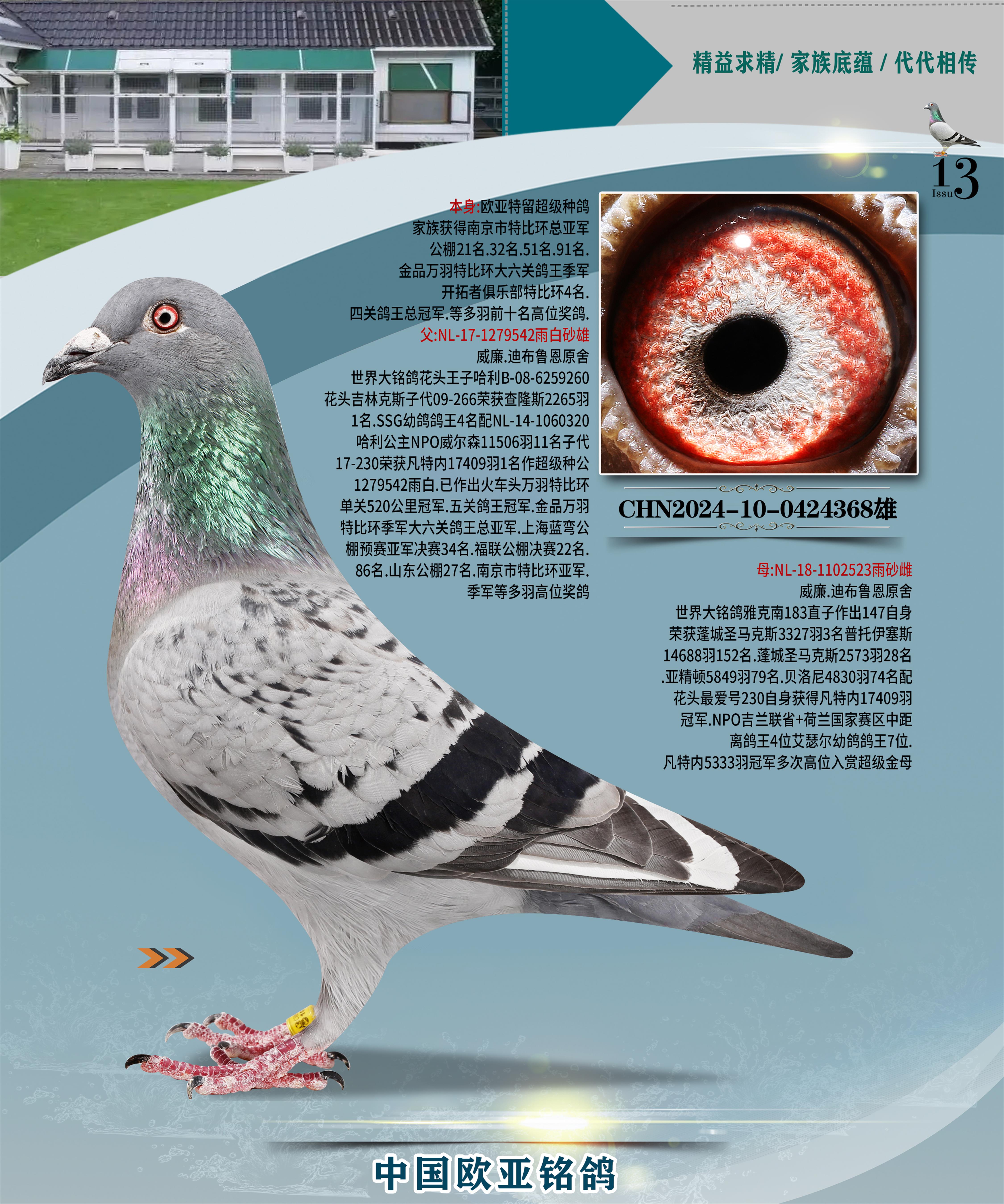 24年秋南京特比环欧亚荣获大团体冠军.小团体冠军551公里大特比13名.14名.16名.19名.20名.21名.24名.26名.27名.28名.42名.52名.54名.57名.65名.66名.68名.70名.71名.72名.74名.76名.80名.82名.83名.84名.85名.86名.90名.92名.110名.116名.121名.122名.128名.131名.158名.161名.164名.165名.166名.172名.174名.177名.182名.195名.196名.201名.205名.208名.210名.216名.253名.269名.275名.276名.294名.296名.299名,,24年秋云南天南铜都公棚决赛415名.天南铜都小棚决赛409名.云南玉活公棚决赛102名.490名.团体32名上笼二羽进二羽,天南铜都大棚506公里决赛445名。热烈祝贺河北省巨鹿县李兰生老师用欧亚泰山号血系连续十一年夺冠军,河北省国家赛冠军.全国季军等多次前十名高位,扬州王军王总用欧亚利奥24年春季获山东翔宇公棚决赛33名盖比53名。南京刘正龙刘总用欧亚盖比获得24年秋山东潍坊国际公棚决赛42名.精英赛30名.三关鸽王71名.决赛86名.加站赛16名.南京市特比环A组鸽王9名.B组鸽王5名.6名.C组鸽王5名.精英赛冠军4名.技能赛A组冠军4名.5名.秦淮区特比环荣获15名.46名.48名.87名。四川西昌徐亮徐总用欧亚利奥获得凉山州聚友决赛177名.第二关亚军双关鸽王19名.三关鸽王105名.云南豪庭公棚决赛603名。热烈祝贺24年四川重庆翔园鸽舍用欧亚泰山号荣获春季400公里冠军.秋季500公里冠军,河北王总用詹森X利奥获得千羽千翔公棚400公里冠军,广东蔡楷焕荣获24年秋爱好者 赛鸽俱乐部三关鸽王季军.一关420公里99名.二关450公里11名.三关520公里32名.单关季军.7名.12名,江西李卫兴荣获贵州红枫公棚8名.共翔俱乐部寄养棚四关综合鸽王30名.一关400公里78名.二关500公里55名.三关520公里37名.四关500公里57名.同父母获公棚18名.雷鸣获得武汉黄浦育翔中心冠军,四川陈文获得四川明鸿俱乐部300公里梦幻2名.3名.4名.9名.10名.13名.14名.15名.31名.34名.40名.41名.42名.43名.69名.71名.72名.73名.74名.94名.95名.97名.98名.99名.419公里决赛荣获总冠军7名.总共归巢9羽,四川徐亮获豪庭决赛603名,山西郑勇获得山西泰鑫公棚决赛255名詹森红狐,热烈祝贺马总获得开尔(飞跃队)决赛9名获奖金1310000万元.第一关52名,天津津福资赛180公里96名.获奖金429543万元,欧亚支持全国鸽友24年秋多人报喜 祝大家取得更好成绩,给欧亚报喜鸽友欧亚决定给每人赠送一羽超级种鸽。欧亚俱乐部特比环多关鸽王成绩:15年秋淮安特比环黑色星期一全会上笼9700多羽,当天无鸽归巢,第二天全会归巢357羽,本舍归巢158羽.前十名八羽.前一百名归巢57羽,16年春季获五关鸽王总冠军,总亚军四名.六名.七名.九名.十名.晶艺俱乐部520公里冠亚季军5名.6名.7名.9名.11名等,火车头冠军.季军6名.8名.9名.10名,16年秋晶艺俱乐部特比环520公里亚军.季军4名.6名.7名.9名,15年春南京白下特比环冠军.亚军.季军6名.7名.8名.9名.10名.指定鸽A B组获得冠军.亚军.季军4名.5名.,17年淮安特比环亚军.4名.5名.7名.8名.10名.六关鸽王总冠军.4名.6名.9名.10名,寄养棚宿迁刘总20羽特比环获冠军.季军.4名.7名.8名.9名等。18年荣获万羽特比环六关鸽王总冠军.总亚军.总季军.6名.8名.十名.单关四羽冠军.二羽亚军.四羽季军.前十名27羽。19年秋万羽特比环六关鸽王总亚军.总季军.5名.8名等,单关二羽冠军.三羽亚军.一羽季军前十名31羽。20年秋淮安市鸽会四关特比环大赛风雨无阻鸽王亚军.鸽王六名,金品俱乐部万羽特比环六关鸽王总冠军,总亚军.四名.五名.六名.七名.八名.十名.前二百名鸽王35羽,单关冠亚季军前十名四十多羽,火车头五关鸽王季军.六名.八名.前二百名鸽王十七羽。20年春荣获淮安五区一市四关鸽王总冠军.亚军.四名.八名.九名。21年秋荣获金品万羽特比环大赛六关鸽王总亚军.总季军.四名.七名.九名.十名.单关冠亚军季军前十名三十多羽。火车头协会鸽王六名.七名.十名.单关前十名十七羽。22年秋荣获鸽王总冠军.总亚军.5名.7名.8名.9名.11名.单关冠亚季军前十名三十多羽,第一关单关前二百名四十多羽,第二关前二百名三十多羽,第三关前二百名四十多羽,第四关前二百名四十多羽,第五关前一百名53羽。23年秋荣获鸽王季军.五名.八名.十名.13名.17名.20名.27名等多羽鸽王.单关前十名二十多羽。公棚.寄养棚部分成绩:16年秋宁夏黄河公棚总冠军电脑戈马力指定通炮冠军,17年送八羽参赛获得鸽王八名进奖四名,支持韩总荣获八名。支持鸽友荣获宁夏中卫公棚决赛总冠军.精英赛冠军,支持18年宁夏黄河公棚决赛冠军詹森X泰山。安徽鼎博寄养棚院内外四关鸽王总冠军.鸽王十七名.三十七名同窝,鸽王39名.42名.58名.67名。18年山东公棚预赛冠军.决赛65名.送八羽进奖五羽.指定获奔驰汽车一辆。支持鸽友获得云南蓝云公棚冠军.盖比X佛卡门。支持鸽友荣获云南银集公棚决赛冠军 詹森427X520血系 速度赛6700羽冠军。17年荣获金马俱乐部寄养棚四关鸽王总冠军.季军.六名.八名.第一关冠军.亚军.季军四名.七名.十一名.金牌教练奖。支持鸽友18年北京费翔公棚预赛九名电脑X桑杰士,支持鸽友荣获陕西威力公棚决赛11名.内蒙古临河寄养棚四关鸽王六名.詹森配泰山,支持河北王总用欧亚詹森427配胡本喜获20年秋开尔青年棚季军。云南东荣公棚16年预赛冠军.决赛77名.17年决赛12名.詹森红狐X泰山,17年平安公棚决赛4名 詹森427。欧亚获得21年金母寄养棚第一关四名.第二关5名.第三关5名.6名.7名.10名.三关鸽王总冠军,四关鸽王14名.十羽鸽王。支持河