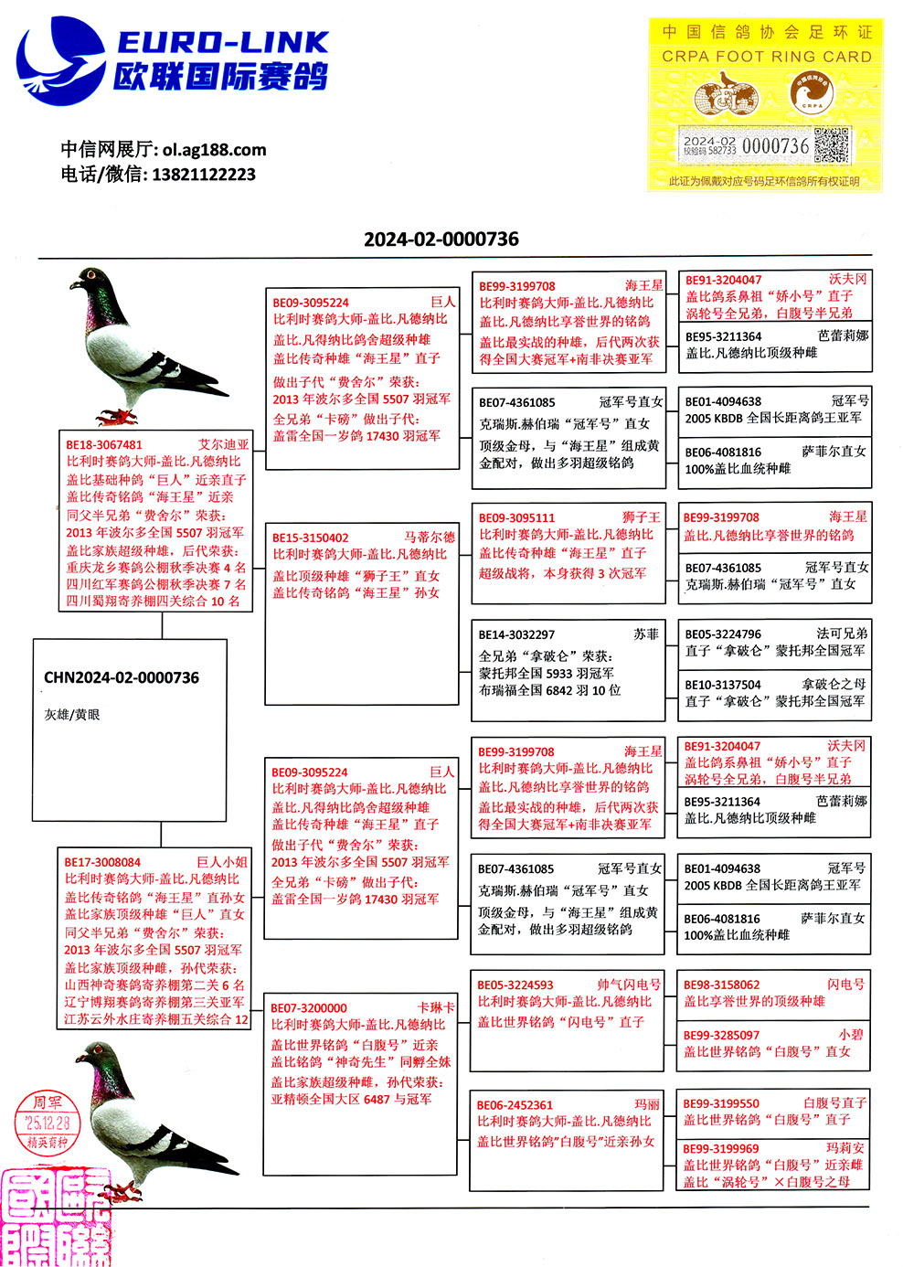 1636460 最佳基特尔家族全国鸽王直子 ¥6500元 8次