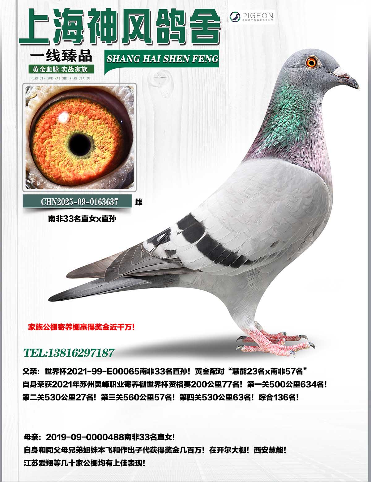 同父母平辈获得2019年上海君冠公棚预赛11名。决赛8名。2020年西安威力慧能公棚300公里29名。400公里17名。530公里434名赢得奖金60万。2020年西安威力慧能决赛469名。2021年江苏爱翔公棚决赛62名!兄弟姐妹作出江浙沪和协会成绩鸽两年之内获奖30余只