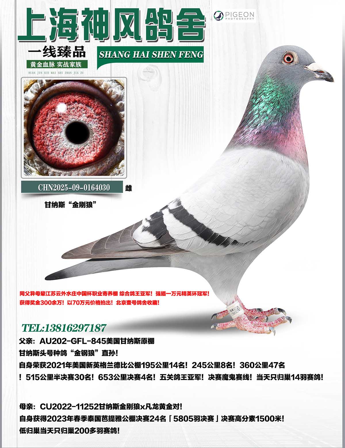 同父异母辈江苏云外水庄中国杯职业寄养棚!首关32名!二关135名!两关综合20名!三关140名! 四关71名!五关13名!综合鸽王亚军!强插一万元精英环冠军!获得奖金300万余!以70万元价格拍出!北京壹号鸽舍收藏!
