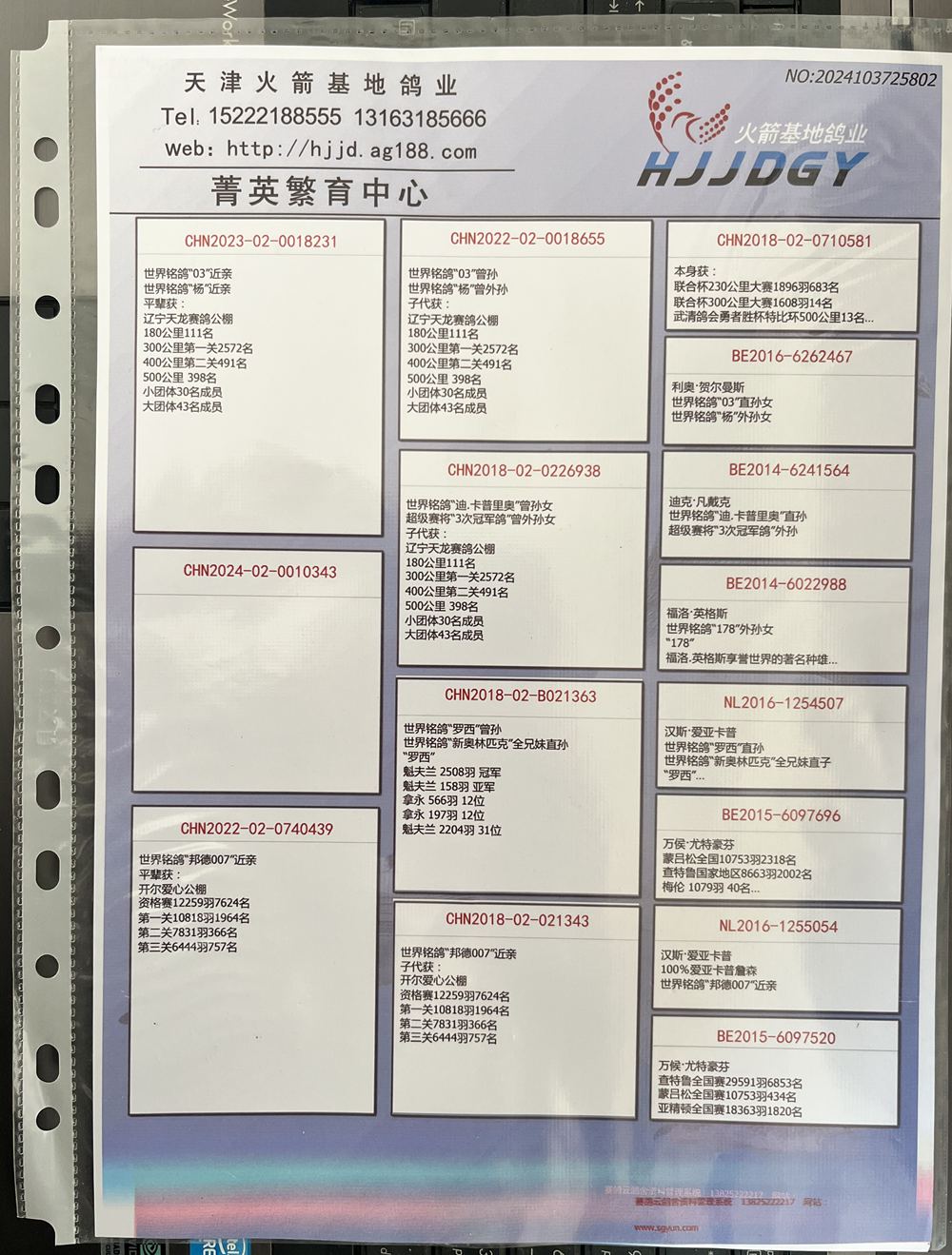 父:CHN2023-02-0018231 世界铭鸽“03"近亲世界铭鸽“杨”近亲平辈获:辽宁天龙赛鸽公棚180公里111名,300公里第一关2572名,400公里第二关491名,500公里398名,小团体30名成员,大团体43名成员