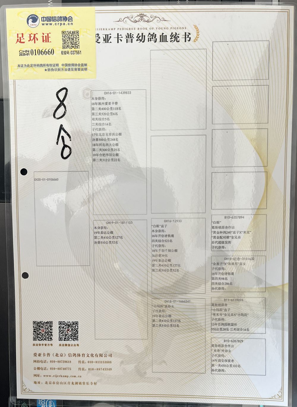 父:CH16-01-1439833 本身获得:16年深州爱亚卡普第二关400公里118名,第三关520公里6名,双关综合5名,三关综合14名 子代获得:17年北京克劳沃公棚决赛500公里248名,18年河北垣大公棚第二关300公里25名,19年合肥华羽公棚第二关312公里22名