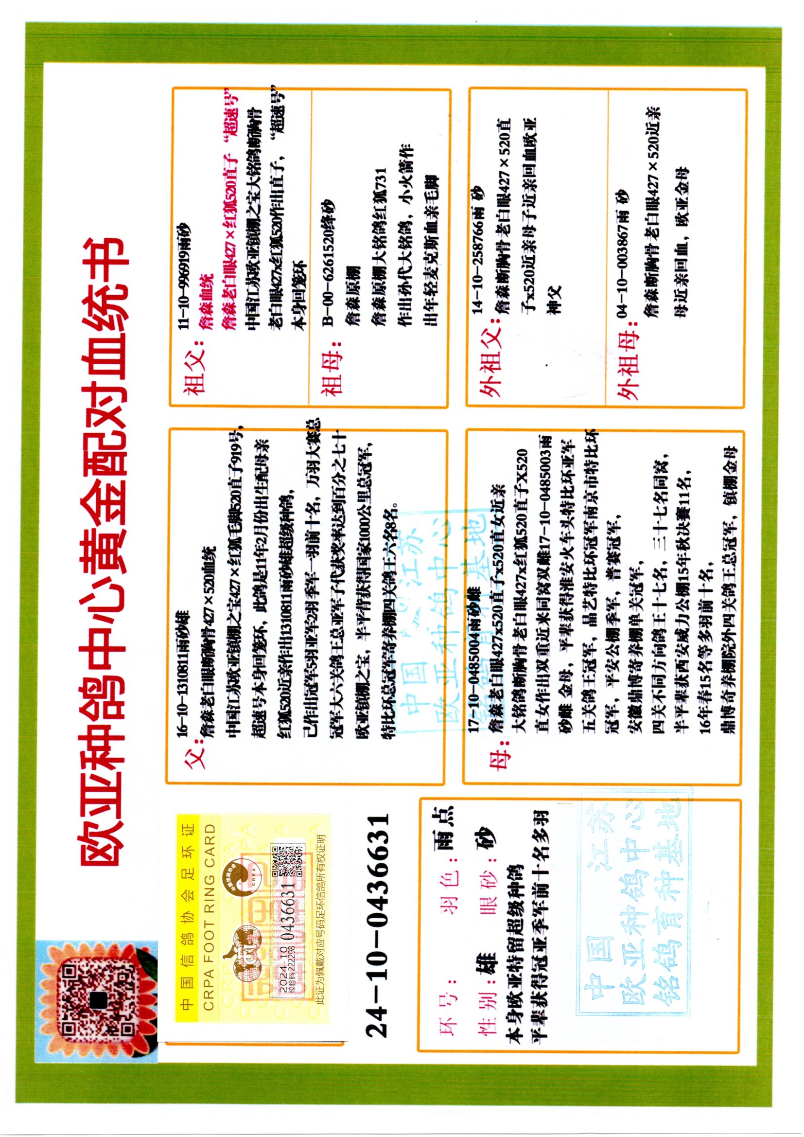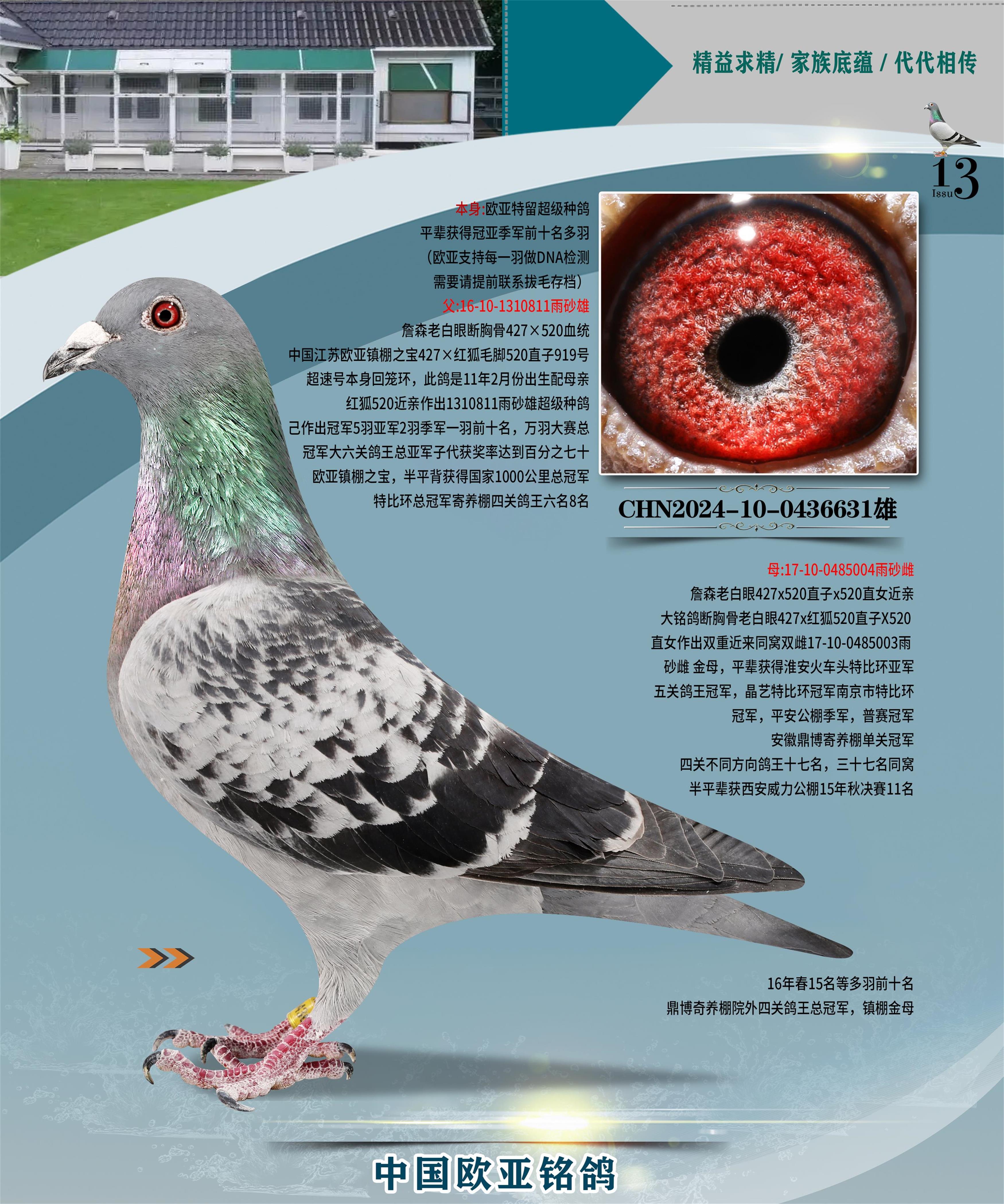 24年秋南京特比环欧亚荣获大团体冠军.小团体冠军551公里大特比13名.14名.16名.19名.20名.21名.24名.26名.27名.28名.42名.52名.54名.57名.65名.66名.68名.70名.71名.72名.74名.76名.80名.82名.83名.84名.85名.86名.90名.92名.110名.116名.121名.122名.128名.131名.158名.161名.164名.165名.166名.172名.174名.177名.182名.195名.196名.201名.205名.208名.210名.216名.253名.269名.275名.276名.294名.296名.299名,,24年秋云南天南铜都公棚决赛415名.天南铜都小棚决赛409名.云南玉活公棚决赛102名.490名.团体32名上笼二羽进二羽,天南铜都大棚506公里决赛445名。热烈祝贺河北省巨鹿县李兰生老师用欧亚泰山号血系连续十一年夺冠军,河北省国家赛冠军.全国季军等多次前十名高位,扬州王军王总用欧亚利奥24年春季获山东翔宇公棚决赛33名盖比53名。南京刘正龙刘总用欧亚盖比获得24年秋山东潍坊国际公棚决赛42名.精英赛30名.三关鸽王71名.决赛86名.加站赛16名.南京市特比环A组鸽王9名.B组鸽王5名.6名.C组鸽王5名.精英赛冠军4名.技能赛A组冠军4名.5名.秦淮区特比环荣获15名.46名.48名.87名。四川西昌徐亮徐总用欧亚利奥获得凉山州聚友决赛177名.第二关亚军双关鸽王19名.三关鸽王105名.云南豪庭公棚决赛603名。热烈祝贺24年四川重庆翔园鸽舍用欧亚泰山号荣获春季400公里冠军.秋季500公里冠军,河北王总用詹森X利奥获得千羽千翔公棚400公里冠军,广东蔡楷焕荣获24年秋爱好者 赛鸽俱乐部三关鸽王季军.一关420公里99名.二关450公里11名.三关520公里32名.单关季军.7名.12名,江西李卫兴荣获贵州红枫公棚8名.共翔俱乐部寄养棚四关综合鸽王30名.一关400公里78名.二关500公里55名.三关520公里37名.四关500公里57名.同父母获公棚18名.雷鸣获得武汉黄浦育翔中心冠军,四川陈文获得四川明鸿俱乐部300公里梦幻2名.3名.4名.9名.10名.13名.14名.15名.31名.34名.40名.41名.42名.43名.69名.71名.72名.73名.74名.94名.95名.97名.98名.99名.419公里决赛荣获总冠军7名.总共归巢9羽,四川徐亮获豪庭决赛603名,山西郑勇获得山西泰鑫公棚决赛255名詹森红狐,热烈祝贺马总获得开尔(飞跃队)决赛9名获奖金1310000万元.第一关52名,天津津福资赛180公里96名.获奖金429543万元,欧亚支持全国鸽友24年秋多人报喜 祝大家取得更好成绩,给欧亚报喜鸽友欧亚决定给每人赠送一羽超级种鸽。欧亚俱乐部特比环多关鸽王成绩:15年秋淮安特比环黑色星期一全会上笼9700多羽,当天无鸽归巢,第二天全会归巢357羽,本舍归巢158羽.前十名八羽.前一百名归巢57羽,16年春季获五关鸽王总冠军,总亚军四名.六名.七名.九名.十名.晶艺俱乐部520公里冠亚季军5名.6名.7名.9名.11名等,火车头冠军.季军6名.8名.9名.10名,16年秋晶艺俱乐部特比环520公里亚军.季军4名.6名.7名.9名,15年春南京白下特比环冠军.亚军.季军6名.7名.8名.9名.10名.指定鸽A B组获得冠军.亚军.季军4名.5名.,17年淮安特比环亚军.4名.5名.7名.8名.10名.六关鸽王总冠军.4名.6名.9名.10名,寄养棚宿迁刘总20羽特比环获冠军.季军.4名.7名.8名.9名等。18年荣获万羽特比环六关鸽王总冠军.总亚军.总季军.6名.8名.十名.单关四羽冠军.二羽亚军.四羽季军.前十名27羽。19年秋万羽特比环六关鸽王总亚军.总季军.5名.8名等,单关二羽冠军.三羽亚军.一羽季军前十名31羽。20年秋淮安市鸽会四关特比环大赛风雨无阻鸽王亚军.鸽王六名,金品俱乐部万羽特比环六关鸽王总冠军,总亚军.四名.五名.六名.七名.八名.十名.前二百名鸽王35羽,单关冠亚季军前十名四十多羽,火车头五关鸽王季军.六名.八名.前二百名鸽王十七羽。20年春荣获淮安五区一市四关鸽王总冠军.亚军.四名.八名.九名。21年秋荣获金品万羽特比环大赛六关鸽王总亚军.总季军.四名.七名.九名.十名.单关冠亚军季军前十名三十多羽。火车头协会鸽王六名.七名.十名.单关前十名十七羽。22年秋荣获鸽王总冠军.总亚军.5名.7名.8名.9名.11名.单关冠亚季军前十名三十多羽,第一关单关前二百名四十多羽,第二关前二百名三十多羽,第三关前二百名四十多羽,第四关前二百名四十多羽,第五关前一百名53羽。23年秋荣获鸽王季军.五名.八名.十名.13名.17名.20名.27名等多羽鸽王.单关前十名二十多羽。公棚.寄养棚部分成绩:16年秋宁夏黄河公棚总冠军电脑戈马力指定通炮冠军,17年送八羽参赛获得鸽王八名进奖四名,支持韩总荣获八名。支持鸽友荣获宁夏中卫公棚决赛总冠军.精英赛冠军,支持18年宁夏黄河公棚决赛冠军詹森X泰山。安徽鼎博寄养棚院内外四关鸽王总冠军.鸽王十七名.三十七名同窝,鸽王39名.42名.58名.67名。18年山东公棚预赛冠军.决赛65名.送八羽进奖五羽.指定获奔驰汽车一辆。支持鸽友获得云南蓝云公棚冠军.盖比X佛卡门。支持鸽友荣获云南银集公棚决赛冠军 詹森427X520血系 速度赛6700羽冠军。17年荣获金马俱乐部寄养棚四关鸽王总冠军.季军.六名.八名.第一关冠军.亚军.季军四名.七名.十一名.金牌教练奖。支持鸽友18年北京费翔公棚预赛九名电脑X桑杰士,支持鸽友荣获陕西威力公棚决赛11名.内蒙古临河寄养棚四关鸽王六名.詹森配泰山,支持河北王总用欧亚詹森427配胡本喜获20年秋开尔青年棚季军。云南东荣公棚16年预赛冠军.决赛77名.17年决赛12名.詹森红狐X泰山,17年平安公棚决赛4名 詹森427。欧亚获得21年金母寄养棚第一关四名.第二关5名.第三关5名.6名.7名.10名.三关鸽王总冠军,四关鸽王14名.十羽鸽王。支持河