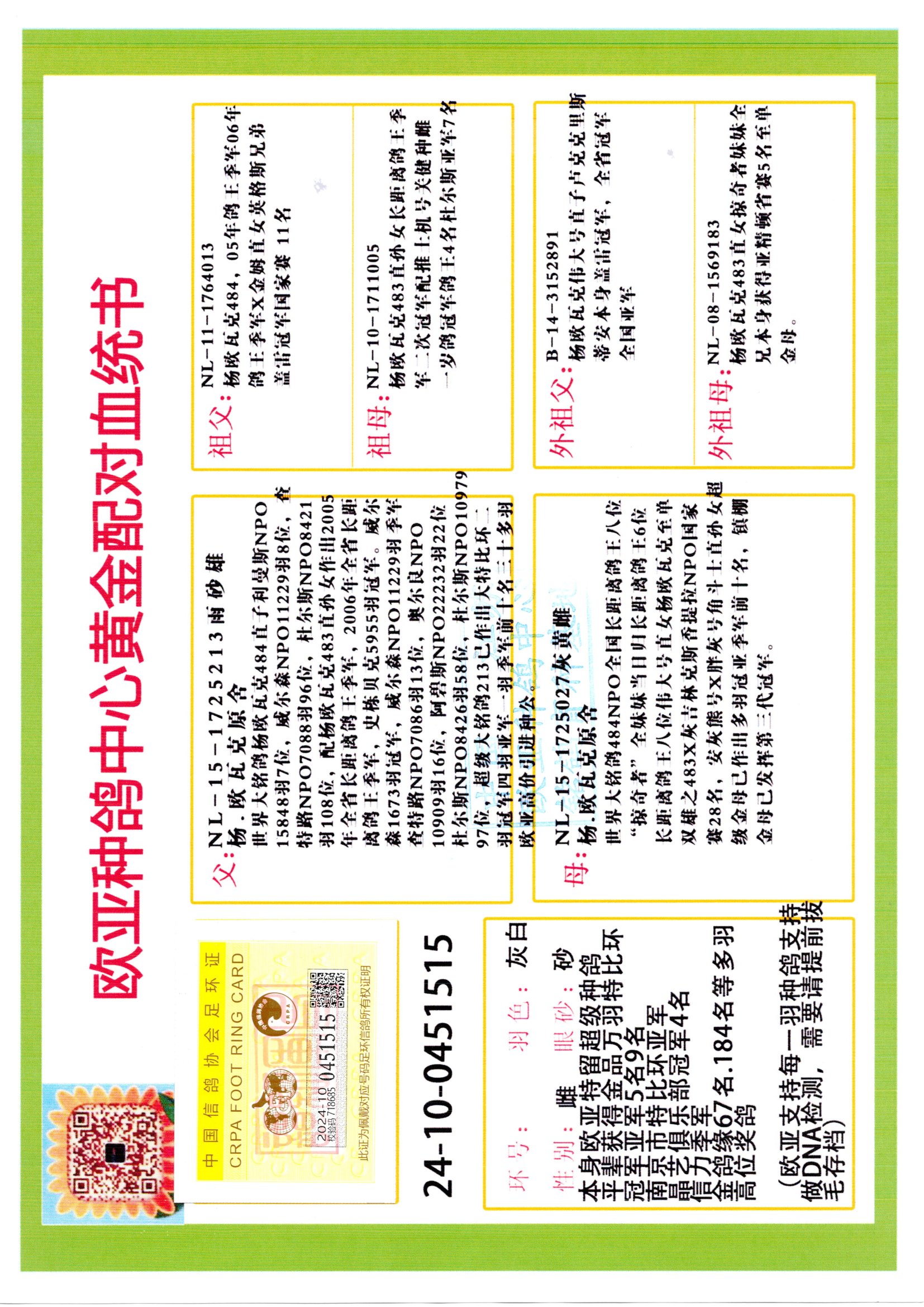 24年秋南京特比环欧亚荣获大团体冠军.小团体冠军551公里大特比13名.14名.16名.19名.20名.21名.24名.26名.27名.28名.42名.52名.54名.57名.65名.66名.68名.70名.71名.72名.74名.76名.80名.82名.83名.84名.85名.86名.90名.92名.110名.116名.121名.122名.128名.131名.158名.161名.164名.165名.166名.172名.174名.177名.182名.195名.196名.201名.205名.208名.210名.216名.253名.269名.275名.276名.294名.296名.299名,,24年秋云南天南铜都公棚决赛415名.天南铜都小棚决赛409名.云南玉活公棚决赛102名.490名.团体32名上笼二羽进二羽,天南铜都大棚506公里决赛445名。热烈祝贺河北省巨鹿县李兰生老师用欧亚泰山号血系连续十一年夺冠军,河北省国家赛冠军.全国季军等多次前十名高位,扬州王军王总用欧亚利奥24年春季获山东翔宇公棚决赛33名盖比53名。南京刘正龙刘总用欧亚盖比获得24年秋山东潍坊国际公棚决赛42名.精英赛30名.三关鸽王71名.决赛86名.加站赛16名.南京市特比环A组鸽王9名.B组鸽王5名.6名.C组鸽王5名.精英赛冠军4名.技能赛A组冠军4名.5名.秦淮区特比环荣获15名.46名.48名.87名。四川西昌徐亮徐总用欧亚利奥获得凉山州聚友决赛177名.第二关亚军双关鸽王19名.三关鸽王105名.云南豪庭公棚决赛603名。热烈祝贺24年四川重庆翔园鸽舍用欧亚泰山号荣获春季400公里冠军.秋季500公里冠军,河北王总用詹森X利奥获得千羽千翔公棚400公里冠军,广东蔡楷焕荣获24年秋爱好者 赛鸽俱乐部三关鸽王季军.一关420公里99名.二关450公里11名.三关520公里32名.单关季军.7名.12名,江西李卫兴荣获贵州红枫公棚8名.共翔俱乐部寄养棚四关综合鸽王30名.一关400公里78名.二关500公里55名.三关520公里37名.四关500公里57名.同父母获公棚18名.雷鸣获得武汉黄浦育翔中心冠军,四川陈文获得四川明鸿俱乐部300公里梦幻2名.3名.4名.9名.10名.13名.14名.15名.31名.34名.40名.41名.42名.43名.69名.71名.72名.73名.74名.94名.95名.97名.98名.99名.419公里决赛荣获总冠军7名.总共归巢9羽,四川徐亮获豪庭决赛603名,山西郑勇获得山西泰鑫公棚决赛255名詹森红狐,热烈祝贺马总获得开尔(飞跃队)决赛9名获奖金1310000万元.第一关52名,天津津福资赛180公里96名.获奖金429543万元,欧亚支持全国鸽友24年秋多人报喜 祝大家取得更好成绩,给欧亚报喜鸽友欧亚决定给每人赠送一羽超级种鸽。欧亚俱乐部特比环多关鸽王成绩:15年秋淮安特比环黑色星期一全会上笼9700多羽,当天无鸽归巢,第二天全会归巢357羽,本舍归巢158羽.前十名八羽.前一百名归巢57羽,16年春季获五关鸽王总冠军,总亚军四名.六名.七名.九名.十名.晶艺俱乐部520公里冠亚季军5名.6名.7名.9名.11名等,火车头冠军.季军6名.8名.9名.10名,16年秋晶艺俱乐部特比环520公里亚军.季军4名.6名.7名.9名,15年春南京白下特比环冠军.亚军.季军6名.7名.8名.9名.10名.指定鸽A B组获得冠军.亚军.季军4名.5名.,17年淮安特比环亚军.4名.5名.7名.8名.10名.六关鸽王总冠军.4名.6名.9名.10名,寄养棚宿迁刘总20羽特比环获冠军.季军.4名.7名.8名.9名等。18年荣获万羽特比环六关鸽王总冠军.总亚军.总季军.6名.8名.十名.单关四羽冠军.二羽亚军.四羽季军.前十名27羽。19年秋万羽特比环六关鸽王总亚军.总季军.5名.8名等,单关二羽冠军.三羽亚军.一羽季军前十名31羽。20年秋淮安市鸽会四关特比环大赛风雨无阻鸽王亚军.鸽王六名,金品俱乐部万羽特比环六关鸽王总冠军,总亚军.四名.五名.六名.七名.八名.十名.前二百名鸽王35羽,单关冠亚季军前十名四十多羽,火车头五关鸽王季军.六名.八名.前二百名鸽王十七羽。20年春荣获淮安五区一市四关鸽王总冠军.亚军.四名.八名.九名。21年秋荣获金品万羽特比环大赛六关鸽王总亚军.总季军.四名.七名.九名.十名.单关冠亚军季军前十名三十多羽。火车头协会鸽王六名.七名.十名.单关前十名十七羽。22年秋荣获鸽王总冠军.总亚军.5名.7名.8名.9名.11名.单关冠亚季军前十名三十多羽,第一关单关前二百名四十多羽,第二关前二百名三十多羽,第三关前二百名四十多羽,第四关前二百名四十多羽,第五关前一百名53羽。23年秋荣获鸽王季军.五名.八名.十名.13名.17名.20名.27名等多羽鸽王.单关前十名二十多羽。公棚.寄养棚部分成绩:16年秋宁夏黄河公棚总冠军电脑戈马力指定通炮冠军,17年送八羽参赛获得鸽王八名进奖四名,支持韩总荣获八名。支持鸽友荣获宁夏中卫公棚决赛总冠军.精英赛冠军,支持18年宁夏黄河公棚决赛冠军詹森X泰山。安徽鼎博寄养棚院内外四关鸽王总冠军.鸽王十七名.三十七名同窝,鸽王39名.42名.58名.67名。18年山东公棚预赛冠军.决赛65名.送八羽进奖五羽.指定获奔驰汽车一辆。支持鸽友获得云南蓝云公棚冠军.盖比X佛卡门。支持鸽友荣获云南银集公棚决赛冠军 詹森427X520血系 速度赛6700羽冠军。17年荣获金马俱乐部寄养棚四关鸽王总冠军.季军.六名.八名.第一关冠军.亚军.季军四名.七名.十一名.金牌教练奖。支持鸽友18年北京费翔公棚预赛九名电脑X桑杰士,支持鸽友荣获陕西威力公棚决赛11名.内蒙古临河寄养棚四关鸽王六名.詹森配泰山,支持河北王总用欧亚詹森427配胡本喜获20年秋开尔青年棚季军。云南东荣公棚16年预赛冠军.决赛77名.17年决赛12名.詹森红狐X泰山,17年平安公棚决赛4名 詹森427。欧亚获得21年金母寄养棚第一关四名.第二关5名.第三关5名.6名.7名.10名.三关鸽王总冠军,四关鸽王14名.十羽鸽王。支持河