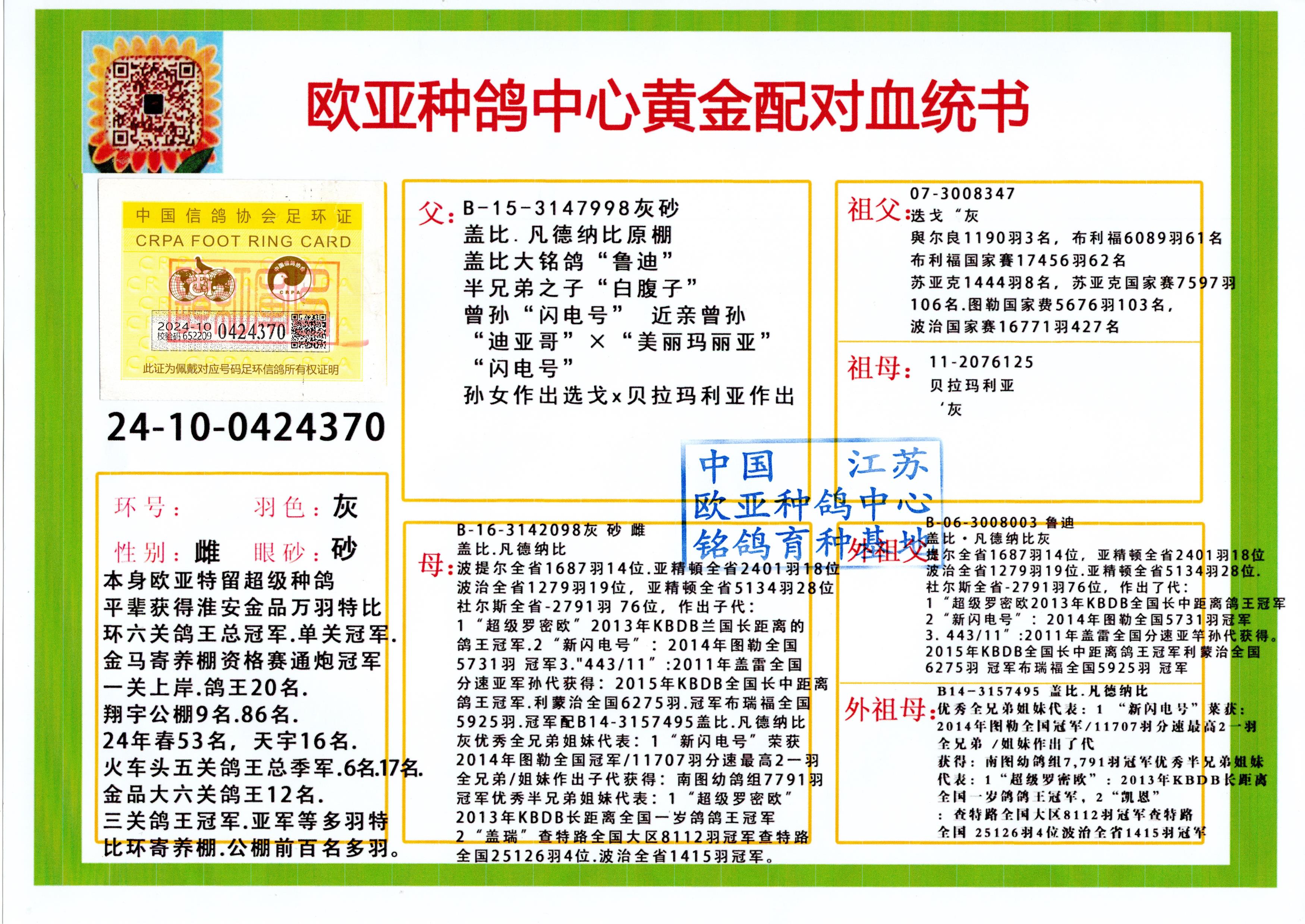 24年秋南京特比环欧亚荣获大团体冠军.小团体冠军551公里大特比13名.14名.16名.19名.20名.21名.24名.26名.27名.28名.42名.52名.54名.57名.65名.66名.68名.70名.71名.72名.74名.76名.80名.82名.83名.84名.85名.86名.90名.92名.110名.116名.121名.122名.128名.131名.158名.161名.164名.165名.166名.172名.174名.177名.182名.195名.196名.201名.205名.208名.210名.216名.253名.269名.275名.276名.294名.296名.299名,,24年秋云南天南铜都公棚决赛415名.天南铜都小棚决赛409名.云南玉活公棚决赛102名.490名.团体32名上笼二羽进二羽,天南铜都大棚506公里决赛445名。热烈祝贺河北省巨鹿县李兰生老师用欧亚泰山号血系连续十一年夺冠军,河北省国家赛冠军.全国季军等多次前十名高位,扬州王军王总用欧亚利奥24年春季获山东翔宇公棚决赛33名盖比53名。南京刘正龙刘总用欧亚盖比获得24年秋山东潍坊国际公棚决赛42名.精英赛30名.三关鸽王71名.决赛86名.加站赛16名.南京市特比环A组鸽王9名.B组鸽王5名.6名.C组鸽王5名.精英赛冠军4名.技能赛A组冠军4名.5名.秦淮区特比环荣获15名.46名.48名.87名。四川西昌徐亮徐总用欧亚利奥获得凉山州聚友决赛177名.第二关亚军双关鸽王19名.三关鸽王105名.云南豪庭公棚决赛603名。热烈祝贺24年四川重庆翔园鸽舍用欧亚泰山号荣获春季400公里冠军.秋季500公里冠军,河北王总用詹森X利奥获得千羽千翔公棚400公里冠军,广东蔡楷焕荣获24年秋爱好者 赛鸽俱乐部三关鸽王季军.一关420公里99名.二关450公里11名.三关520公里32名.单关季军.7名.12名,江西李卫兴荣获贵州红枫公棚8名.共翔俱乐部寄养棚四关综合鸽王30名.一关400公里78名.二关500公里55名.三关520公里37名.四关500公里57名.同父母获公棚18名.雷鸣获得武汉黄浦育翔中心冠军,四川陈文获得四川明鸿俱乐部300公里梦幻2名.3名.4名.9名.10名.13名.14名.15名.31名.34名.40名.41名.42名.43名.69名.71名.72名.73名.74名.94名.95名.97名.98名.99名.419公里决赛荣获总冠军7名.总共归巢9羽,四川徐亮获豪庭决赛603名,山西郑勇获得山西泰鑫公棚决赛255名詹森红狐,热烈祝贺马总获得开尔(飞跃队)决赛9名获奖金1310000万元.第一关52名,天津津福资赛180公里96名.获奖金429543万元,欧亚支持全国鸽友24年秋多人报喜 祝大家取得更好成绩,给欧亚报喜鸽友欧亚决定给每人赠送一羽超级种鸽。欧亚俱乐部特比环多关鸽王成绩:15年秋淮安特比环黑色星期一全会上笼9700多羽,当天无鸽归巢,第二天全会归巢357羽,本舍归巢158羽.前十名八羽.前一百名归巢57羽,16年春季获五关鸽王总冠军,总亚军四名.六名.七名.九名.十名.晶艺俱乐部520公里冠亚季军5名.6名.7名.9名.11名等,火车头冠军.季军6名.8名.9名.10名,16年秋晶艺俱乐部特比环520公里亚军.季军4名.6名.7名.9名,15年春南京白下特比环冠军.亚军.季军6名.7名.8名.9名.10名.指定鸽A B组获得冠军.亚军.季军4名.5名.,17年淮安特比环亚军.4名.5名.7名.8名.10名.六关鸽王总冠军.4名.6名.9名.10名,寄养棚宿迁刘总20羽特比环获冠军.季军.4名.7名.8名.9名等。18年荣获万羽特比环六关鸽王总冠军.总亚军.总季军.6名.8名.十名.单关四羽冠军.二羽亚军.四羽季军.前十名27羽。19年秋万羽特比环六关鸽王总亚军.总季军.5名.8名等,单关二羽冠军.三羽亚军.一羽季军前十名31羽。20年秋淮安市鸽会四关特比环大赛风雨无阻鸽王亚军.鸽王六名,金品俱乐部万羽特比环六关鸽王总冠军,总亚军.四名.五名.六名.七名.八名.十名.前二百名鸽王35羽,单关冠亚季军前十名四十多羽,火车头五关鸽王季军.六名.八名.前二百名鸽王十七羽。20年春荣获淮安五区一市四关鸽王总冠军.亚军.四名.八名.九名。21年秋荣获金品万羽特比环大赛六关鸽王总亚军.总季军.四名.七名.九名.十名.单关冠亚军季军前十名三十多羽。火车头协会鸽王六名.七名.十名.单关前十名十七羽。22年秋荣获鸽王总冠军.总亚军.5名.7名.8名.9名.11名.单关冠亚季军前十名三十多羽,第一关单关前二百名四十多羽,第二关前二百名三十多羽,第三关前二百名四十多羽,第四关前二百名四十多羽,第五关前一百名53羽。23年秋荣获鸽王季军.五名.八名.十名.13名.17名.20名.27名等多羽鸽王.单关前十名二十多羽。公棚.寄养棚部分成绩:16年秋宁夏黄河公棚总冠军电脑戈马力指定通炮冠军,17年送八羽参赛获得鸽王八名进奖四名,支持韩总荣获八名。支持鸽友荣获宁夏中卫公棚决赛总冠军.精英赛冠军,支持18年宁夏黄河公棚决赛冠军詹森X泰山。安徽鼎博寄养棚院内外四关鸽王总冠军.鸽王十七名.三十七名同窝,鸽王39名.42名.58名.67名。18年山东公棚预赛冠军.决赛65名.送八羽进奖五羽.指定获奔驰汽车一辆。支持鸽友获得云南蓝云公棚冠军.盖比X佛卡门。支持鸽友荣获云南银集公棚决赛冠军 詹森427X520血系 速度赛6700羽冠军。17年荣获金马俱乐部寄养棚四关鸽王总冠军.季军.六名.八名.第一关冠军.亚军.季军四名.七名.十一名.金牌教练奖。支持鸽友18年北京费翔公棚预赛九名电脑X桑杰士,支持鸽友荣获陕西威力公棚决赛11名.内蒙古临河寄养棚四关鸽王六名.詹森配泰山,支持河北王总用欧亚詹森427配胡本喜获20年秋开尔青年棚季军。云南东荣公棚16年预赛冠军.决赛77名.17年决赛12名.詹森红狐X泰山,17年平安公棚决赛4名 詹森427。欧亚获得21年金母寄养棚第一关四名.第二关5名.第三关5名.6名.7名.10名.三关鸽王总冠军,四关鸽王14名.十羽鸽王。支持河