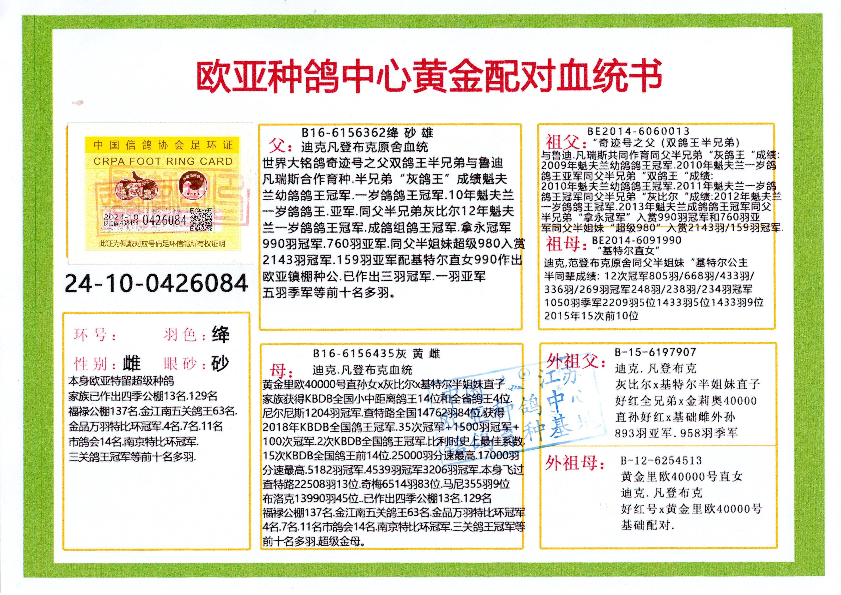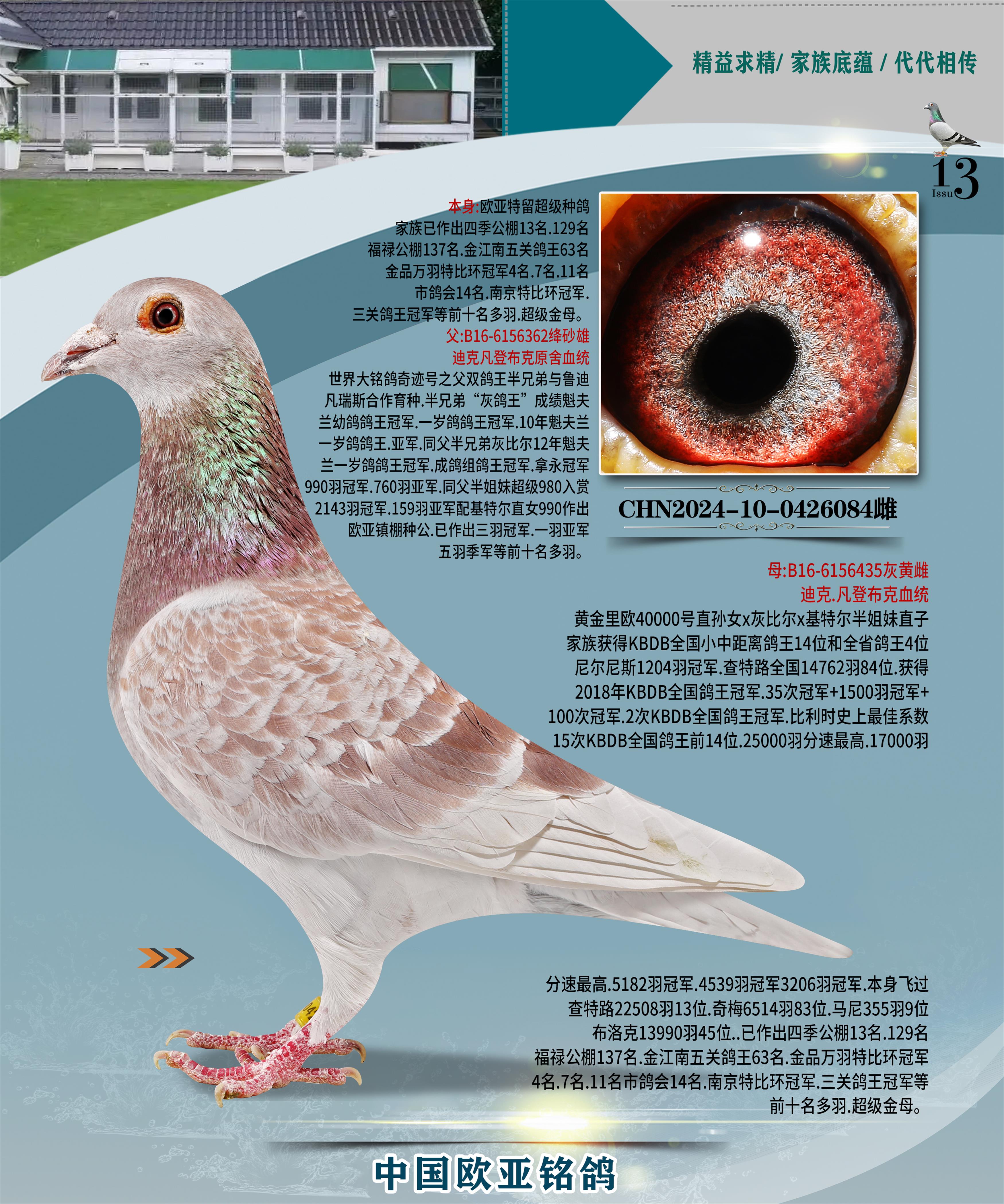 24年秋南京特比环欧亚荣获大团体冠军.小团体冠军551公里大特比13名.14名.16名.19名.20名.21名.24名.26名.27名.28名.42名.52名.54名.57名.65名.66名.68名.70名.71名.72名.74名.76名.80名.82名.83名.84名.85名.86名.90名.92名.110名.116名.121名.122名.128名.131名.158名.161名.164名.165名.166名.172名.174名.177名.182名.195名.196名.201名.205名.208名.210名.216名.253名.269名.275名.276名.294名.296名.299名,,24年秋云南天南铜都公棚决赛415名.天南铜都小棚决赛409名.云南玉活公棚决赛102名.490名.团体32名上笼二羽进二羽,天南铜都大棚506公里决赛445名。热烈祝贺河北省巨鹿县李兰生老师用欧亚泰山号血系连续十一年夺冠军,河北省国家赛冠军.全国季军等多次前十名高位,扬州王军王总用欧亚利奥24年春季获山东翔宇公棚决赛33名盖比53名。南京刘正龙刘总用欧亚盖比获得24年秋山东潍坊国际公棚决赛42名.精英赛30名.三关鸽王71名.决赛86名.加站赛16名.南京市特比环A组鸽王9名.B组鸽王5名.6名.C组鸽王5名.精英赛冠军4名.技能赛A组冠军4名.5名.秦淮区特比环荣获15名.46名.48名.87名。四川西昌徐亮徐总用欧亚利奥获得凉山州聚友决赛177名.第二关亚军双关鸽王19名.三关鸽王105名.云南豪庭公棚决赛603名。热烈祝贺24年四川重庆翔园鸽舍用欧亚泰山号荣获春季400公里冠军.秋季500公里冠军,河北王总用詹森X利奥获得千羽千翔公棚400公里冠军,广东蔡楷焕荣获24年秋爱好者 赛鸽俱乐部三关鸽王季军.一关420公里99名.二关450公里11名.三关520公里32名.单关季军.7名.12名,江西李卫兴荣获贵州红枫公棚8名.共翔俱乐部寄养棚四关综合鸽王30名.一关400公里78名.二关500公里55名.三关520公里37名.四关500公里57名.同父母获公棚18名.雷鸣获得武汉黄浦育翔中心冠军,四川陈文获得四川明鸿俱乐部300公里梦幻2名.3名.4名.9名.10名.13名.14名.15名.31名.34名.40名.41名.42名.43名.69名.71名.72名.73名.74名.94名.95名.97名.98名.99名.419公里决赛荣获总冠军7名.总共归巢9羽,四川徐亮获豪庭决赛603名,山西郑勇获得山西泰鑫公棚决赛255名詹森红狐,热烈祝贺马总获得开尔(飞跃队)决赛9名获奖金1310000万元.第一关52名,天津津福资赛180公里96名.获奖金429543万元,欧亚支持全国鸽友24年秋多人报喜 祝大家取得更好成绩,给欧亚报喜鸽友欧亚决定给每人赠送一羽超级种鸽。欧亚俱乐部特比环多关鸽王成绩:15年秋淮安特比环黑色星期一全会上笼9700多羽,当天无鸽归巢,第二天全会归巢357羽,本舍归巢158羽.前十名八羽.前一百名归巢57羽,16年春季获五关鸽王总冠军,总亚军四名.六名.七名.九名.十名.晶艺俱乐部520公里冠亚季军5名.6名.7名.9名.11名等,火车头冠军.季军6名.8名.9名.10名,16年秋晶艺俱乐部特比环520公里亚军.季军4名.6名.7名.9名,15年春南京白下特比环冠军.亚军.季军6名.7名.8名.9名.10名.指定鸽A B组获得冠军.亚军.季军4名.5名.,17年淮安特比环亚军.4名.5名.7名.8名.10名.六关鸽王总冠军.4名.6名.9名.10名,寄养棚宿迁刘总20羽特比环获冠军.季军.4名.7名.8名.9名等。18年荣获万羽特比环六关鸽王总冠军.总亚军.总季军.6名.8名.十名.单关四羽冠军.二羽亚军.四羽季军.前十名27羽。19年秋万羽特比环六关鸽王总亚军.总季军.5名.8名等,单关二羽冠军.三羽亚军.一羽季军前十名31羽。20年秋淮安市鸽会四关特比环大赛风雨无阻鸽王亚军.鸽王六名,金品俱乐部万羽特比环六关鸽王总冠军,总亚军.四名.五名.六名.七名.八名.十名.前二百名鸽王35羽,单关冠亚季军前十名四十多羽,火车头五关鸽王季军.六名.八名.前二百名鸽王十七羽。20年春荣获淮安五区一市四关鸽王总冠军.亚军.四名.八名.九名。21年秋荣获金品万羽特比环大赛六关鸽王总亚军.总季军.四名.七名.九名.十名.单关冠亚军季军前十名三十多羽。火车头协会鸽王六名.七名.十名.单关前十名十七羽。22年秋荣获鸽王总冠军.总亚军.5名.7名.8名.9名.11名.单关冠亚季军前十名三十多羽,第一关单关前二百名四十多羽,第二关前二百名三十多羽,第三关前二百名四十多羽,第四关前二百名四十多羽,第五关前一百名53羽。23年秋荣获鸽王季军.五名.八名.十名.13名.17名.20名.27名等多羽鸽王.单关前十名二十多羽。公棚.寄养棚部分成绩:16年秋宁夏黄河公棚总冠军电脑戈马力指定通炮冠军,17年送八羽参赛获得鸽王八名进奖四名,支持韩总荣获八名。支持鸽友荣获宁夏中卫公棚决赛总冠军.精英赛冠军,支持18年宁夏黄河公棚决赛冠军詹森X泰山。安徽鼎博寄养棚院内外四关鸽王总冠军.鸽王十七名.三十七名同窝,鸽王39名.42名.58名.67名。18年山东公棚预赛冠军.决赛65名.送八羽进奖五羽.指定获奔驰汽车一辆。支持鸽友获得云南蓝云公棚冠军.盖比X佛卡门。支持鸽友荣获云南银集公棚决赛冠军 詹森427X520血系 速度赛6700羽冠军。17年荣获金马俱乐部寄养棚四关鸽王总冠军.季军.六名.八名.第一关冠军.亚军.季军四名.七名.十一名.金牌教练奖。支持鸽友18年北京费翔公棚预赛九名电脑X桑杰士,支持鸽友荣获陕西威力公棚决赛11名.内蒙古临河寄养棚四关鸽王六名.詹森配泰山,支持河北王总用欧亚詹森427配胡本喜获20年秋开尔青年棚季军。云南东荣公棚16年预赛冠军.决赛77名.17年决赛12名.詹森红狐X泰山,17年平安公棚决赛4名 詹森427。欧亚获得21年金母寄养棚第一关四名.第二关5名.第三关5名.6名.7名.10名.三关鸽王总冠军,四关鸽王14名.十羽鸽王。支持河