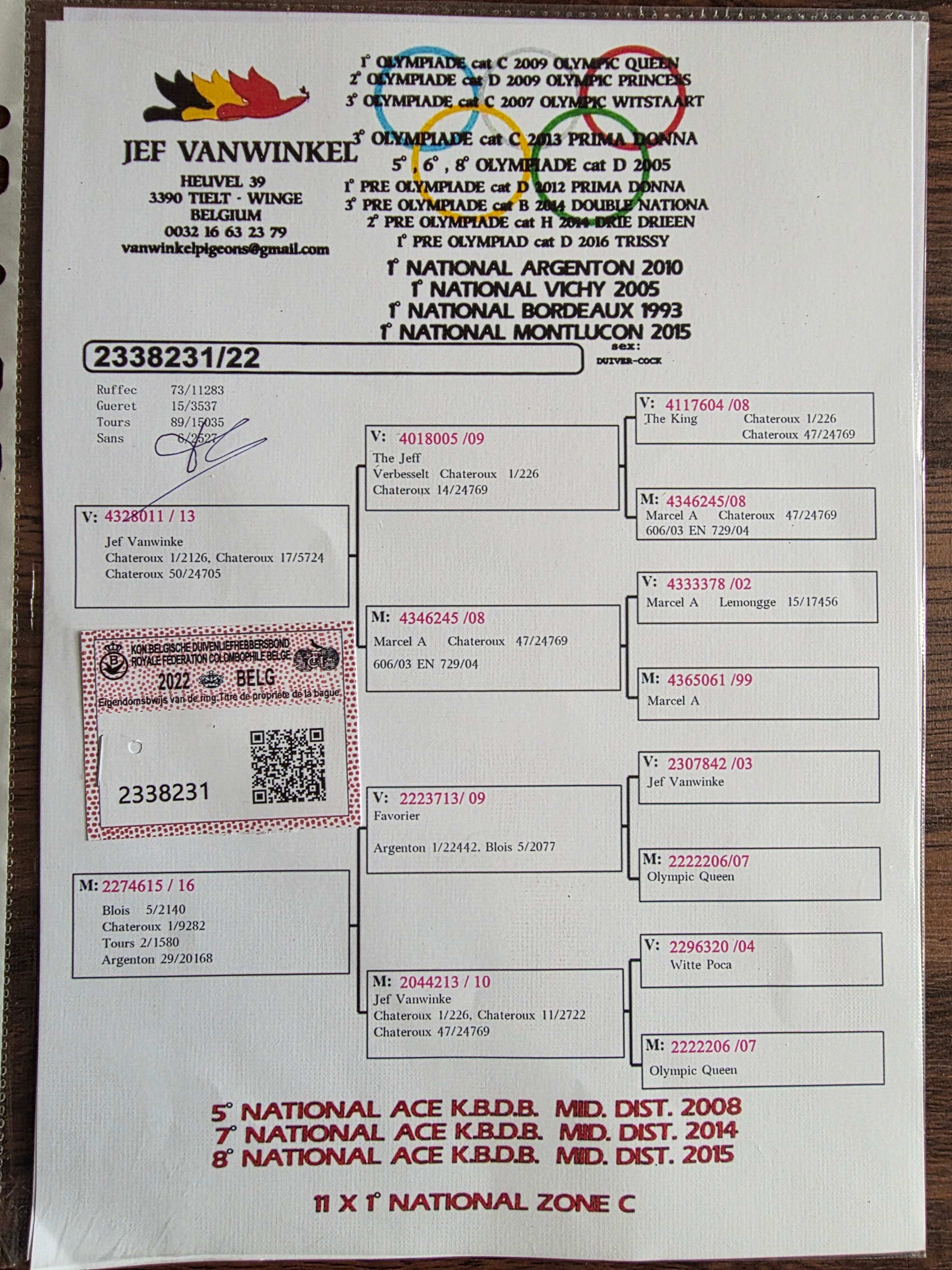 血统:杰夫·凡温克皇后号回血鸽-喜爱号孙代