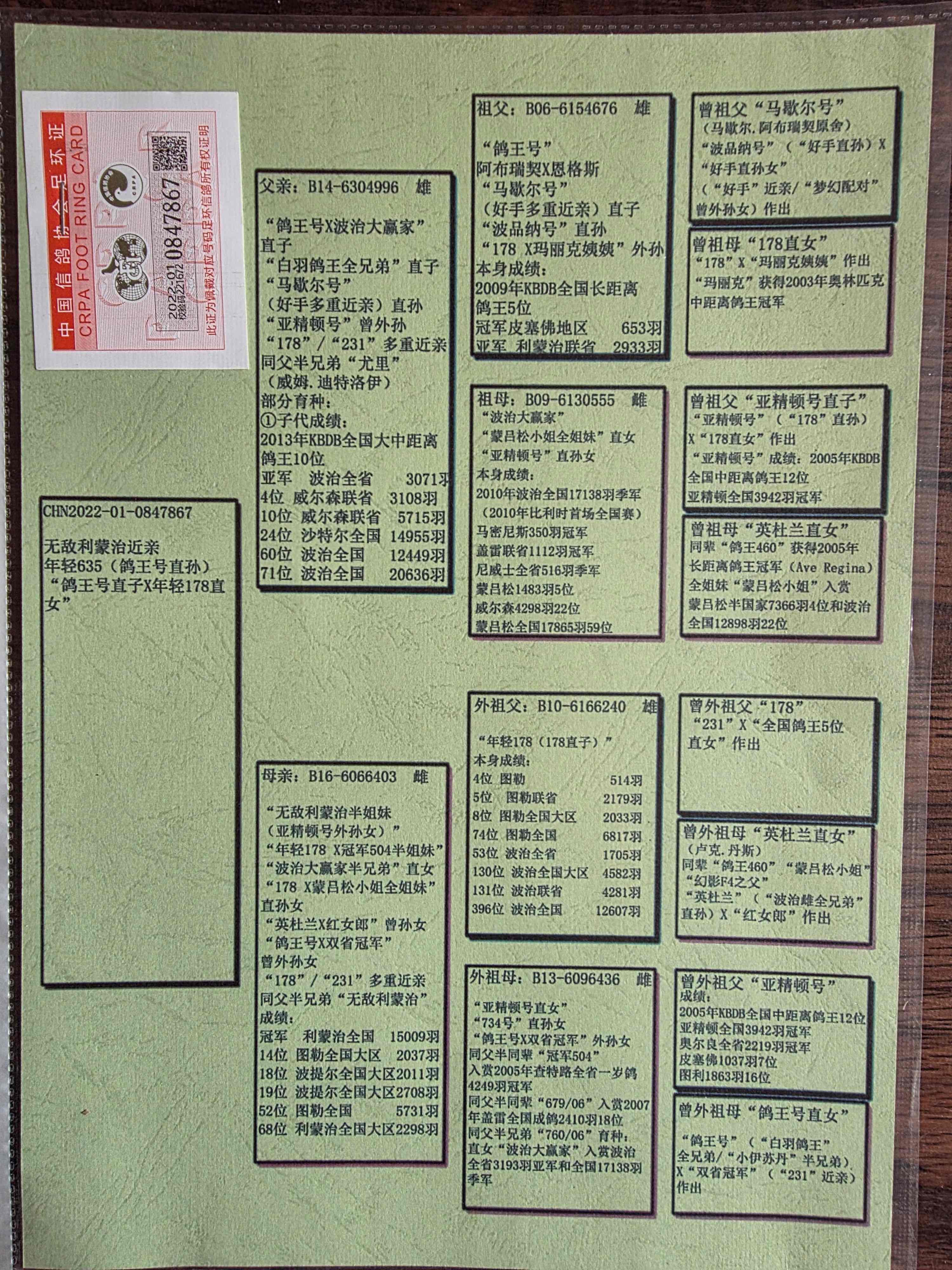 - 当前查看拍卖鸽:血统:无敌利蒙治近亲(年轻635-鸽王号