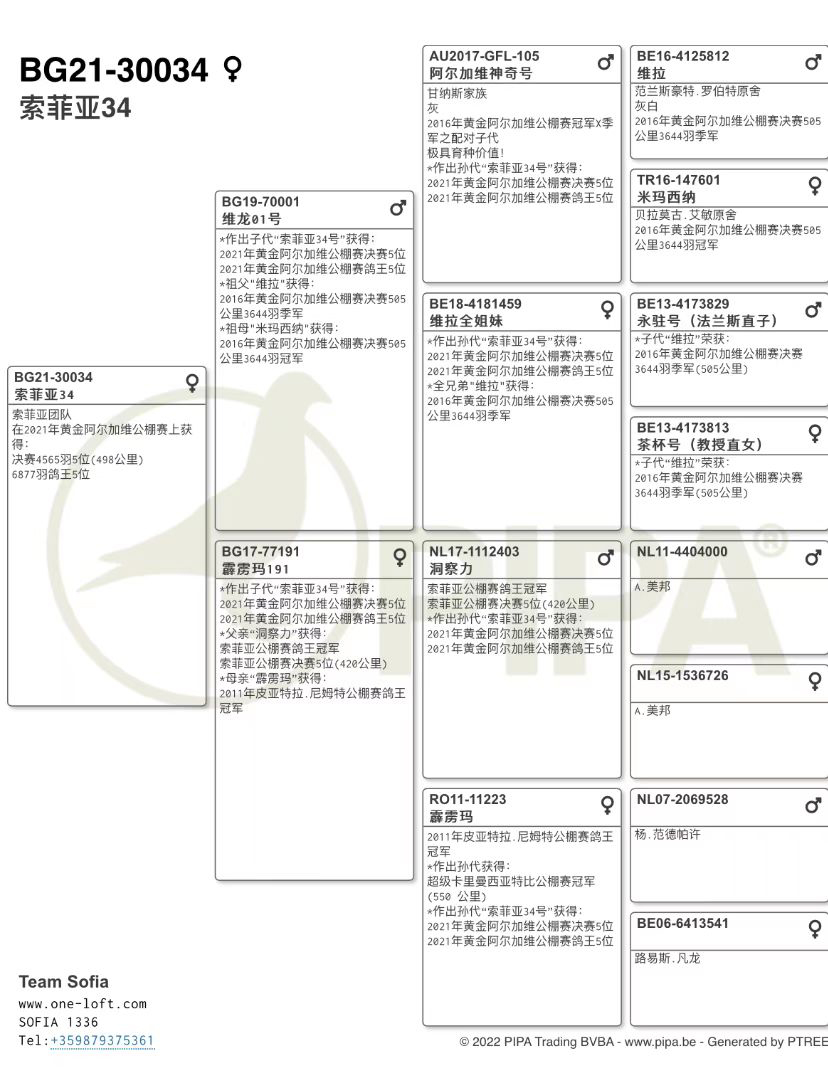 霹雳玛191 *作出子代“索菲亚34号”获得:2021年黄金阿尔加维公棚赛决赛5位 2021年黄金阿尔加维公棚赛鸽王5位 *父亲“洞察力”获得: