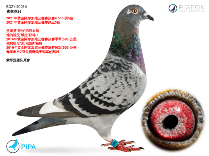 索菲亚 公棚赛鸽王冠军 索菲亚公棚赛决赛5位(420公里)*作出孙代“索菲亚34号”获得:2021年黄金阿尔加维公棚赛决赛5位 2021年黄金阿尔加维公棚赛鸽王5位