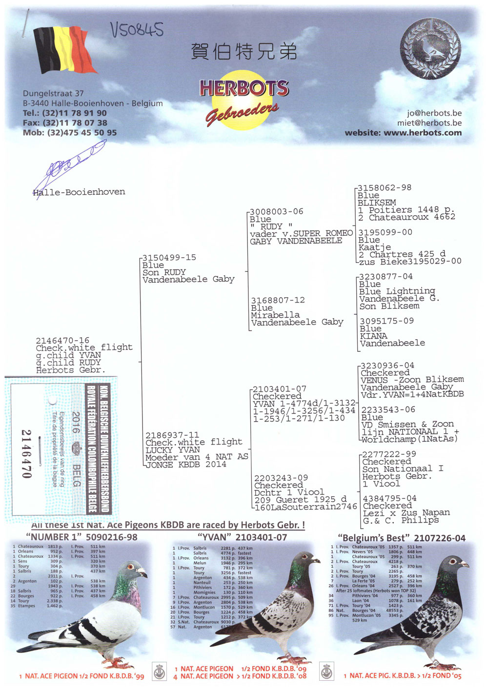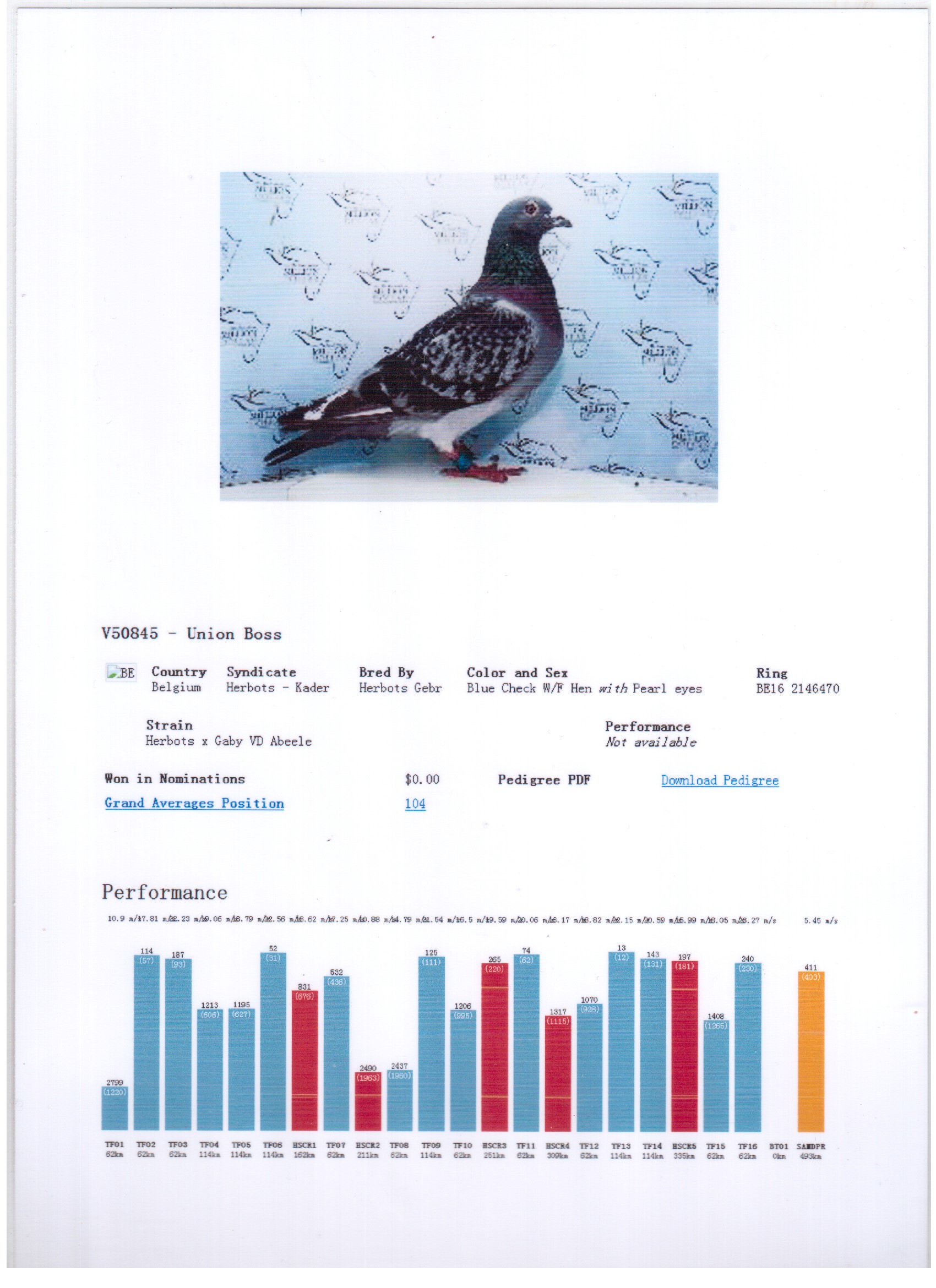 鲁迪 盖比.凡德纳比原舍 灰 顶级种公&赛将,荣获:波提尔全省1687羽14位 亚精顿全省2401羽18位 波治全省 1279羽19位 亚精顿全省5134羽28位 杜尔斯全省2791羽76位 *子代佳绩:KBDB全国长距离一岁鸽王冠军 图勒全国11707羽最高分速 盖雷全国最快鸽亚军 布洛瓦全省幼鸽3080羽4位